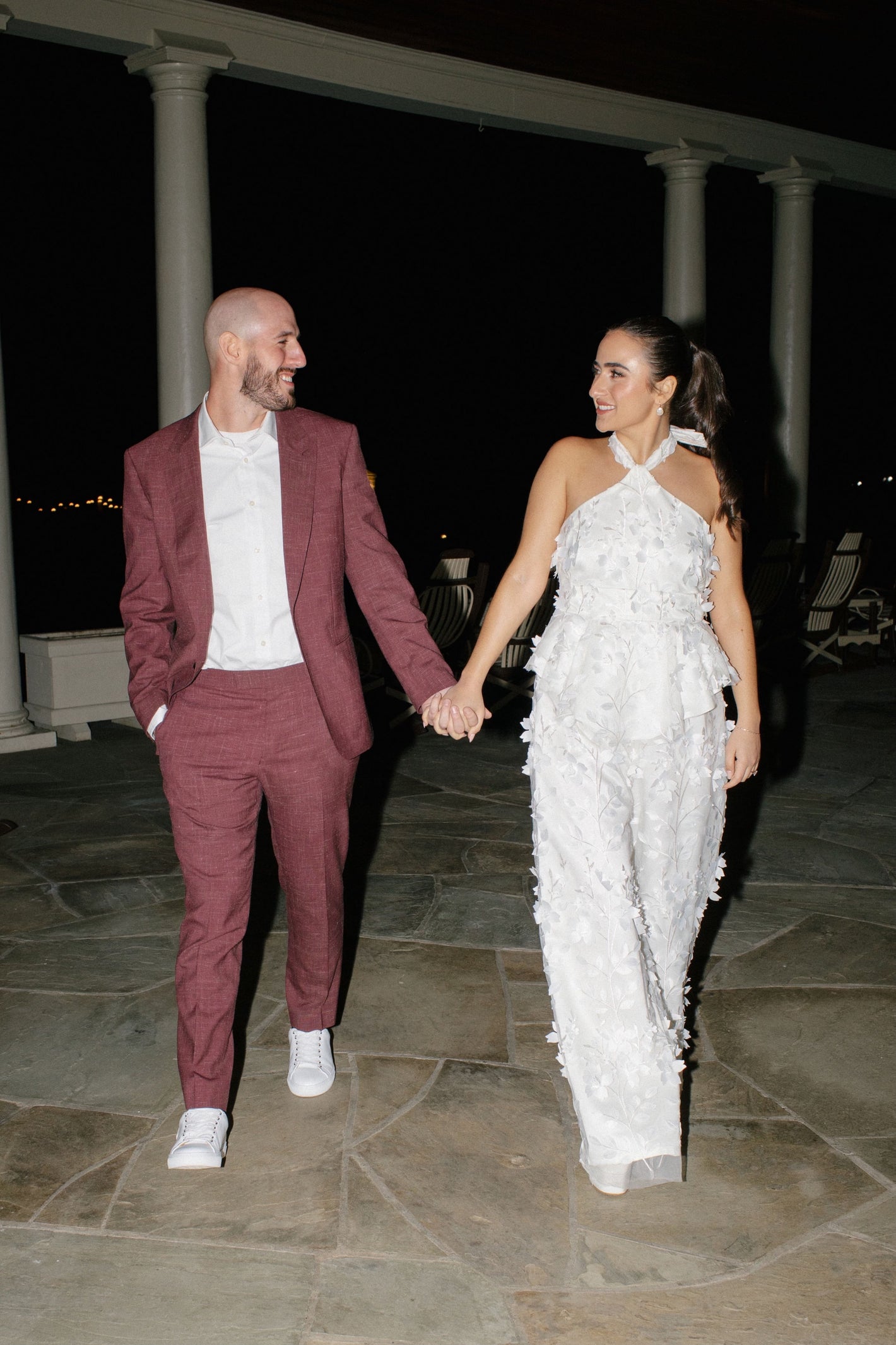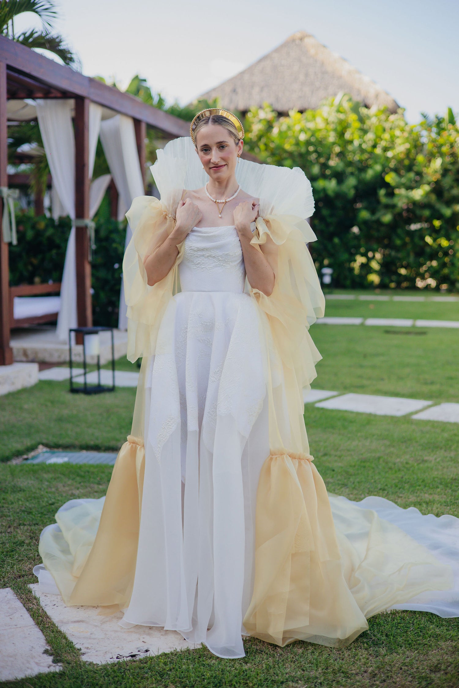 I saw @madisonchamberlain_ on tiktok and figured if anyone could grasp the Disco Anne Boleyn idea it would be her. I said BIG, GOLD , EDITORIAL HIGH FASHION DRAMA, HUGE, did I mention gold? also did i mention this wedding is happening on a humid Caribbean island so it also somehow has to be light weight? Also did I mention ENORMOUS AND DISCO GOLD? When I tell you girl did not even blink— just “see you in Philly for a fitting” (yes I had to take another decadent trip where I lugged my gown up from florida just to get this custom fitting normal behavior). I loved this piece so much I scrapped my original after party outfit idea and bought a basic little white slip dress from target so I could put the cape back on for the 2nd round revelry, which was definitely my second best cape related decision altogether. The first, of course, was asking Madison to make it