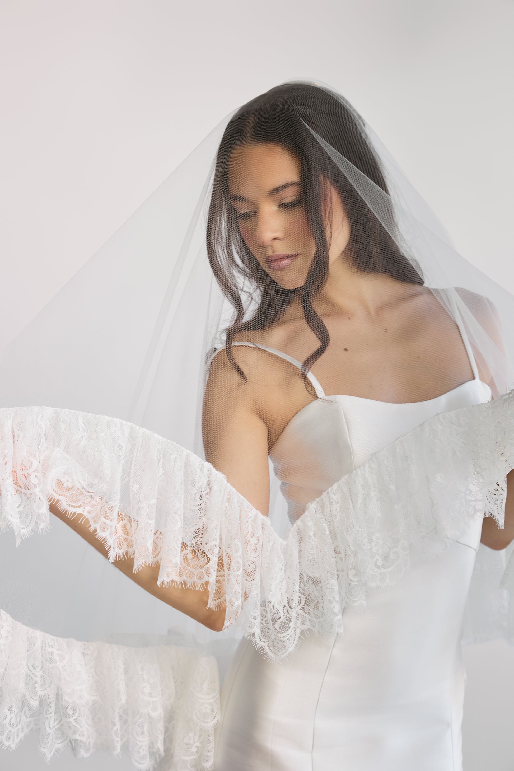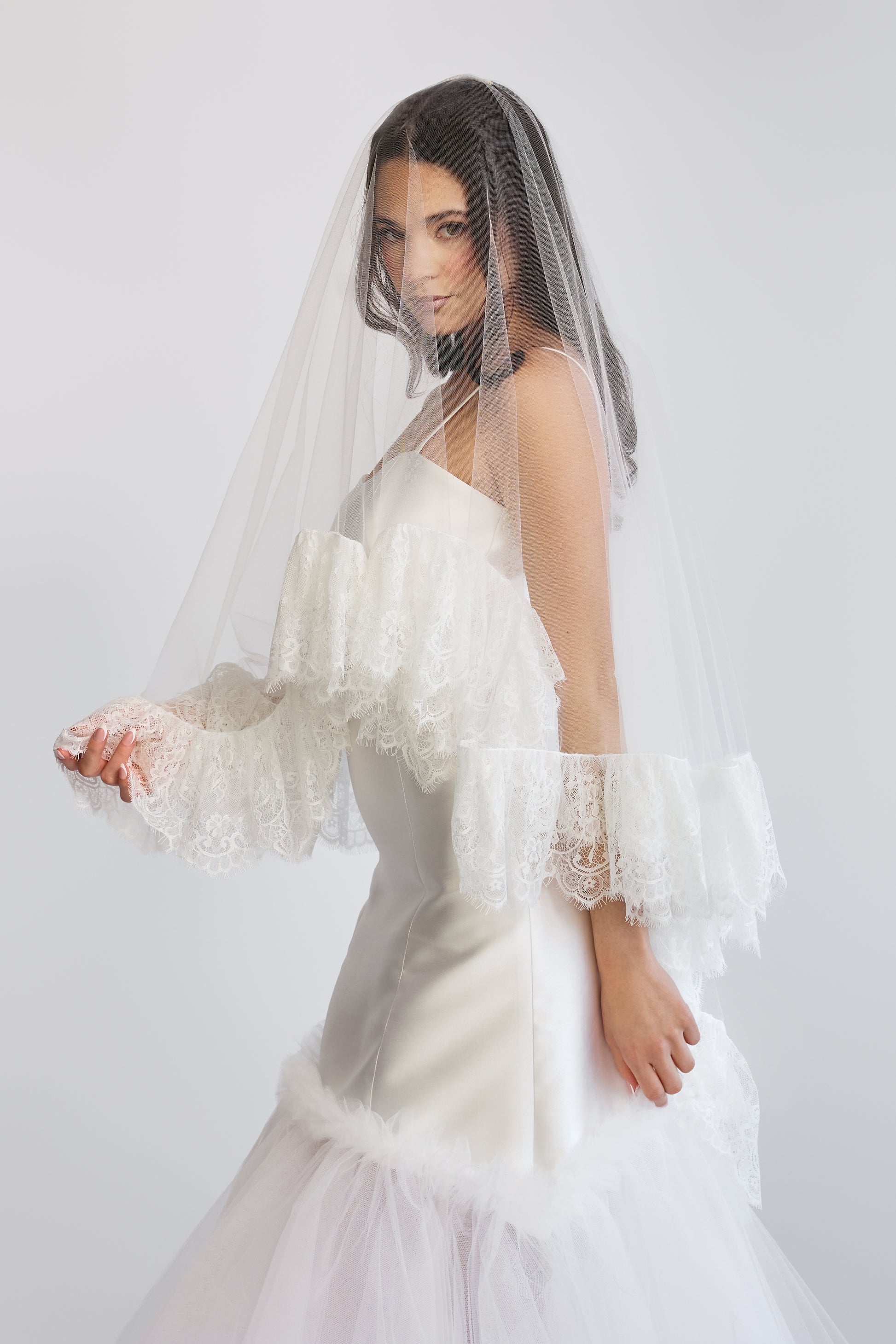The Sweetheart Veil is seriously the cutest! When the blusher is flipped back and you pull your arms in, it creates the cutest heart shape! The blusher is 30" and the back of the veil is 45" long. When the veil is fully collapsed in the back it creates a wonderful textured drape. Lace ruffle and tulle base.