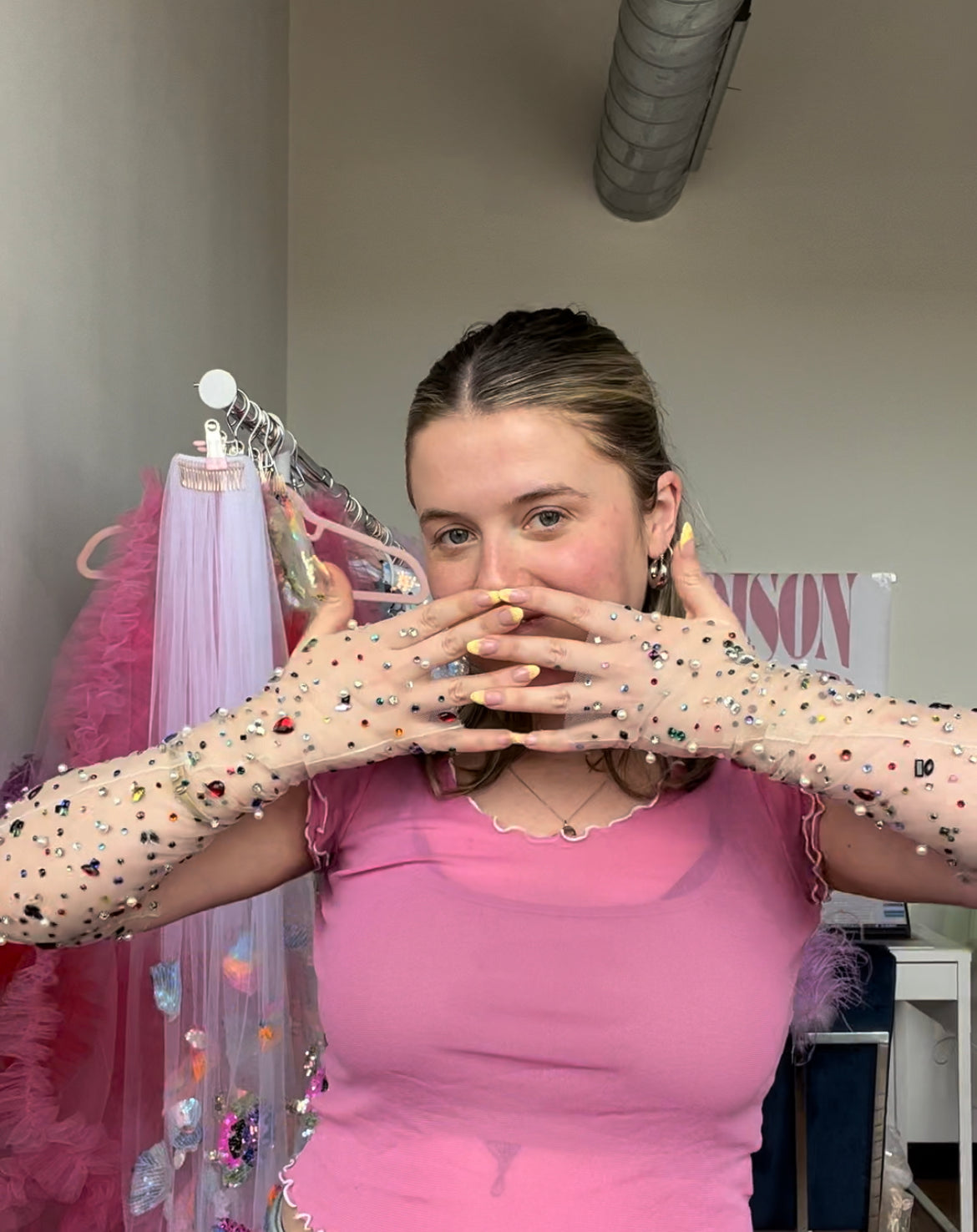 The Bejeweled Gloves rein supreme. They are fingerless with a thumb hole so you can still show off your nails and eat your pizza without having to take them off! All gloves are made-to-order, please allow 1-2 months after placing your order. We can wait to see you in them!