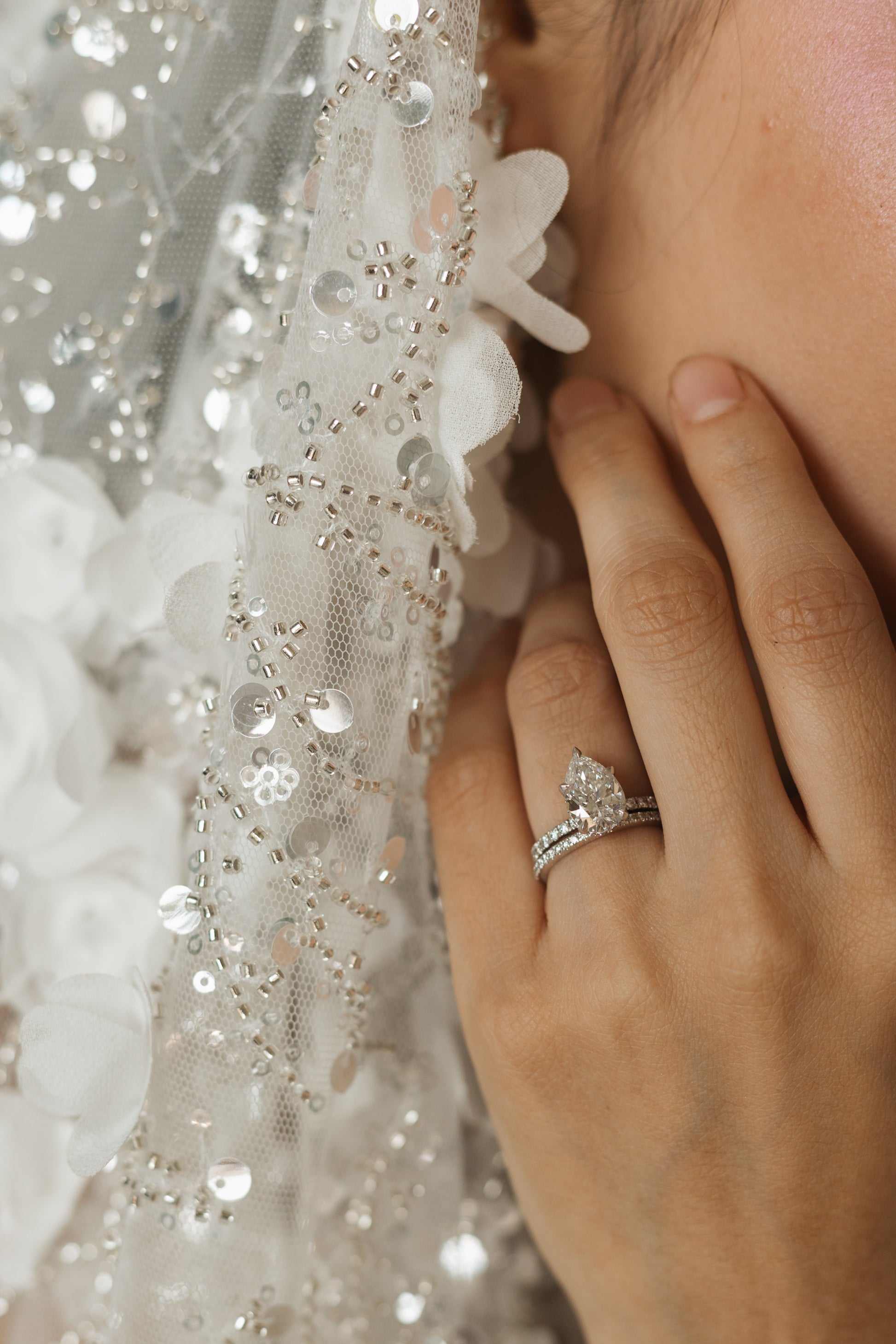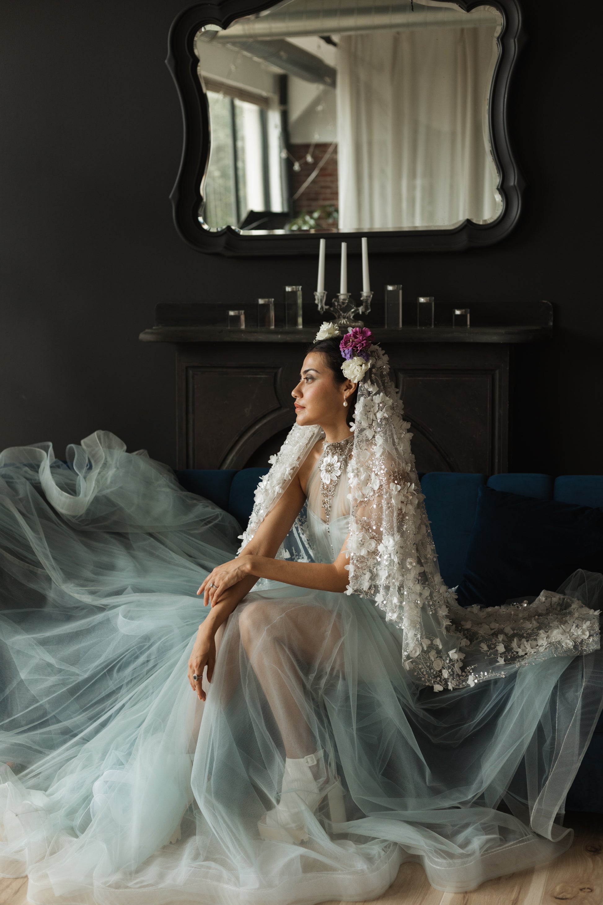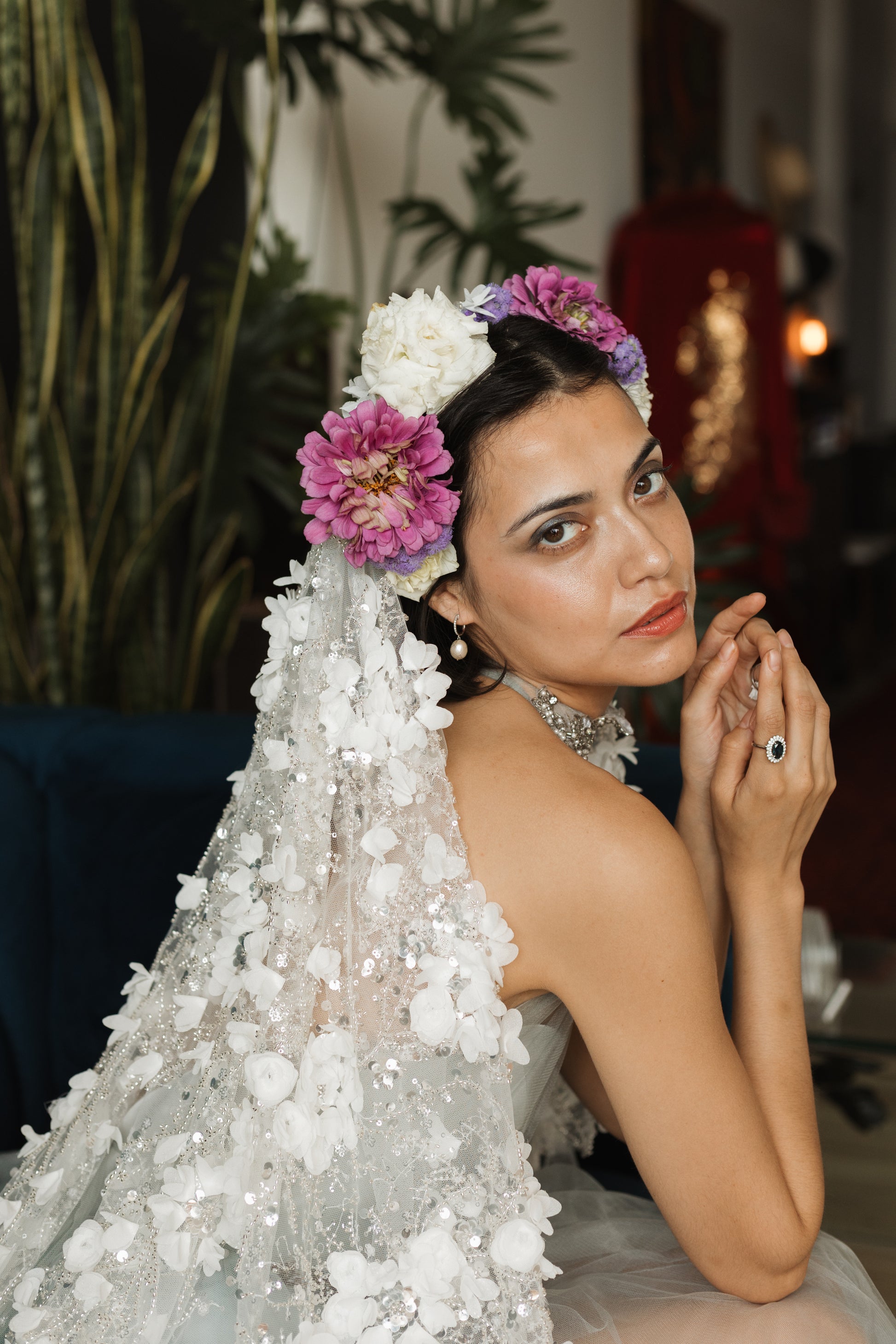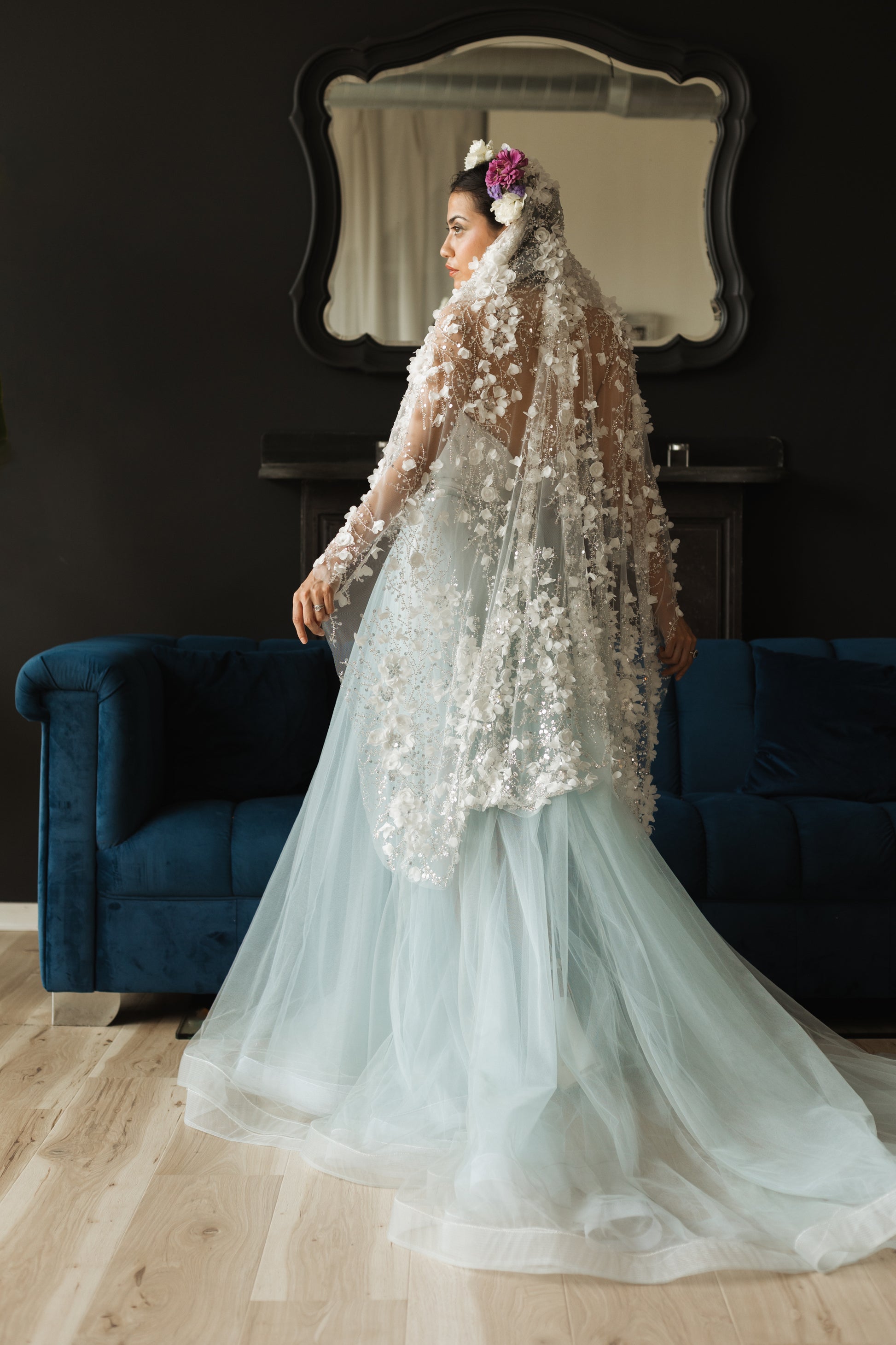 The Bella Veil is for any nearly-wed that has said they want their wedding look to feel whimsical, romantic, and like a fairytale. It is beautifully beaded and adorned with 3D flowers. The Bella Veil is shorter in the front and longer in the back creating a beautiful cascading effect. The length in the back in the Ballet Length.