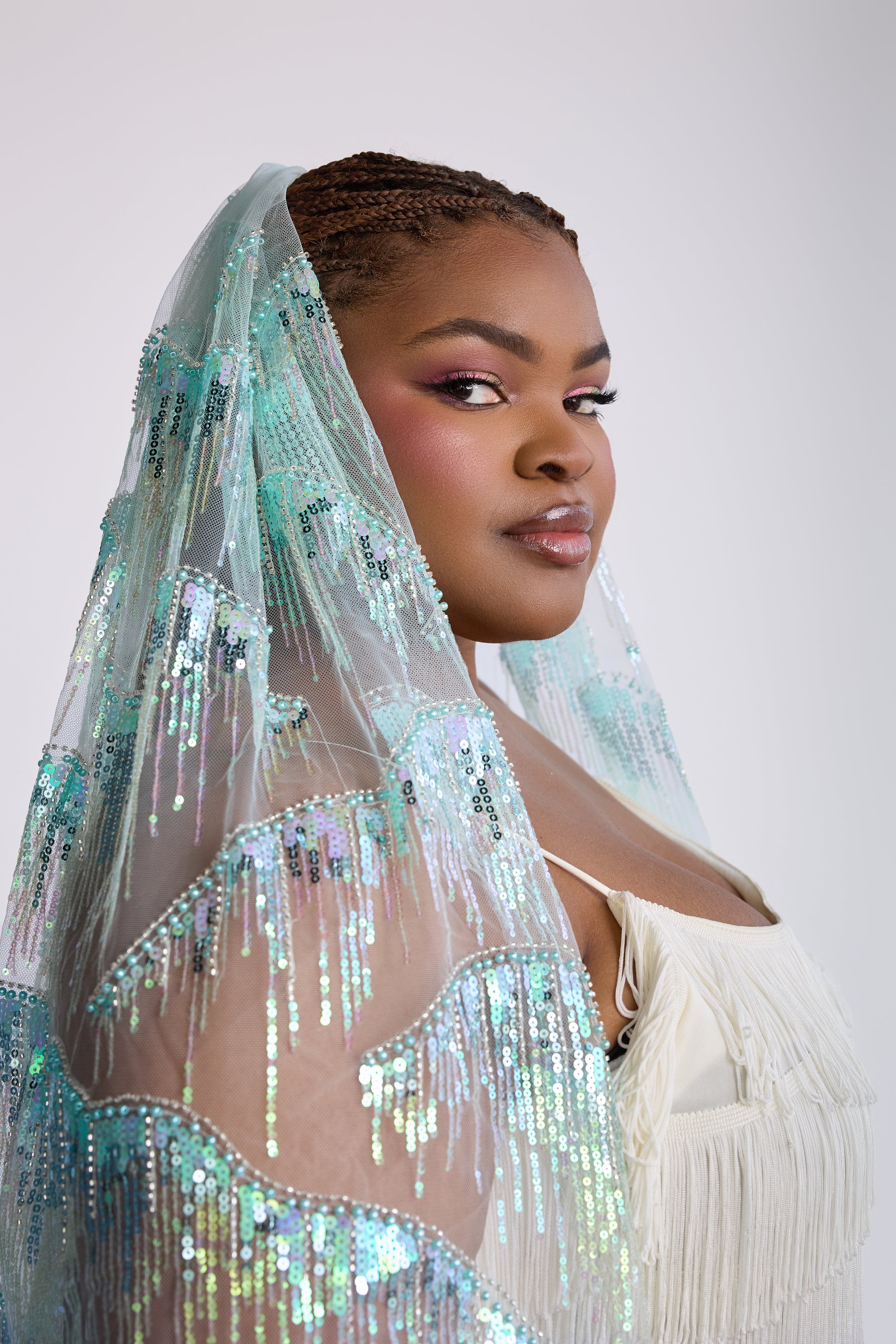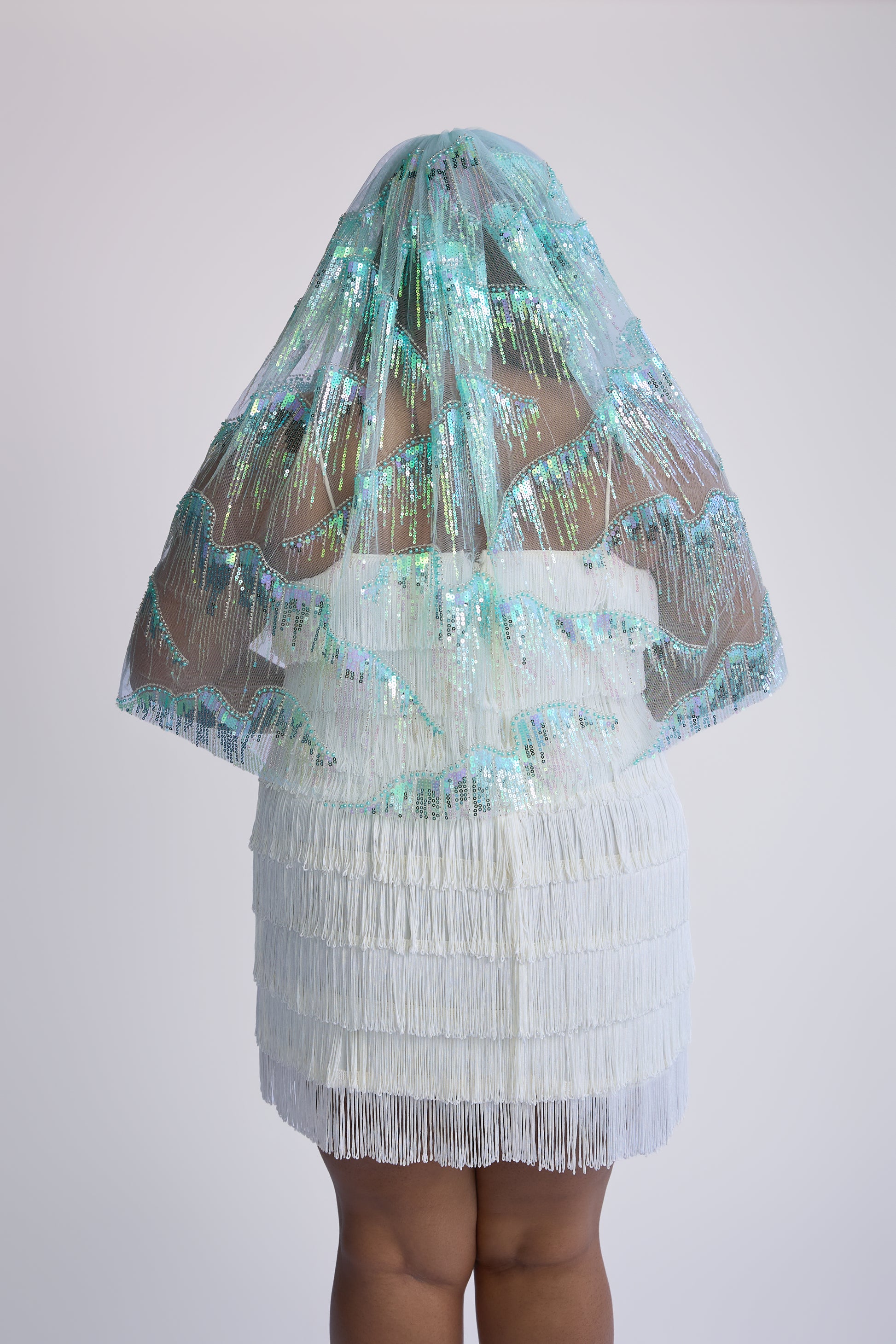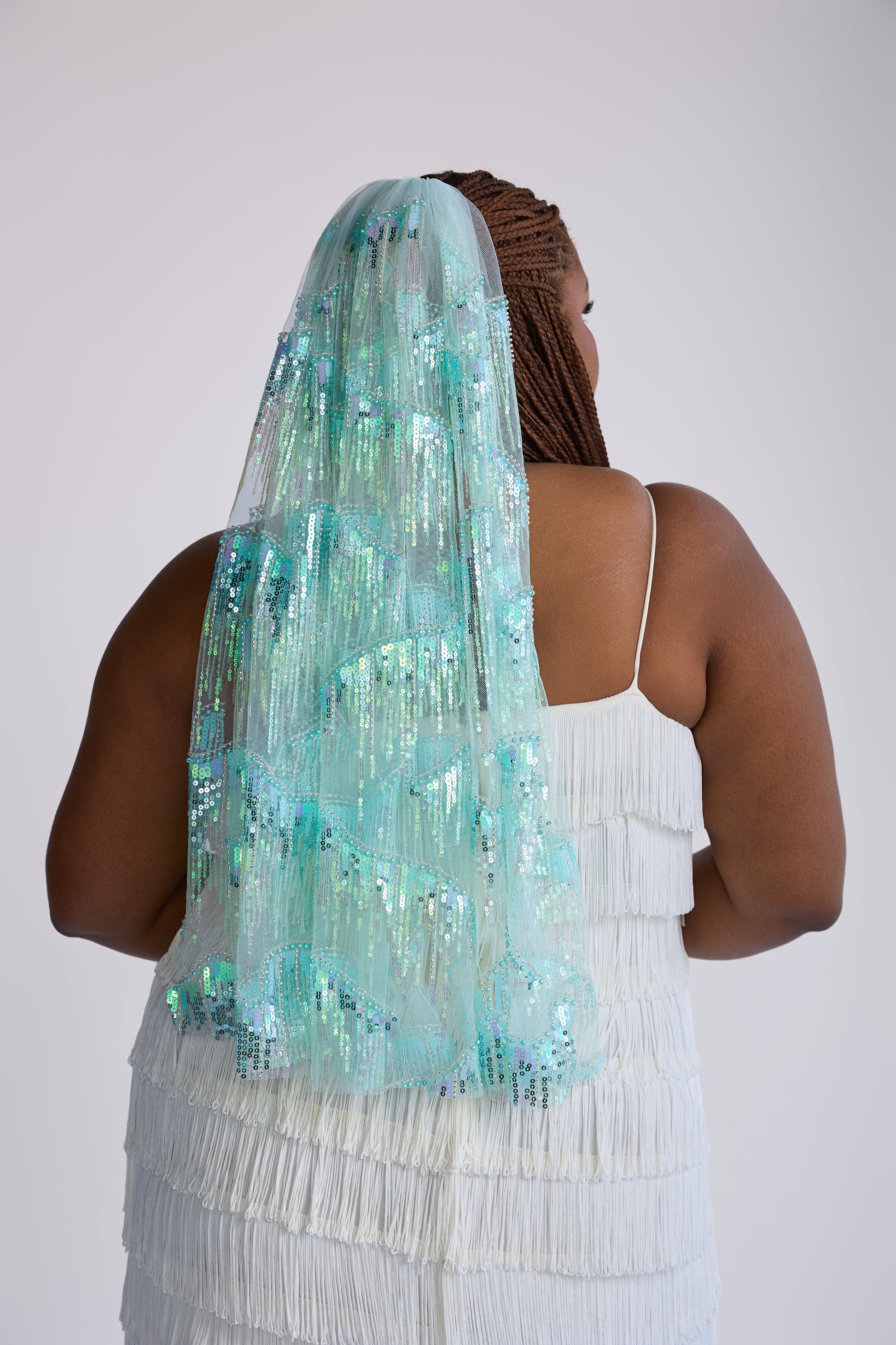 Glide through your day like you're surrounded by a soft, glowing radiance with our Aura Veil, available in pink and blue. Featuring a cloud-like motif of colorful pearls, sequins, and beads that drip delicately, this veil reflects the light and glitters with every movement. Ethereal and enchanting, it adds a touch of heavenly sparkle to your look. Available in all lengths.