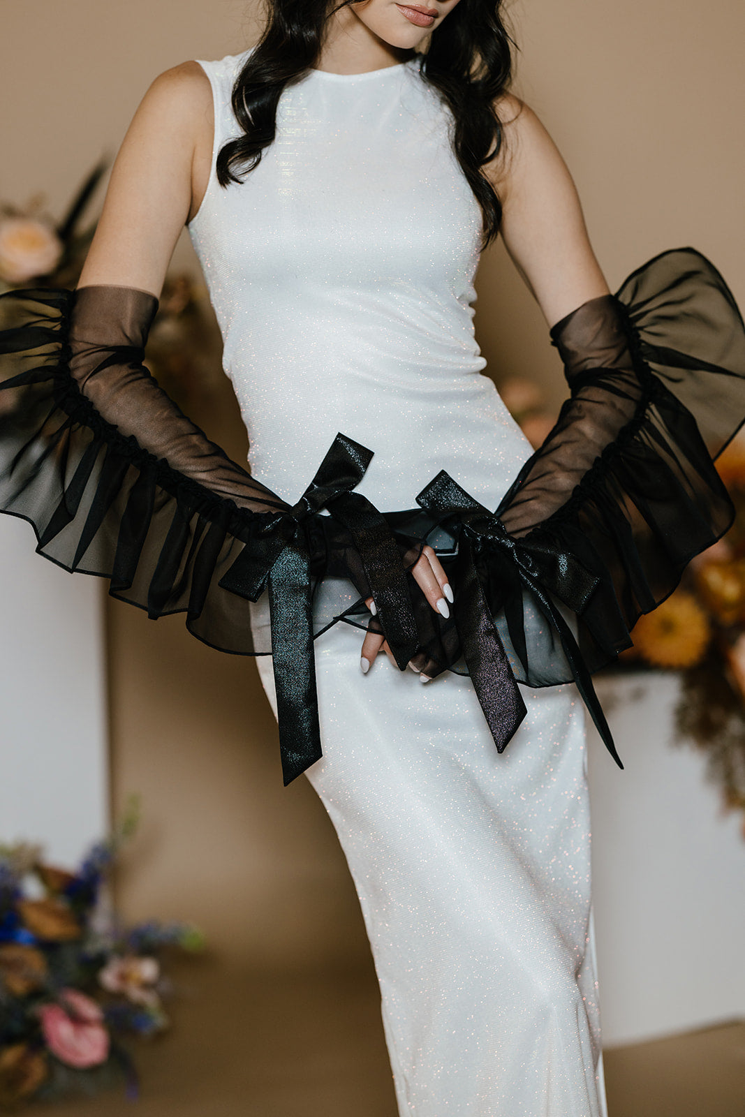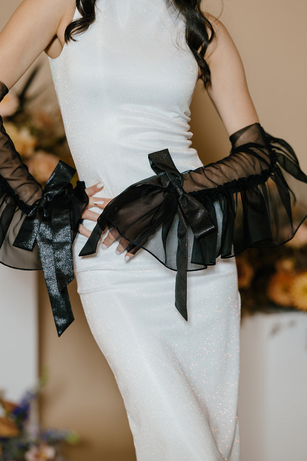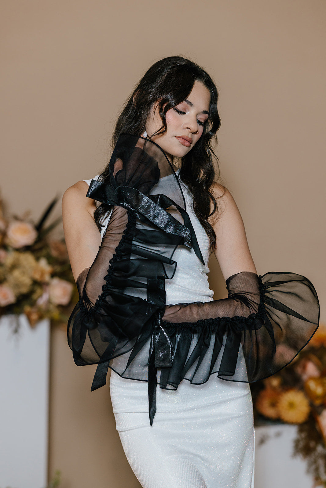 The Chloe gloves are a stunning addition to any look. The gloves are made with a comfy stretch tulle, the ruffles are a beautifully structured organza, and the bows have a lovely metallic shine.