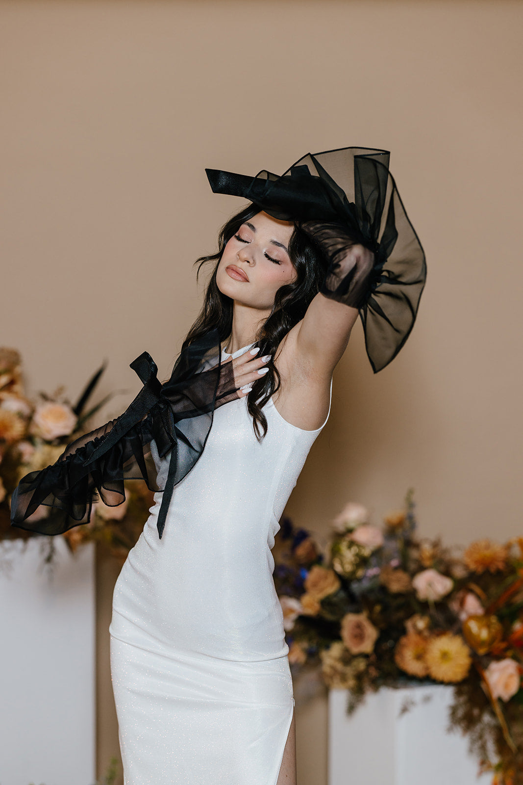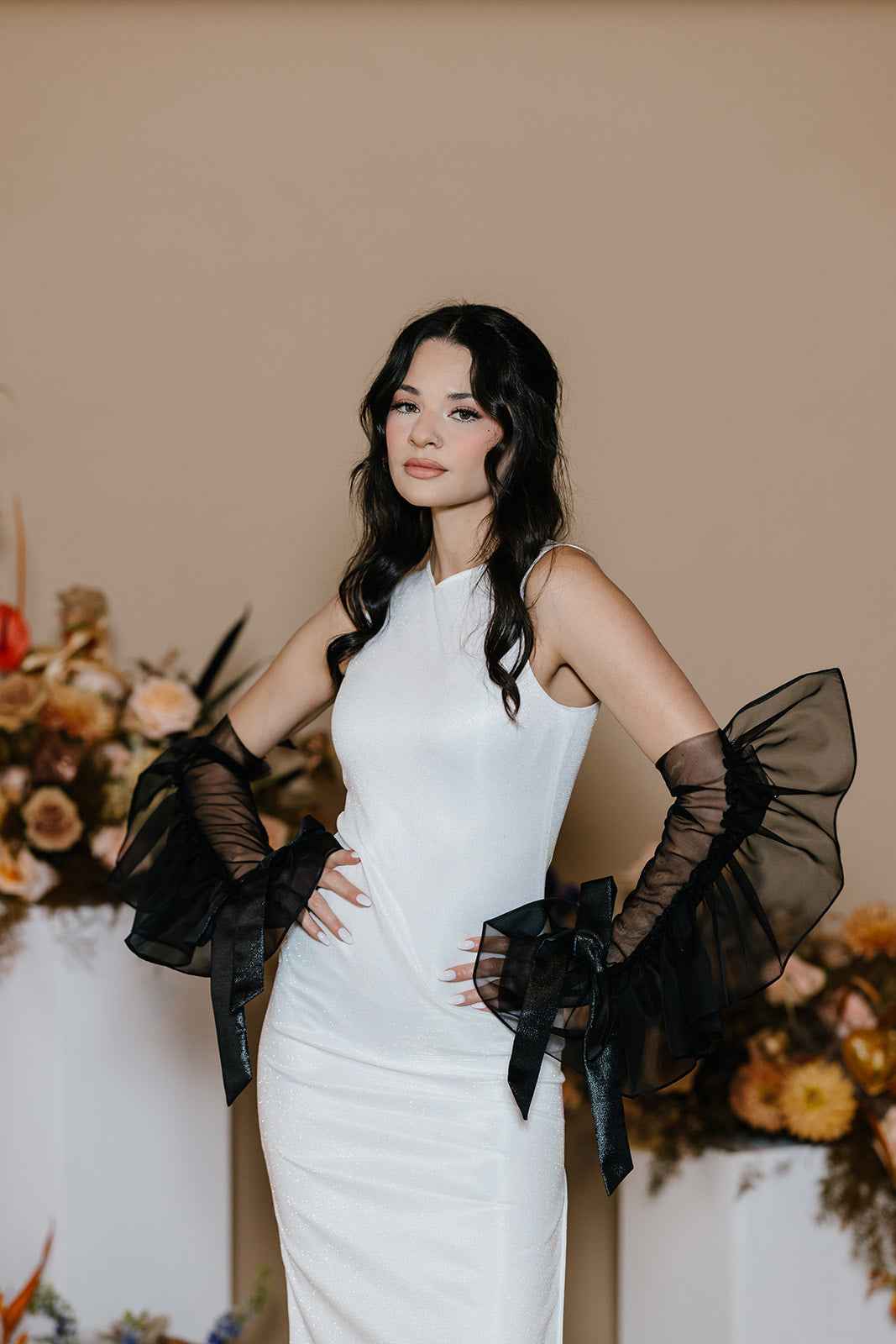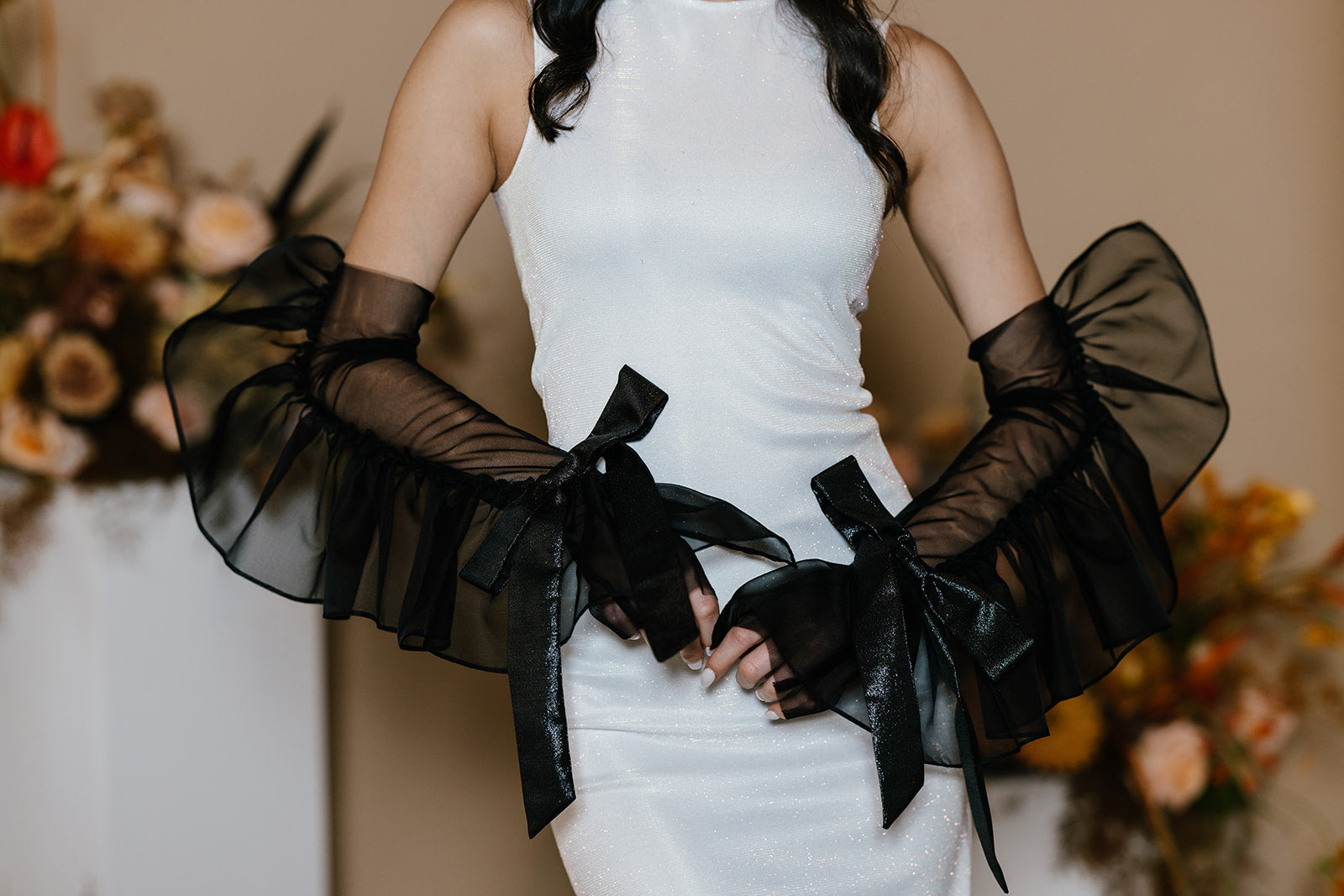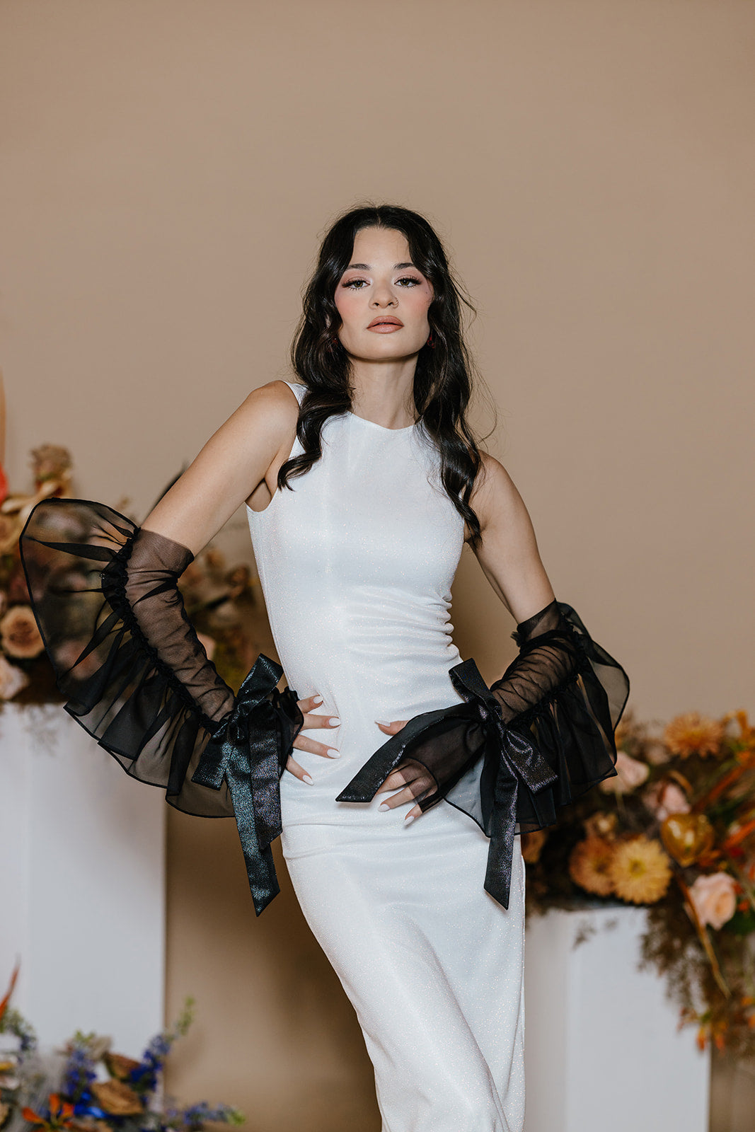 The Chloe gloves are a stunning addition to any look. The gloves are made with a comfy stretch tulle, the ruffles are a beautifully structured organza, and the bows have a lovely metallic shine.