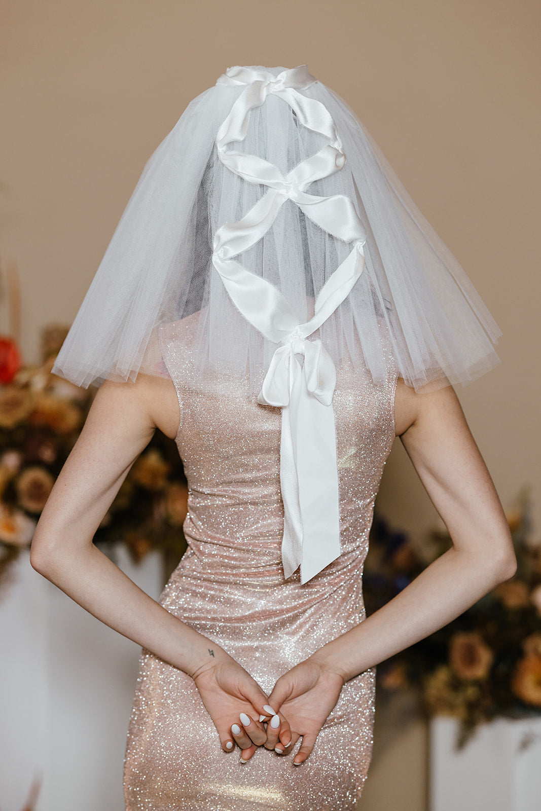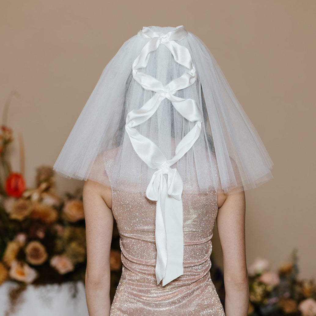 This 18" corset veil may be small but she is mighty! This cutie voluminous tulle veil has a beautiful silk ribbon mimicking a corset with a long tailed bow at the bottom.