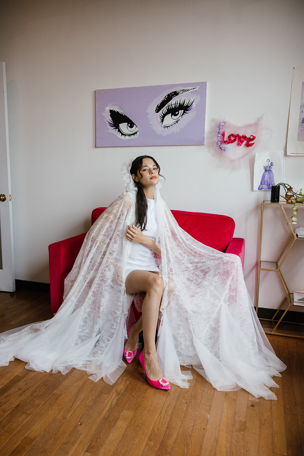 The Darling Veil makes a statement with her beautiful french lace and dreamy godets. It is an ode to vintage veils from the 40's, but it incorporating playful details like the Madison Chamberlain signature tulle heart on the back of the head.