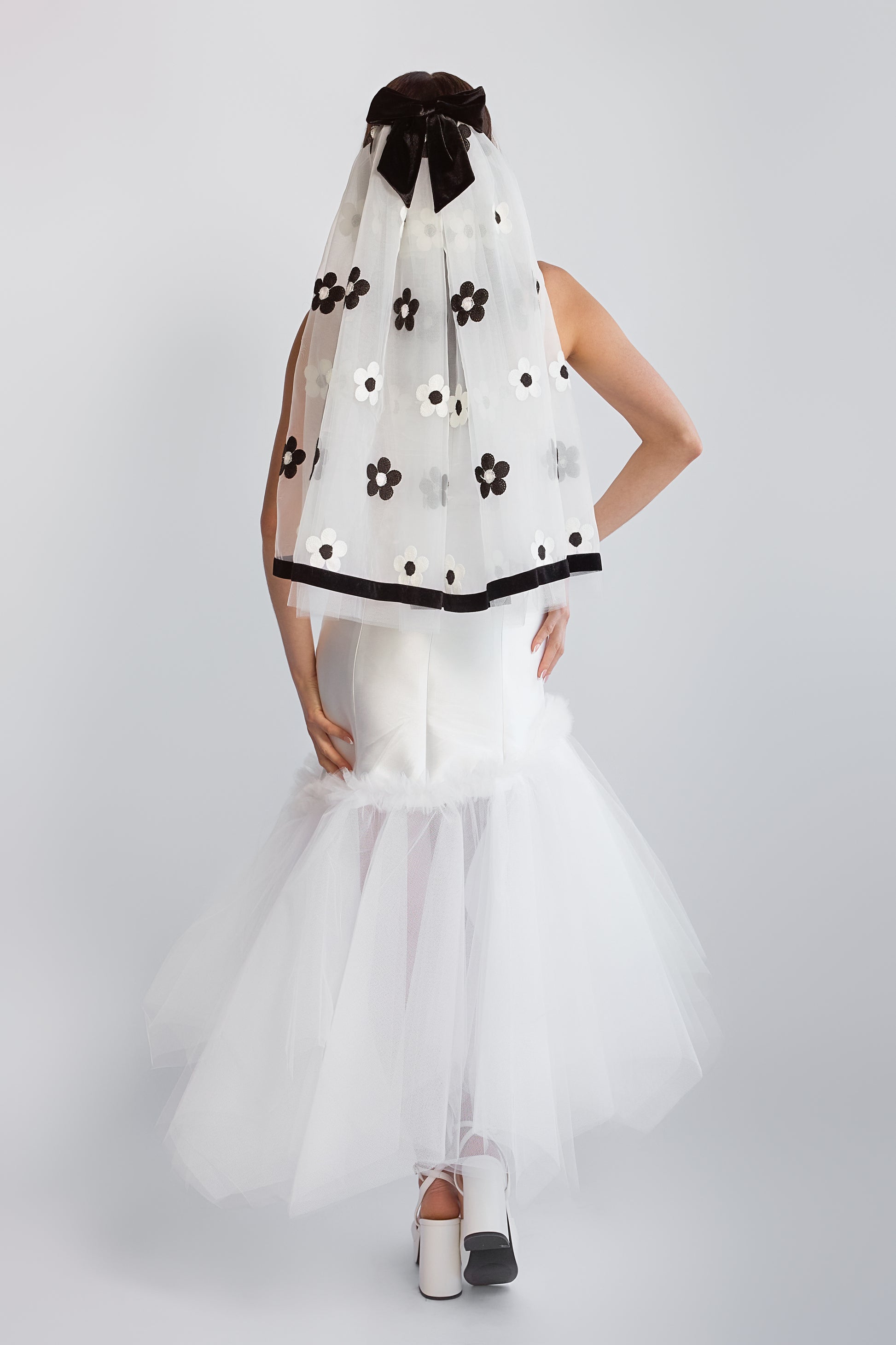 The Dolly Veil is the perfect black and white moment. It has little crocheted flowers on a white organza base with a velvet ribbon bordering the veil. The velvet black bow is completely detachable. It can be worn facing forward or backward or on it's own depending on the wearer's preference. The bow can attach to the wearer's hair or onto the veil with the little hidden clear snaps.