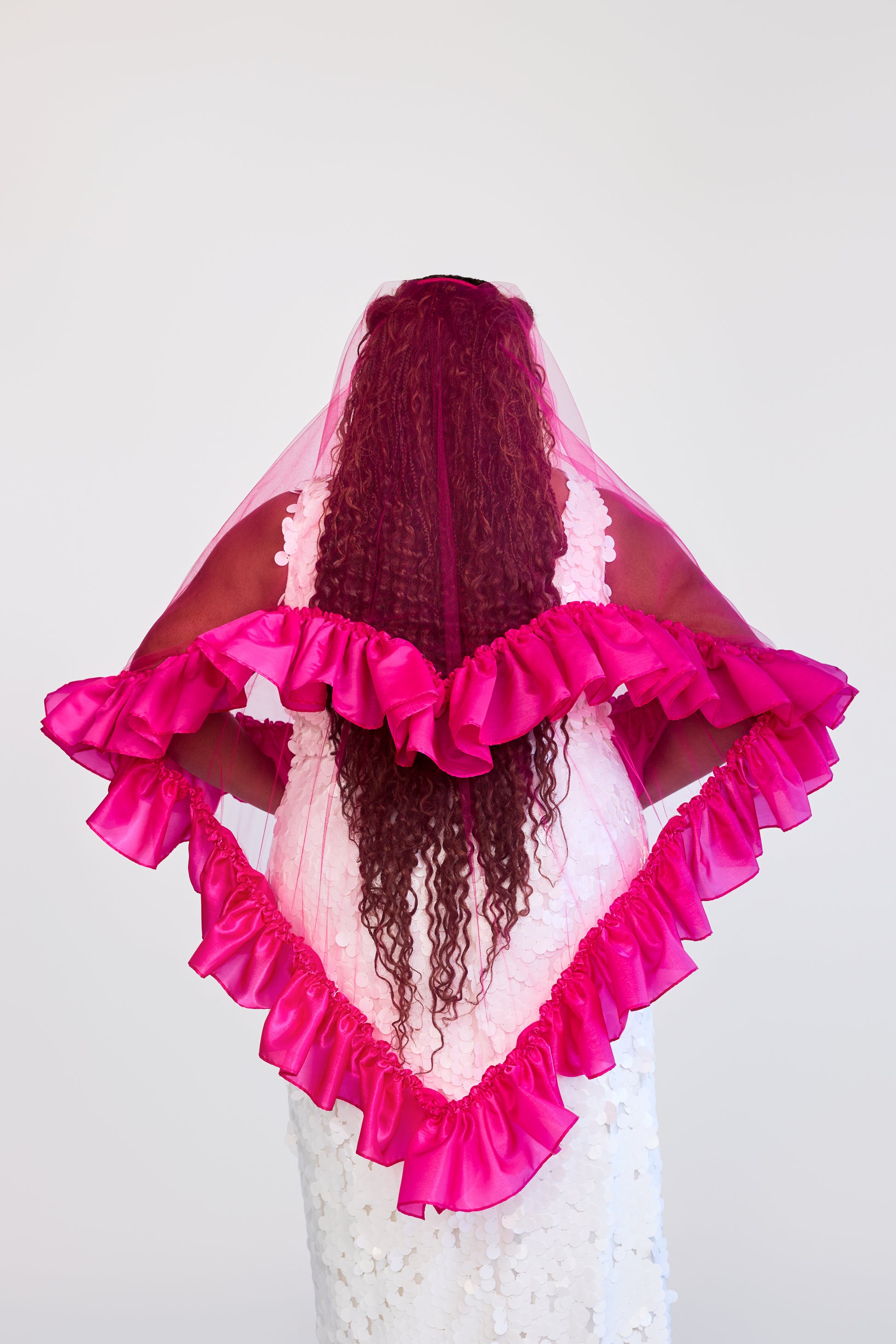 The Sweetheart Veil is seriously the cutest! When the blusher is flipped back and you pull your arms in, it creates the cutest heart shape! The blusher is 30" and the back of the veil is 45" long. When the veil is fully collapsed in the back it creates a wonderful textured drape. Satin ruffle and tulle base.