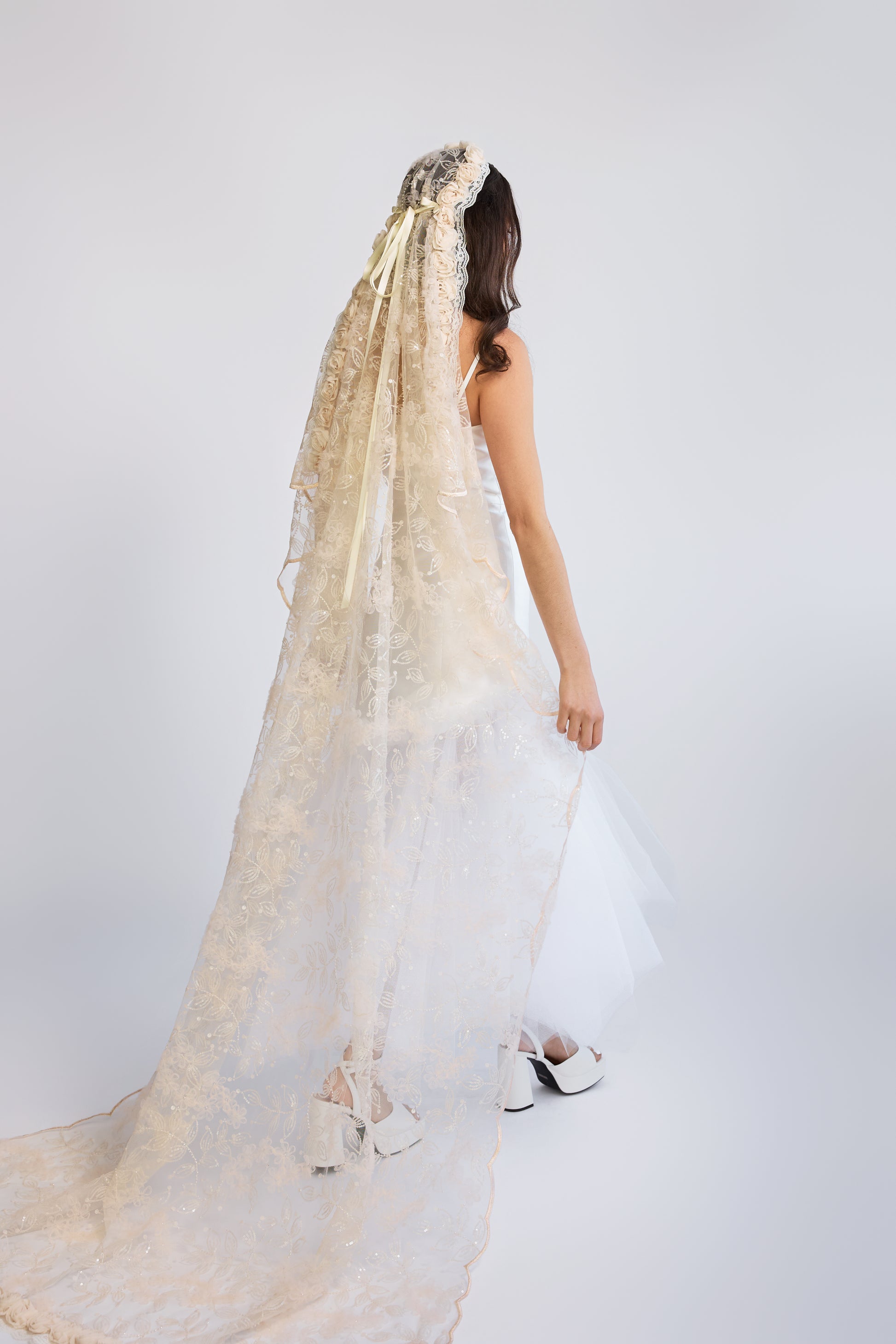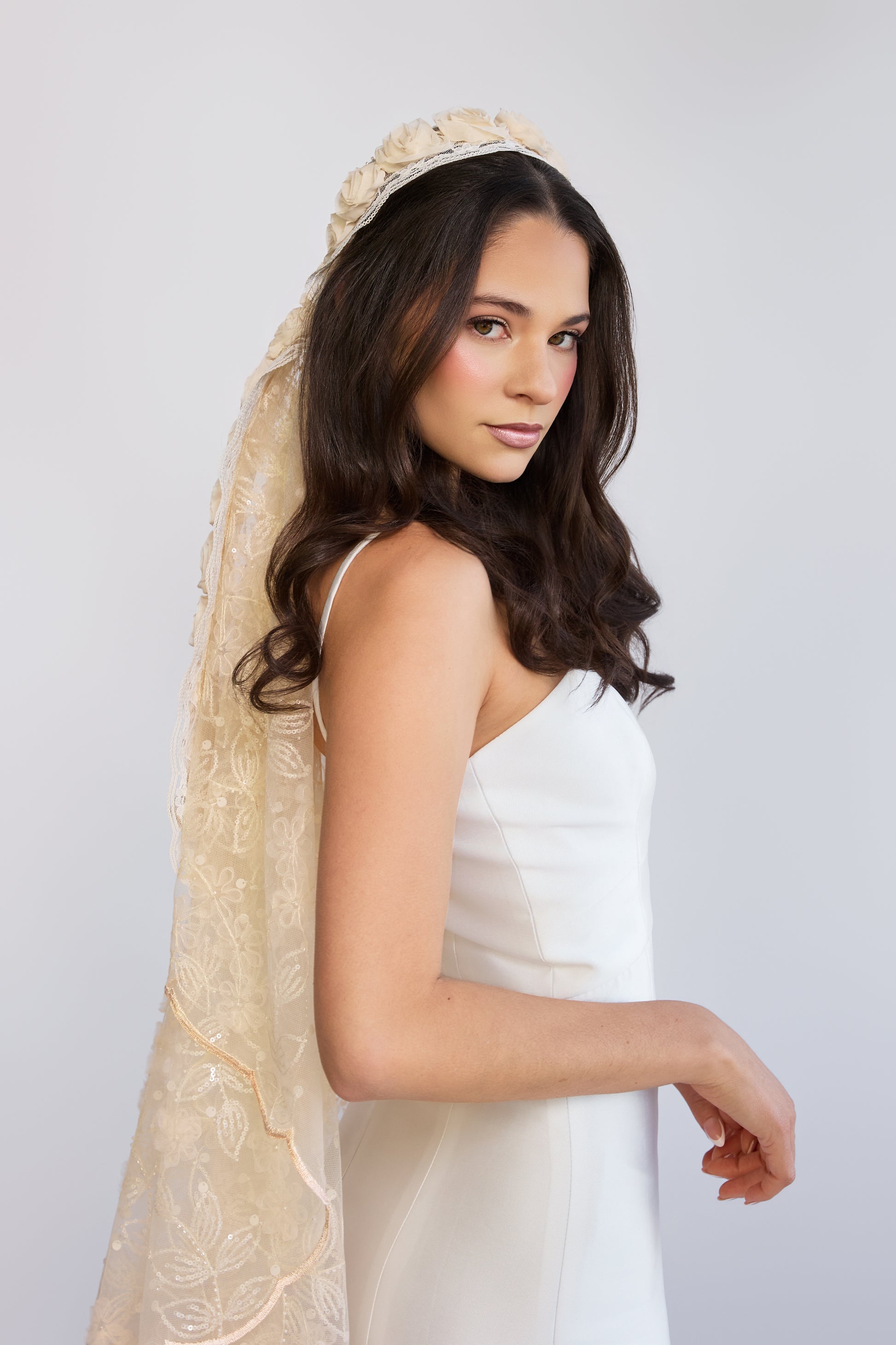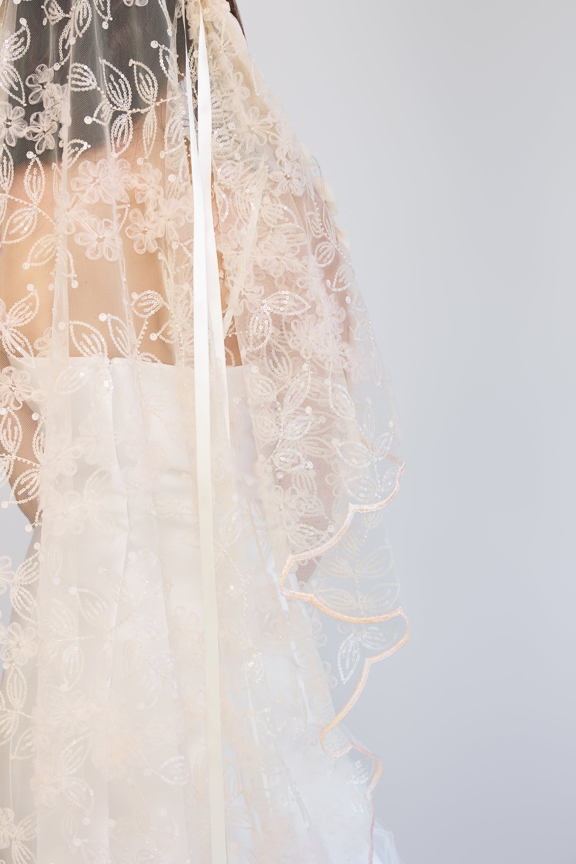 Dreamy, creamy, and versatile. The Lilith veil can be worn with the ribbons tied at the back of the head for a true juliet cap style or untied for a relaxed look. The base is a lightweight tulle lace with flecks of sequins throughout. The perfect finishing touches are the vintage looking rosettes and lace trim at the top and hem of the veil.