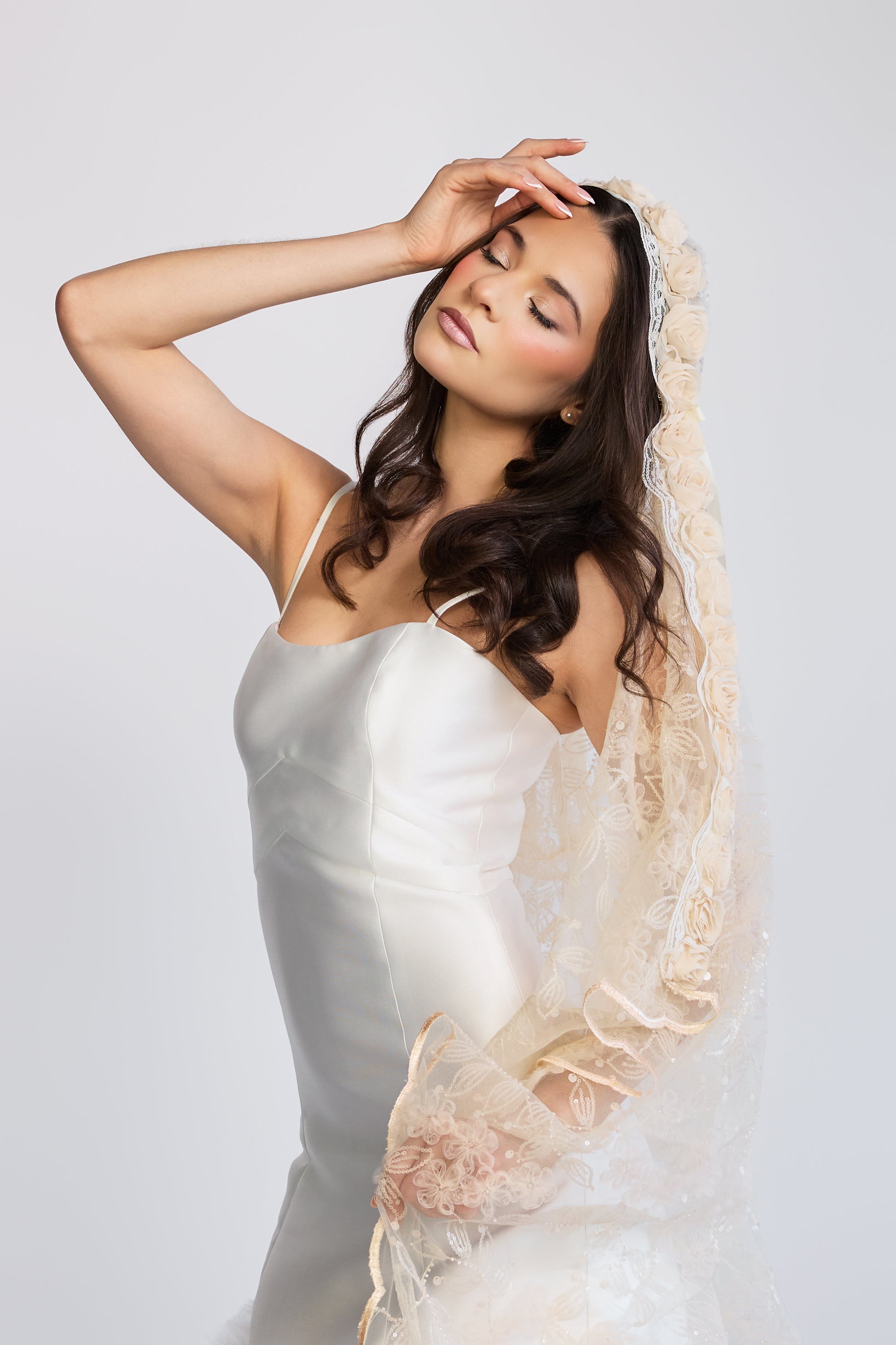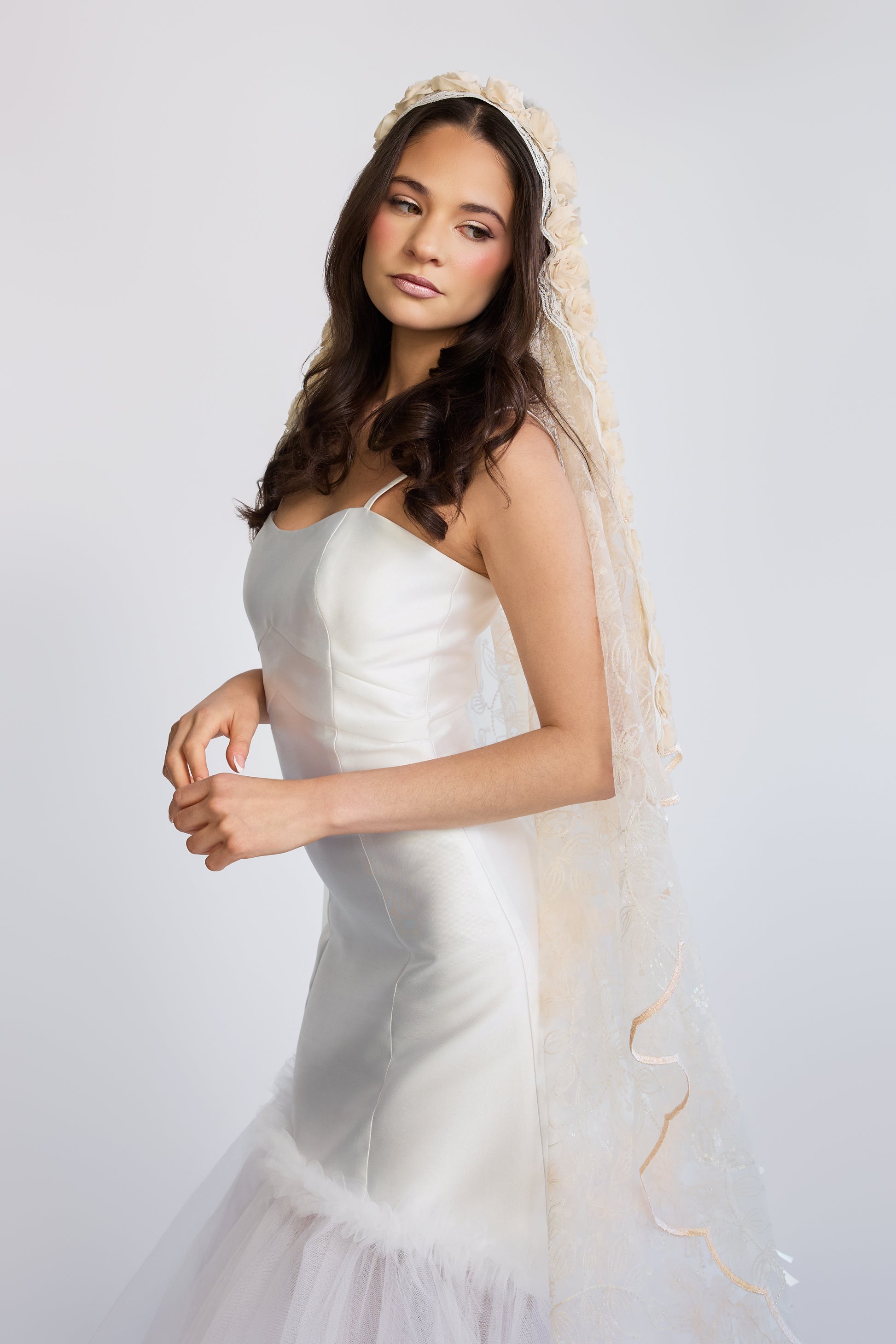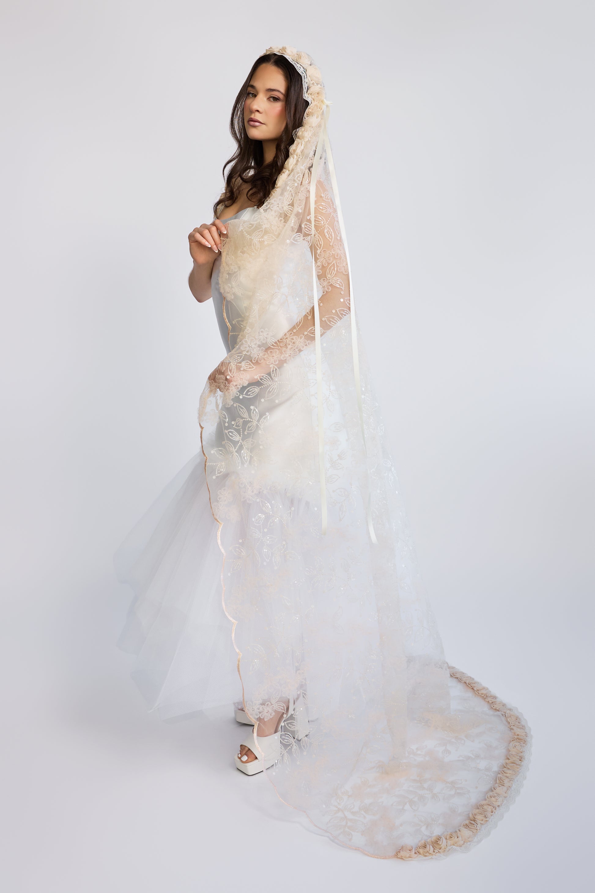 Dreamy, creamy, and versatile. The Lilith veil can be worn with the ribbons tied at the back of the head for a true juliet cap style or untied for a relaxed look. The base is a lightweight tulle lace with flecks of sequins throughout. The perfect finishing touches are the vintage looking rosettes and lace trim at the top and hem of the veil.