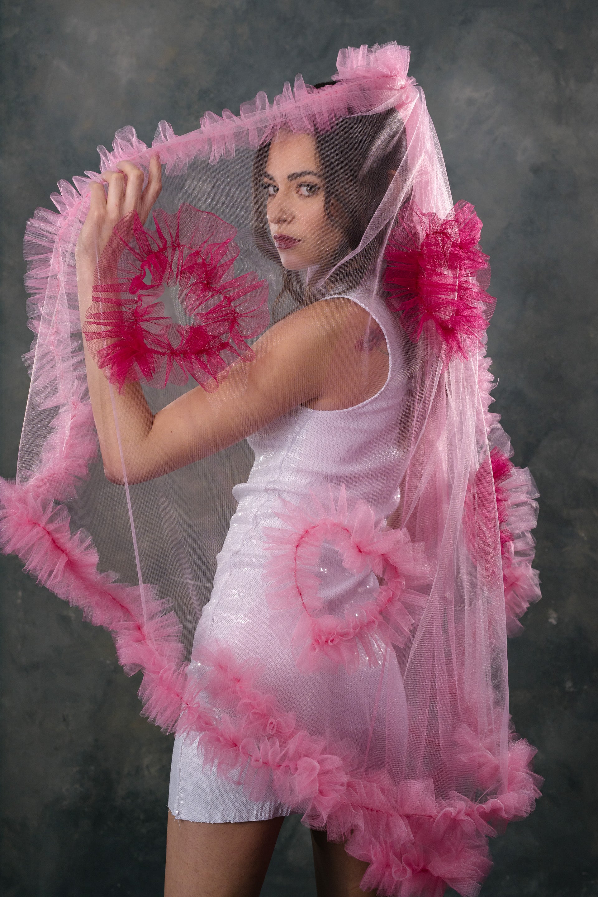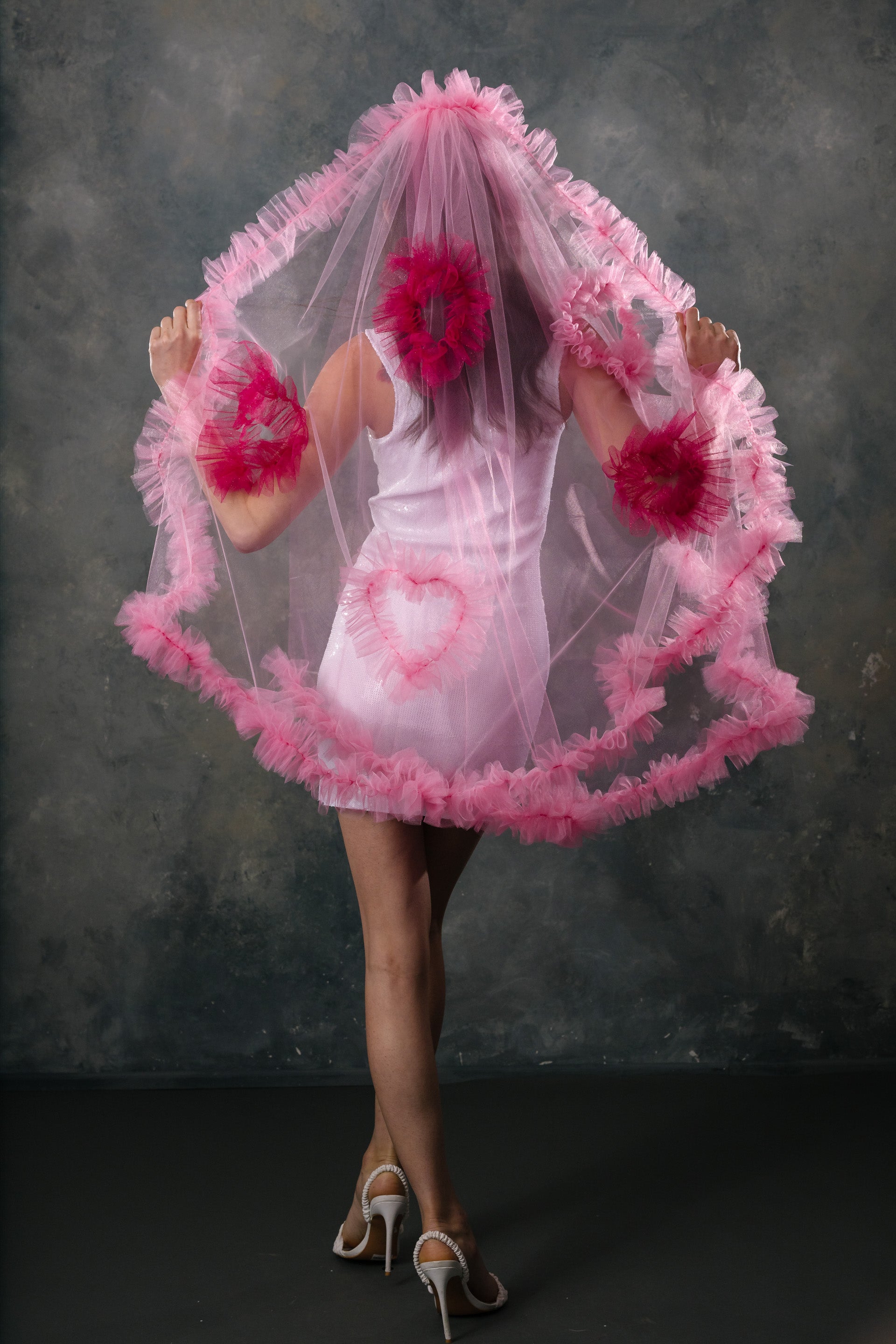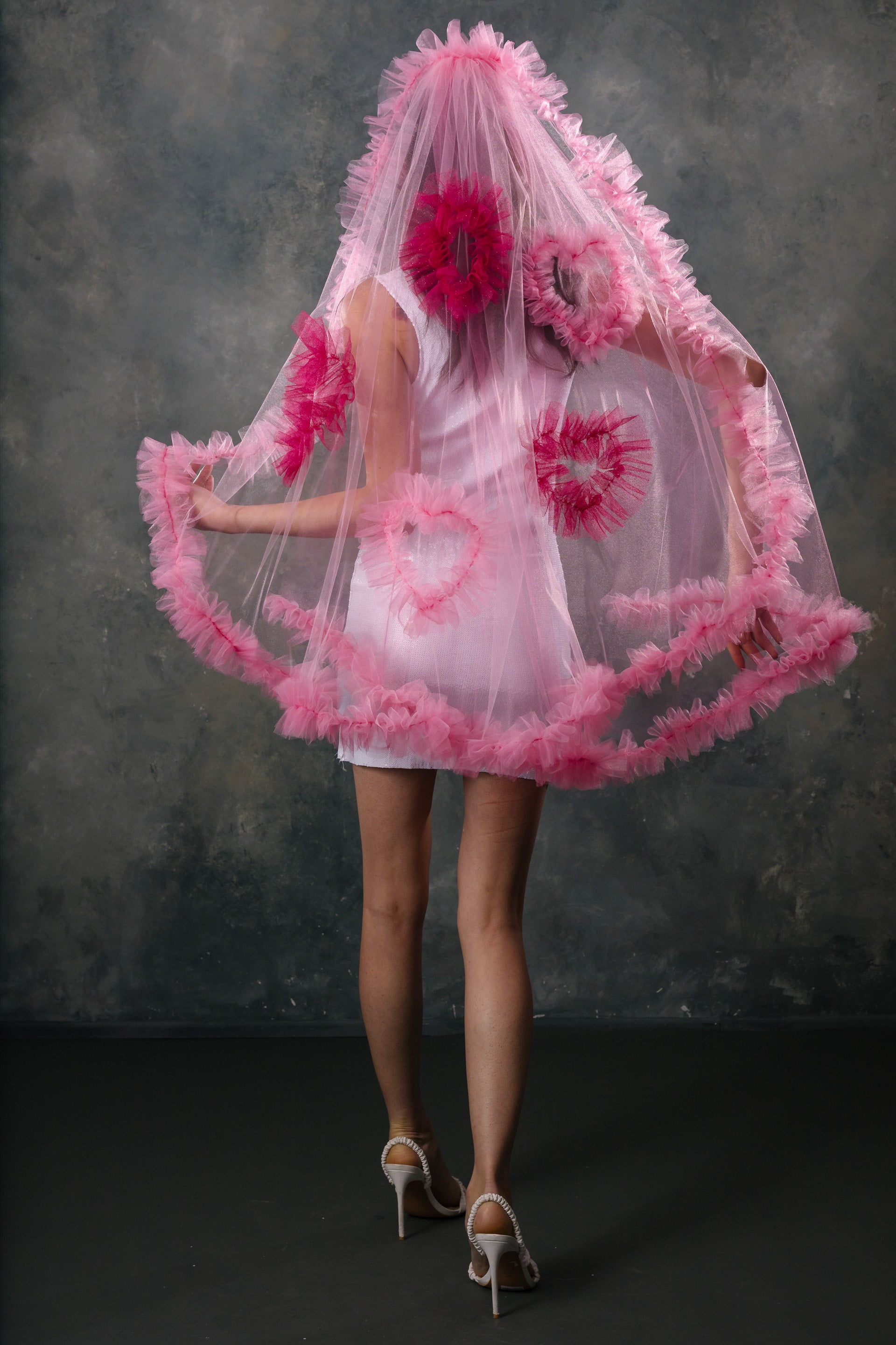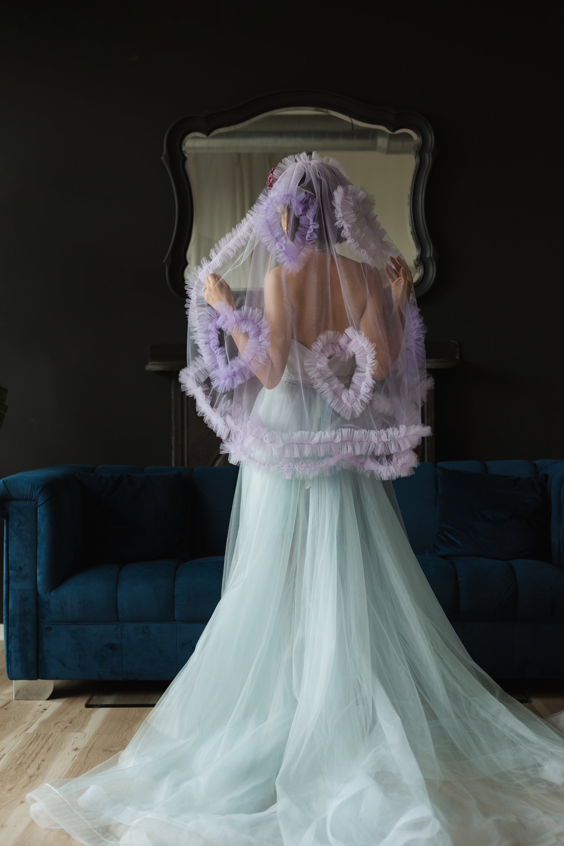 The Madonna Veil is our current fav. It is covered in beautiful ruffles, and sparkly ruffle hearts. It is light weight and has a soft hand feel. You can wear the veil high on your head to show off the ruffles or lower down to make them less prominent. Either way it is going to be stunning! This veil is our brain child and we know you're going to love it.