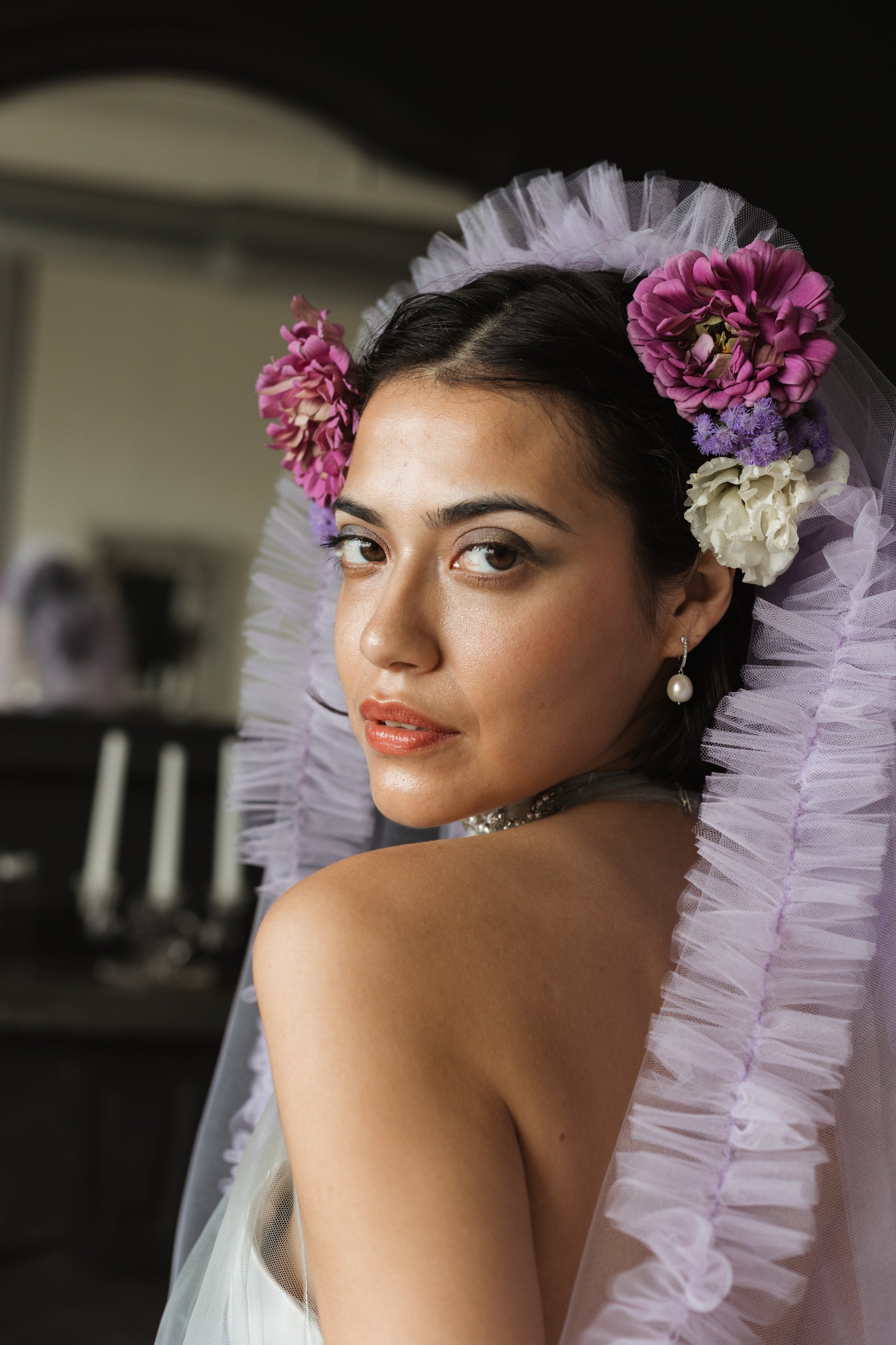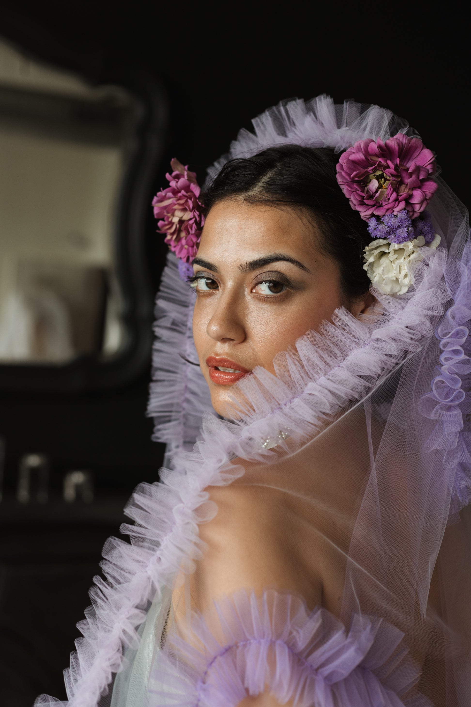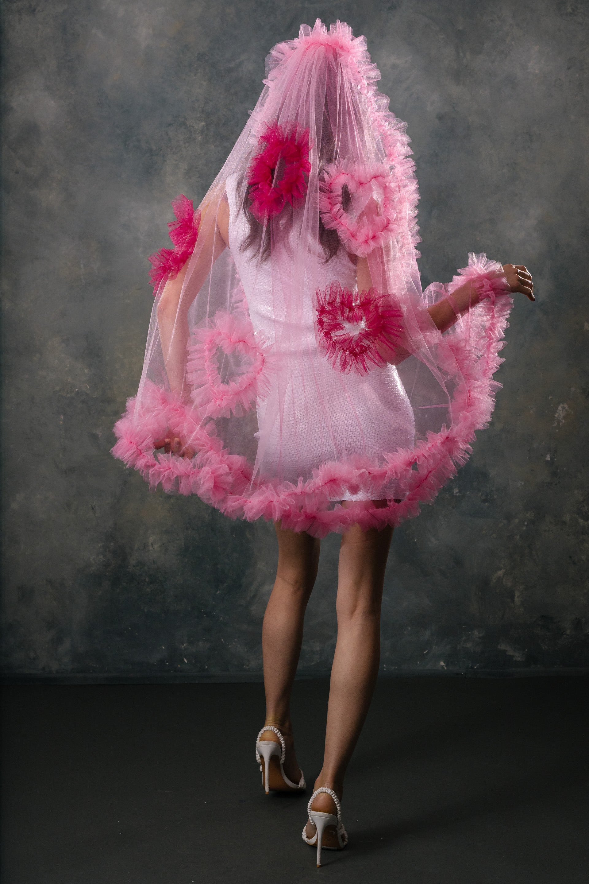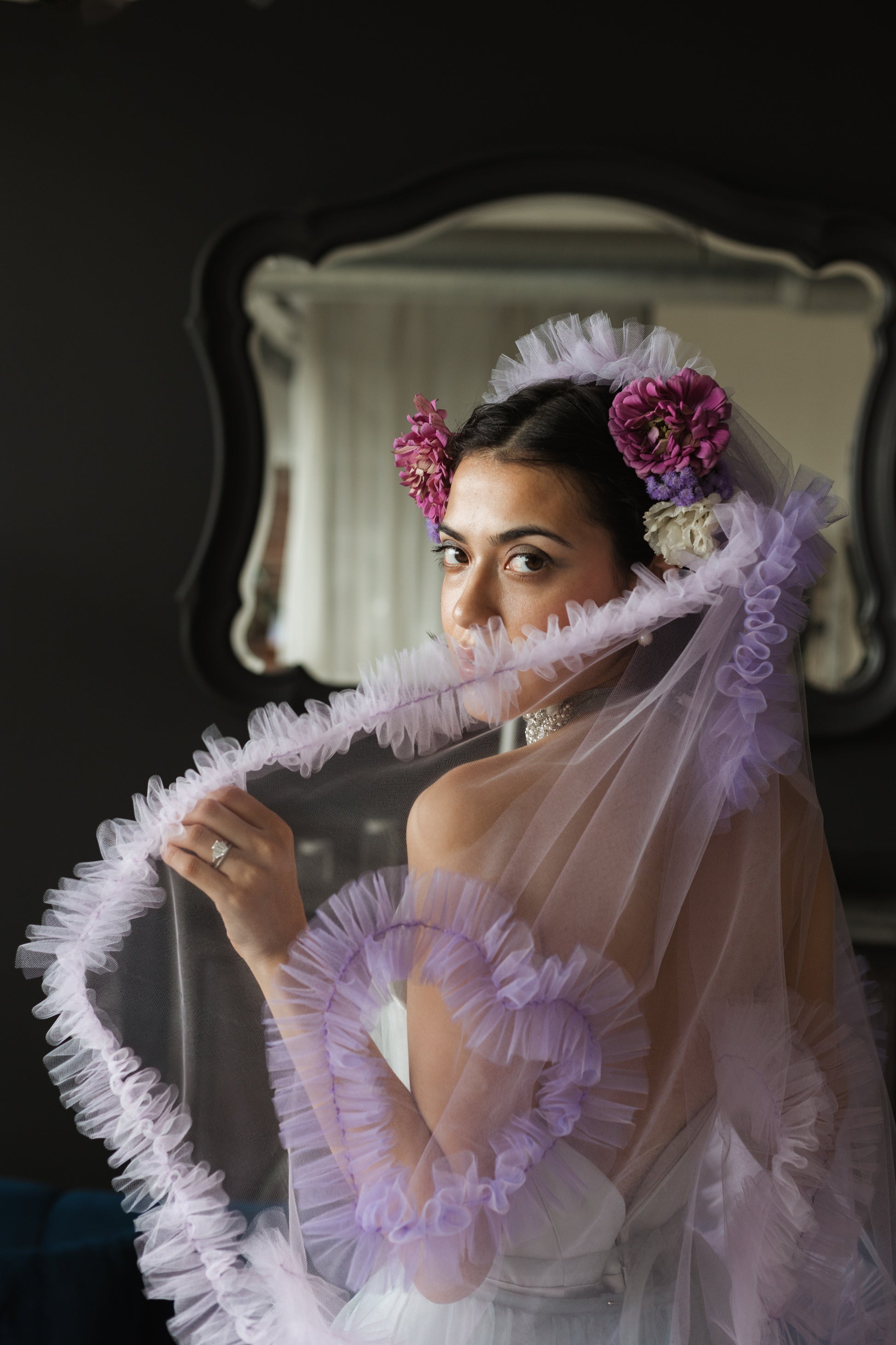 The Madonna Veil is our current fav. It is covered in beautiful ruffles, and sparkly ruffle hearts. It is light weight and has a soft hand feel. You can wear the veil high on your head to show off the ruffles or lower down to make them less prominent. Either way it is going to be stunning! This veil is our brain child and we know you're going to love it.