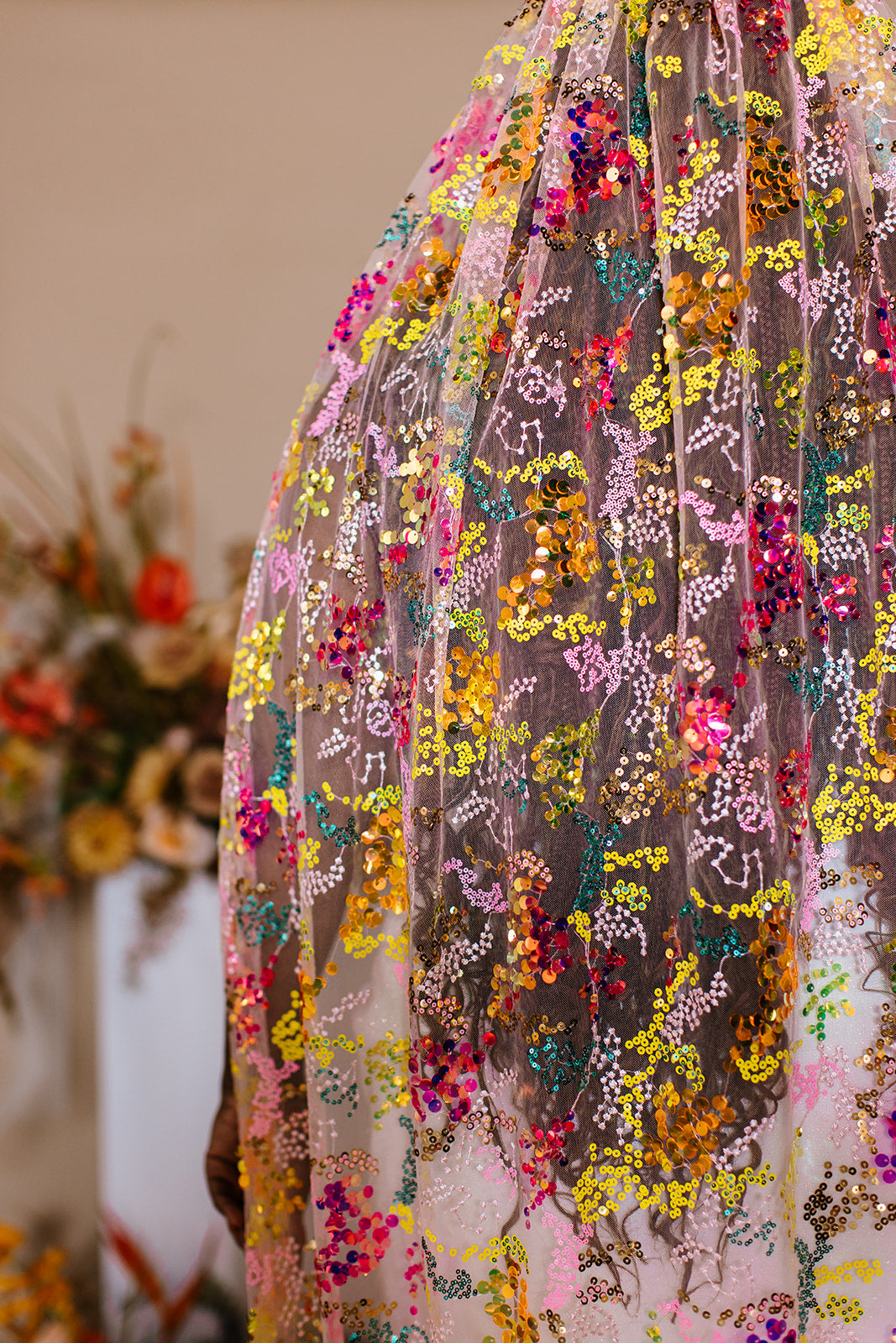 Star light! Star bright! First star I see tonight! This is what play's in my head when wearing this twinkling colorful veil. It is a soft light pink base color with a variety of multicolored clusters scattered throughout. If you loved the dream veil but didn't want the floral motif then this is the veil for you!