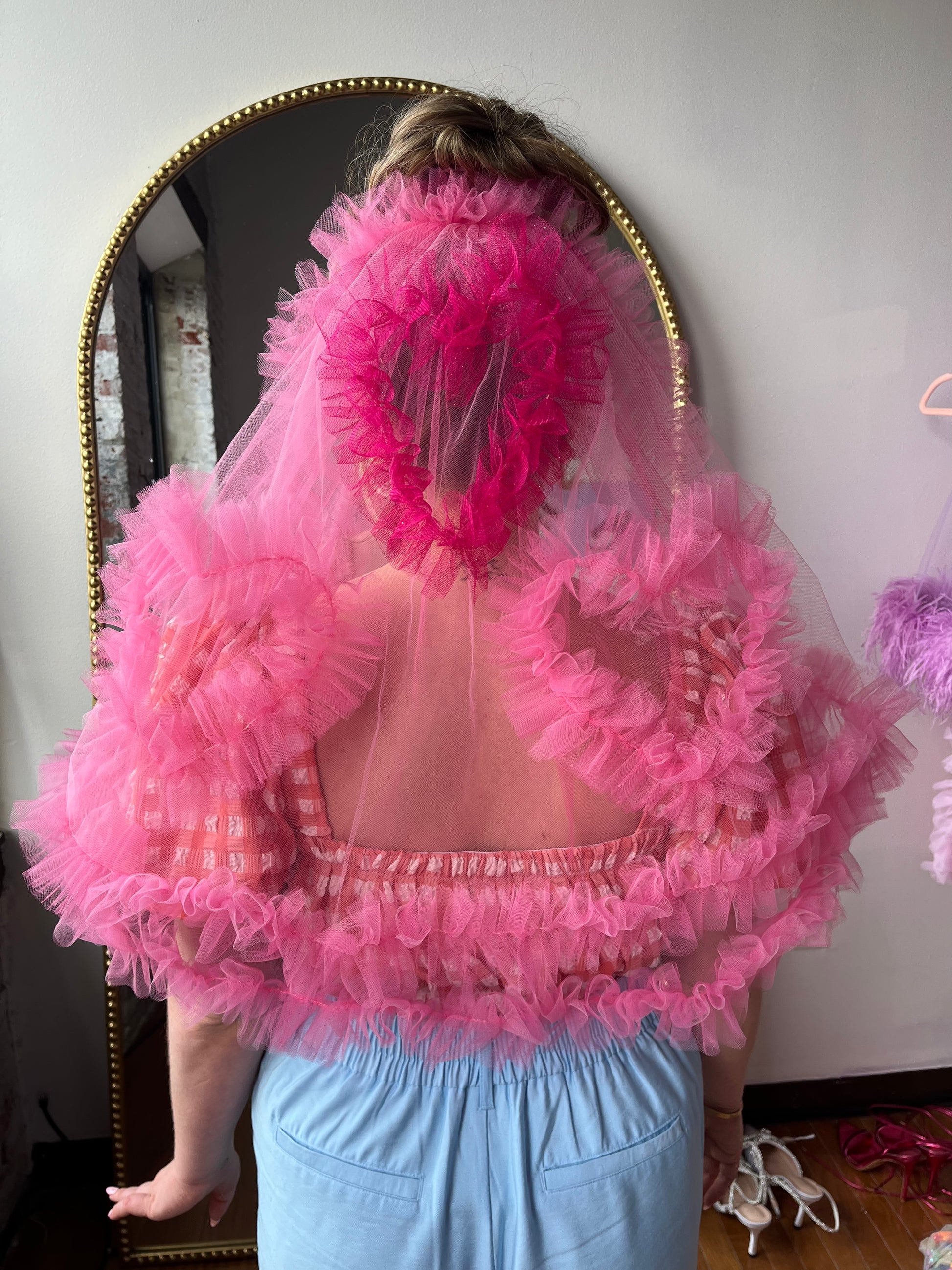 Now available by popular demand! The mini madonna veil is the cute little sister to the OG madonna veil. It hits just above the elbow or shorter depending on head placement, and it has three perfect ruffle hearts.