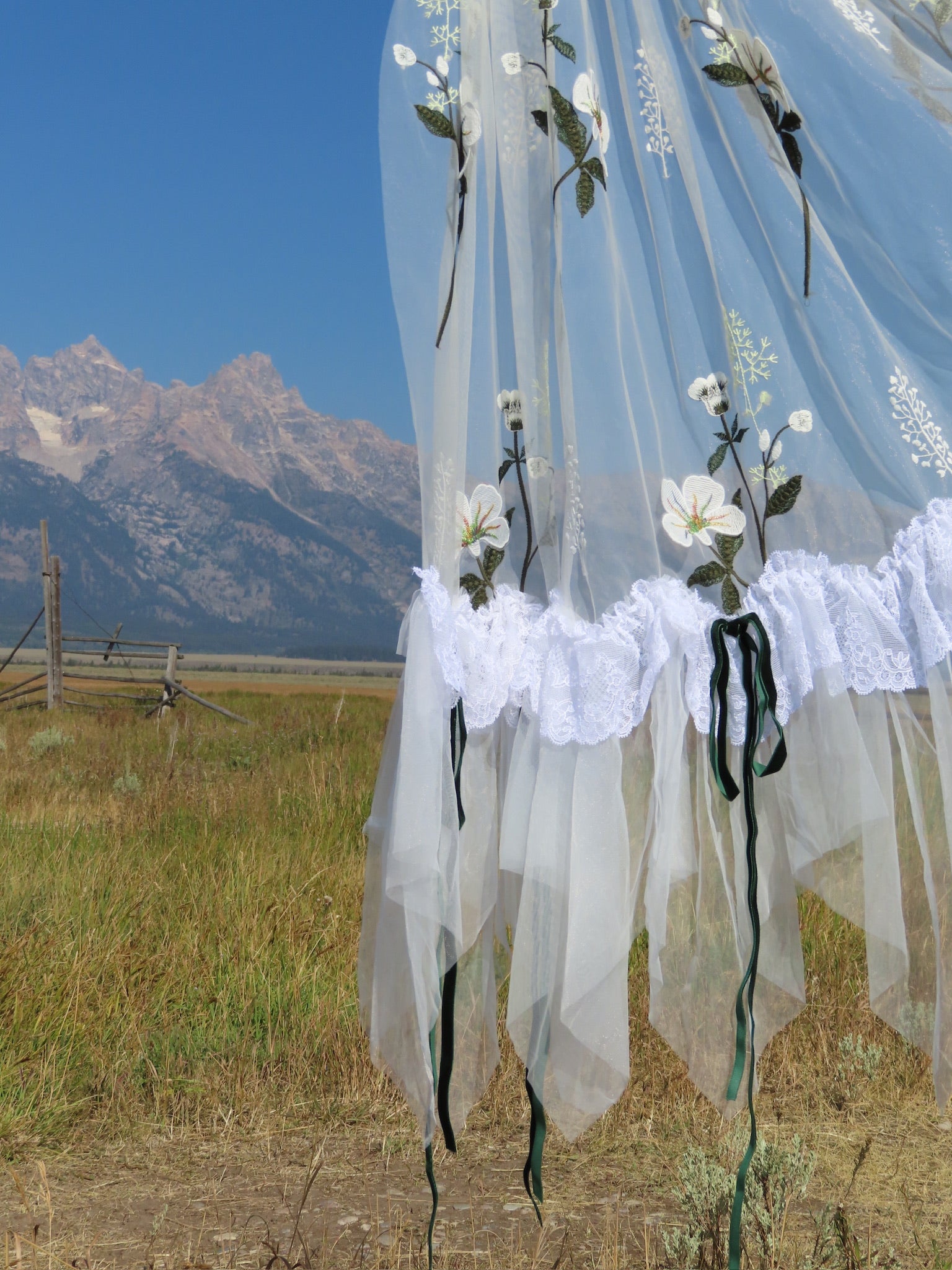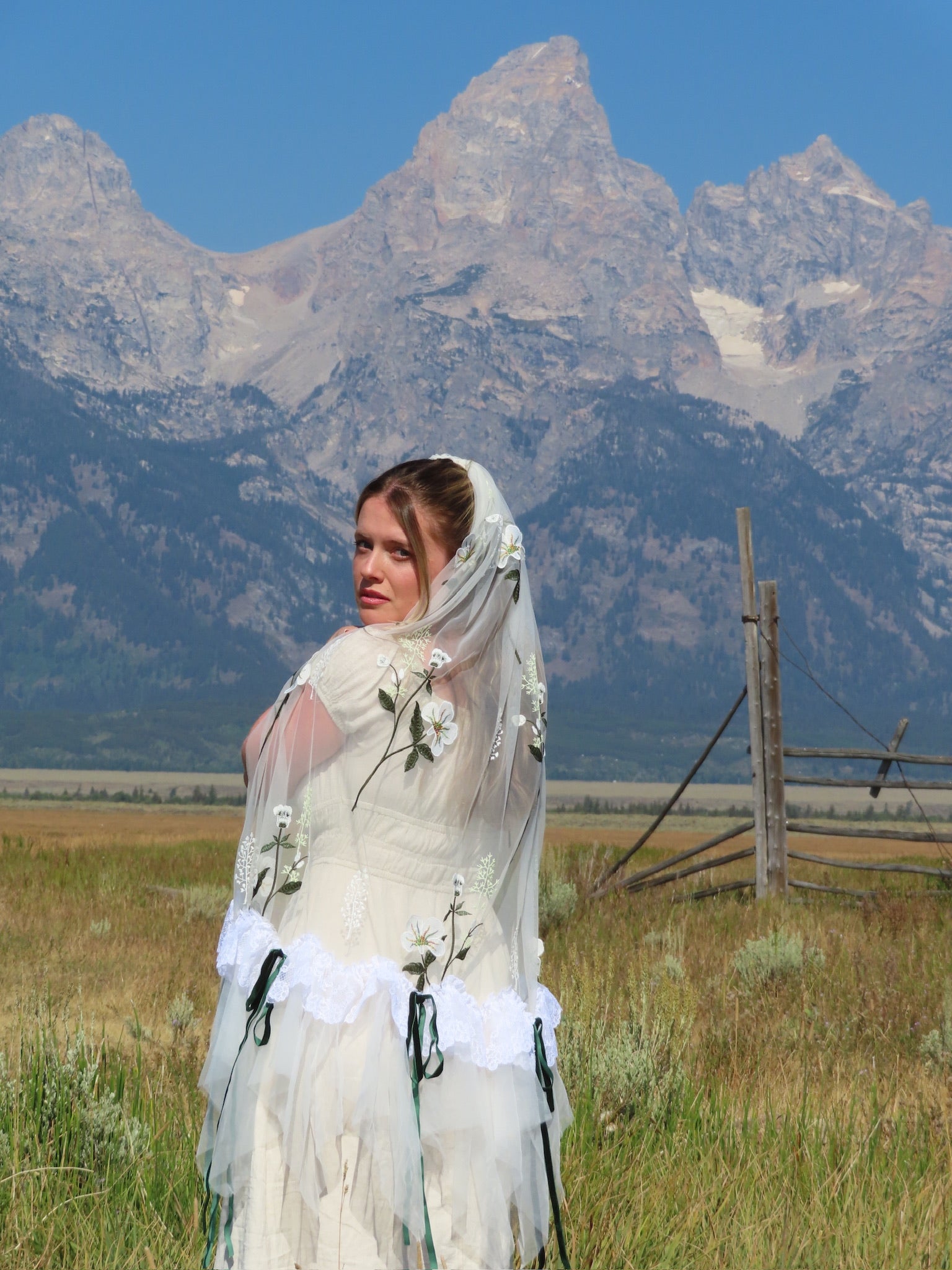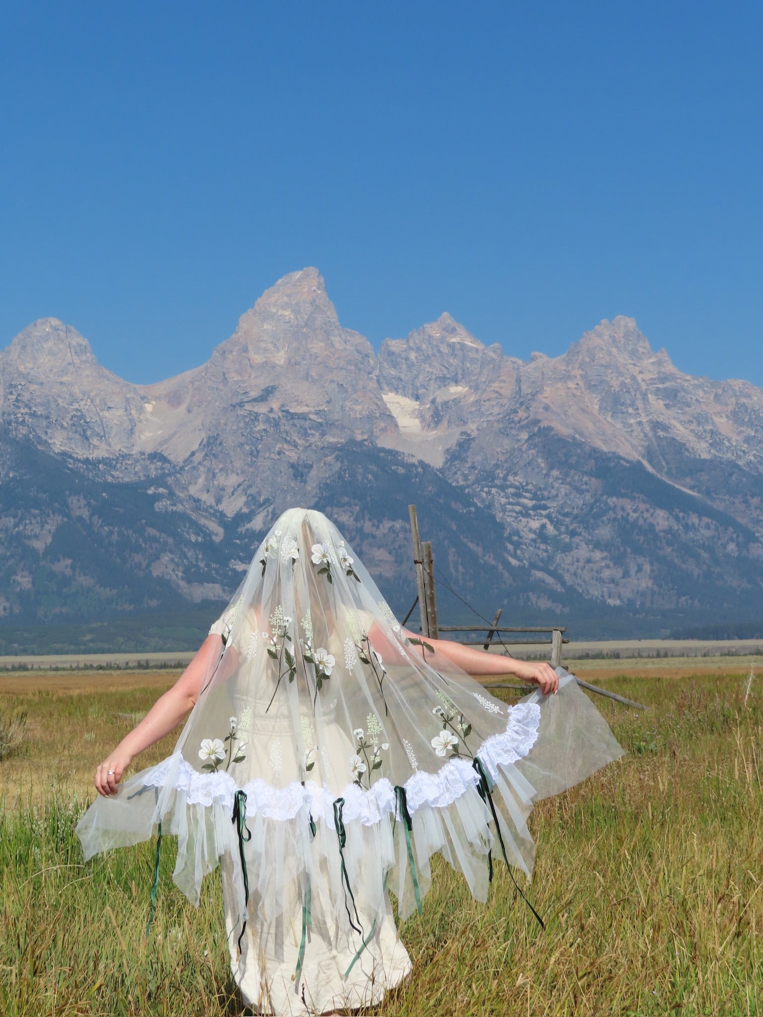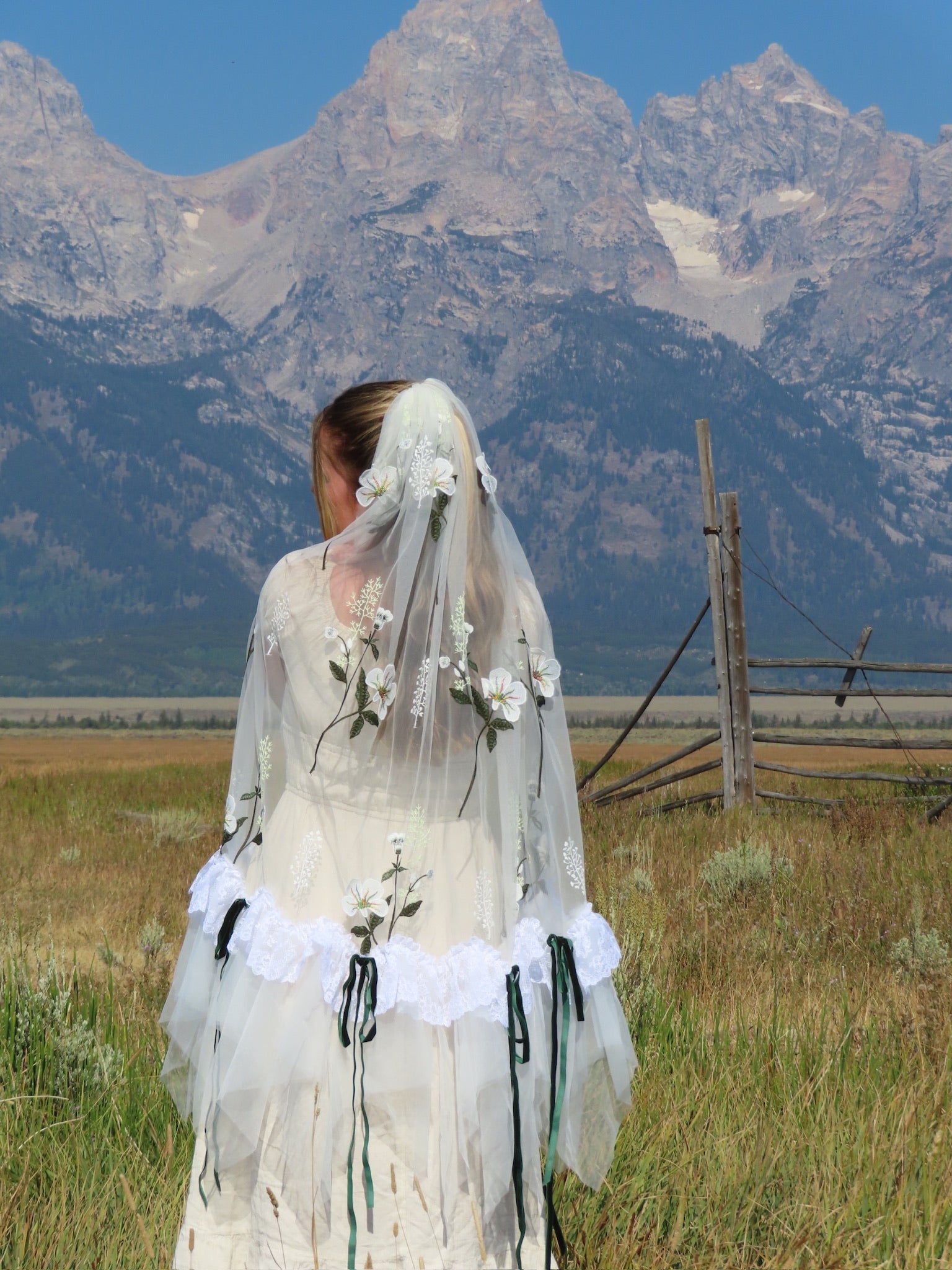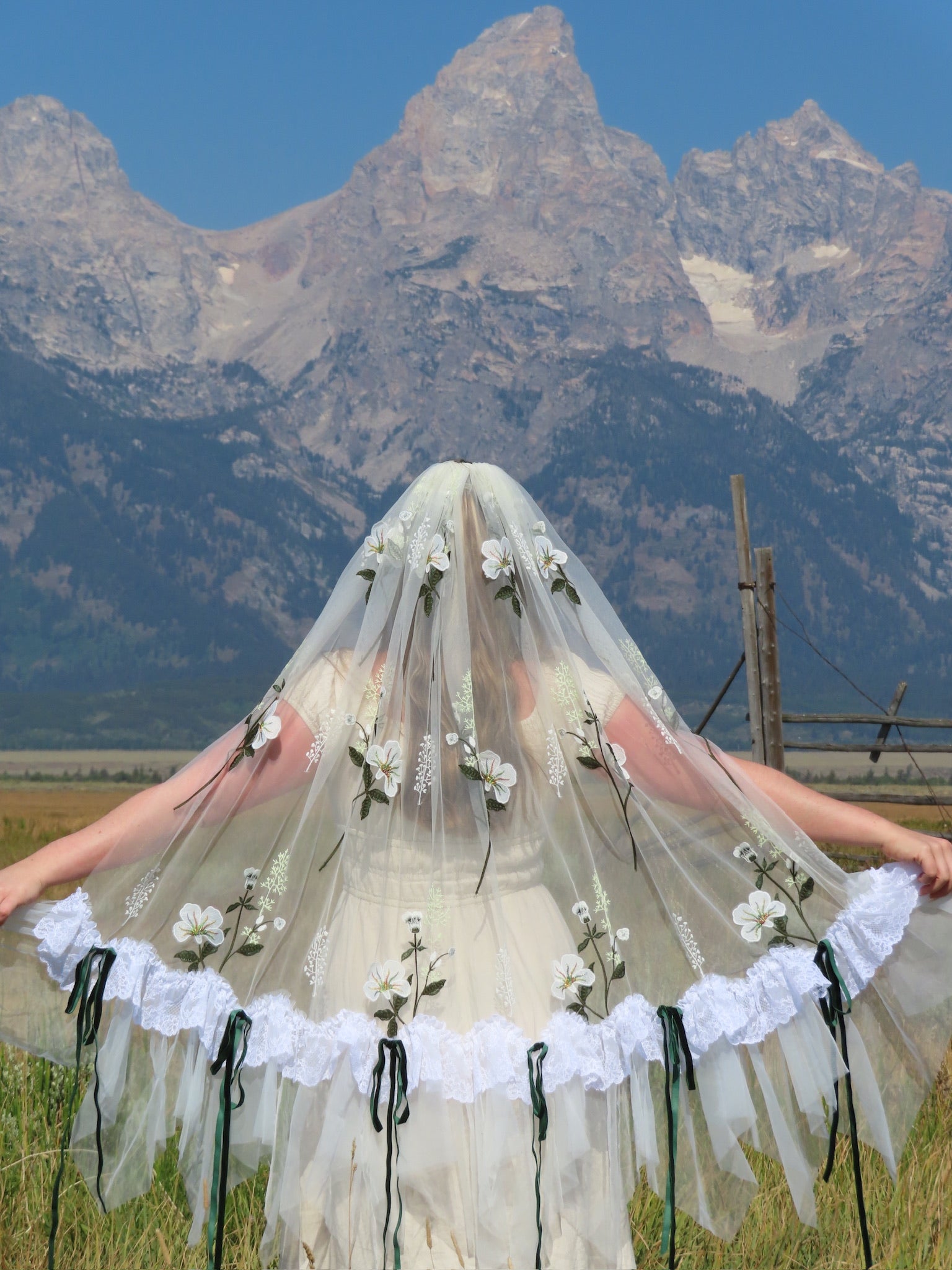 Bring a touch of the wilderness to your wedding look with our Montana Veil, inspired by the sweeping landscapes of Wyoming and Montana. Featuring delicate embroidered wildflowers, soft lace accents, and trailing forest green velvet ribbons, this veil is full of dreamy texture while staying mostly white, perfect for brides who want something classic with a twist. Light, airy, and romantic, it complements a wide range of bridal styles. Hey siri, play wide open spaces by the chicks.
