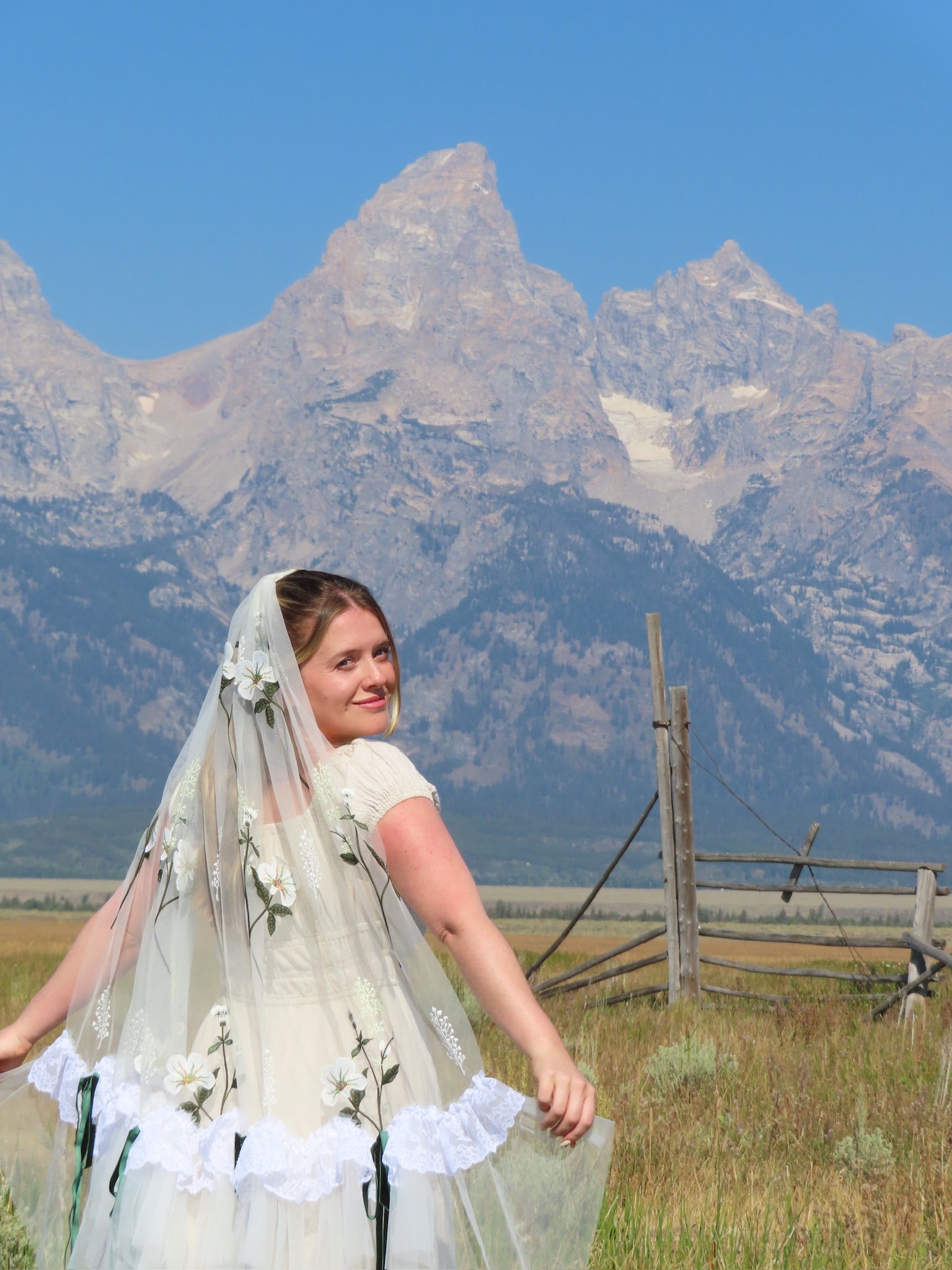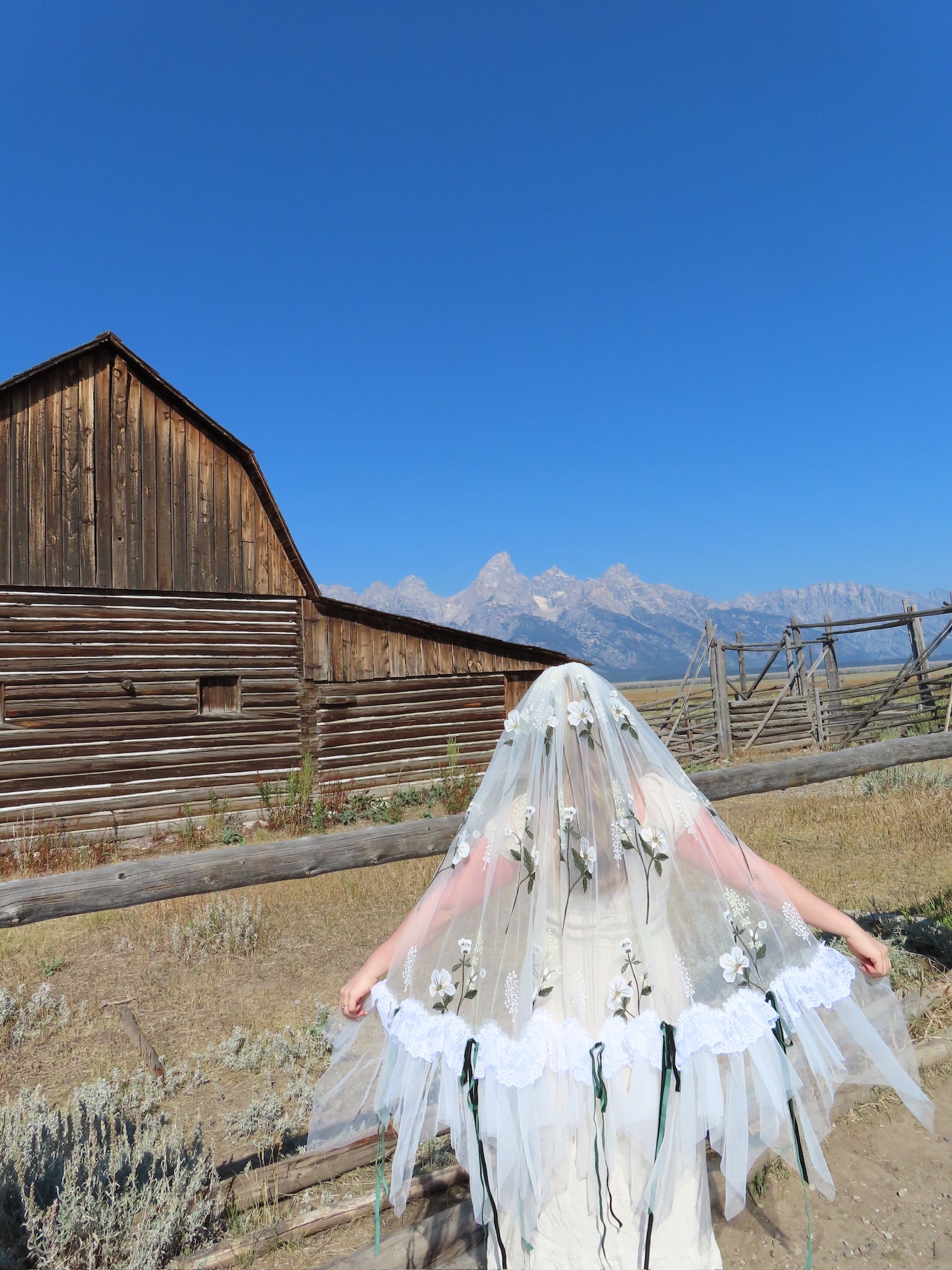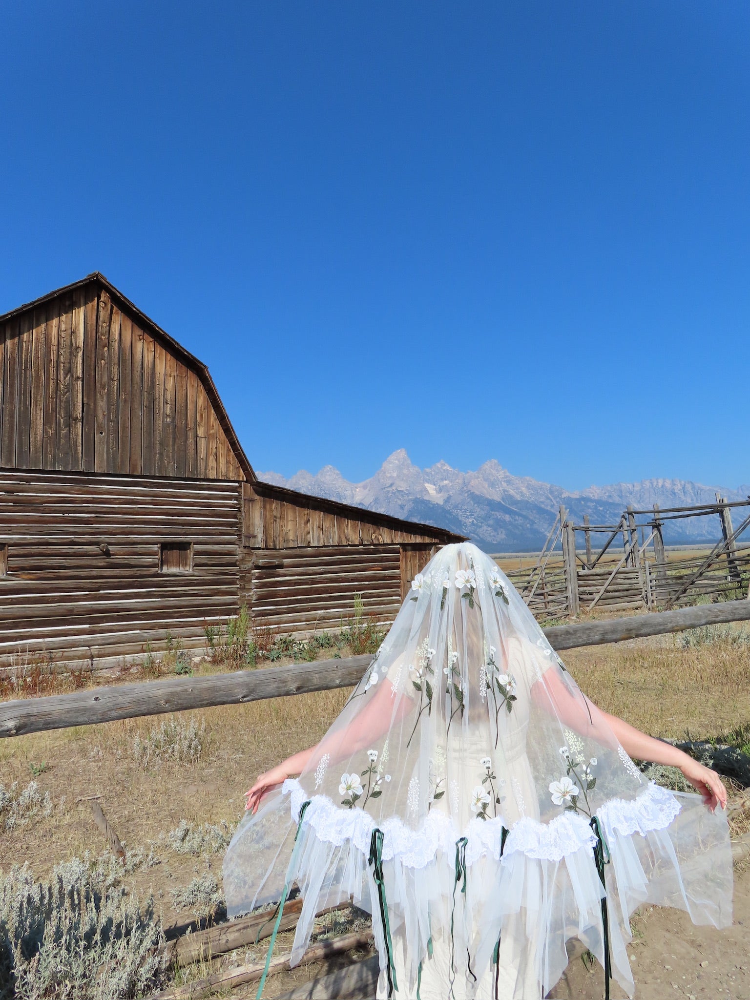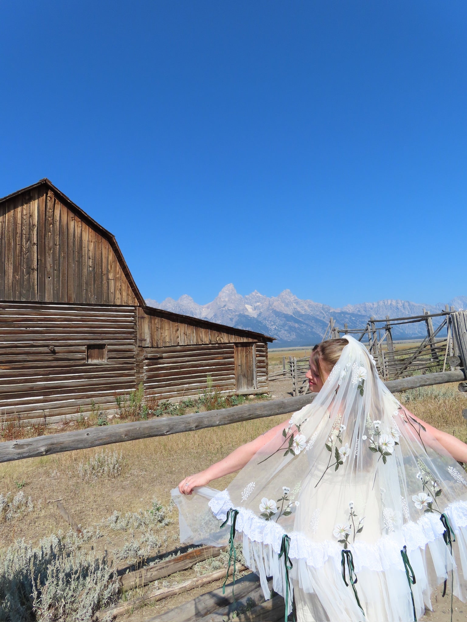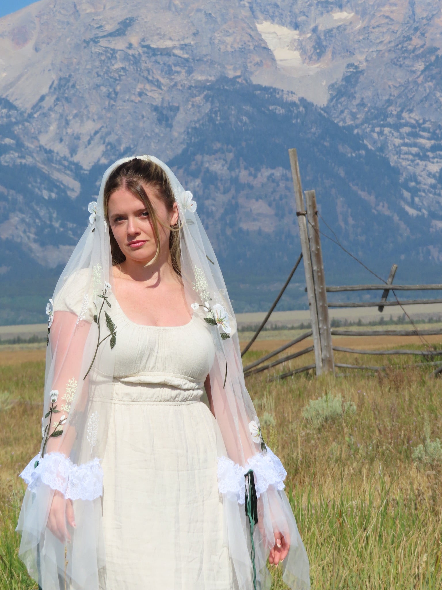 Bring a touch of the wilderness to your wedding look with our Montana Veil, inspired by the sweeping landscapes of Wyoming and Montana. Featuring delicate embroidered wildflowers, soft lace accents, and trailing forest green velvet ribbons, this veil is full of dreamy texture while staying mostly white, perfect for brides who want something classic with a twist. Light, airy, and romantic, it complements a wide range of bridal styles. Hey siri, play wide open spaces by the chicks.