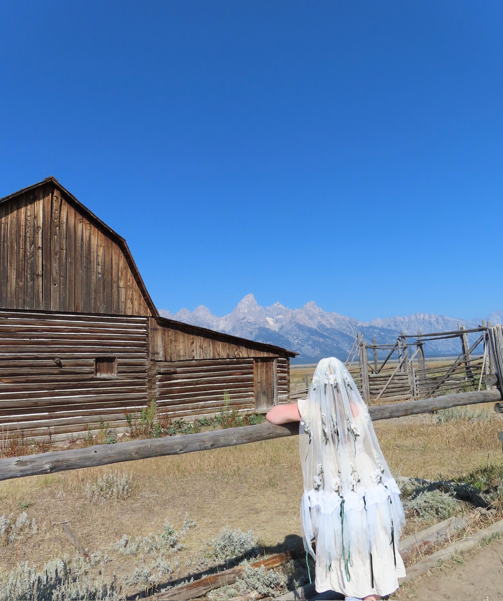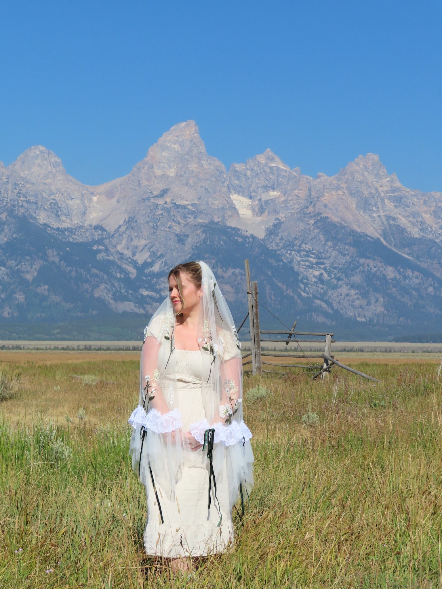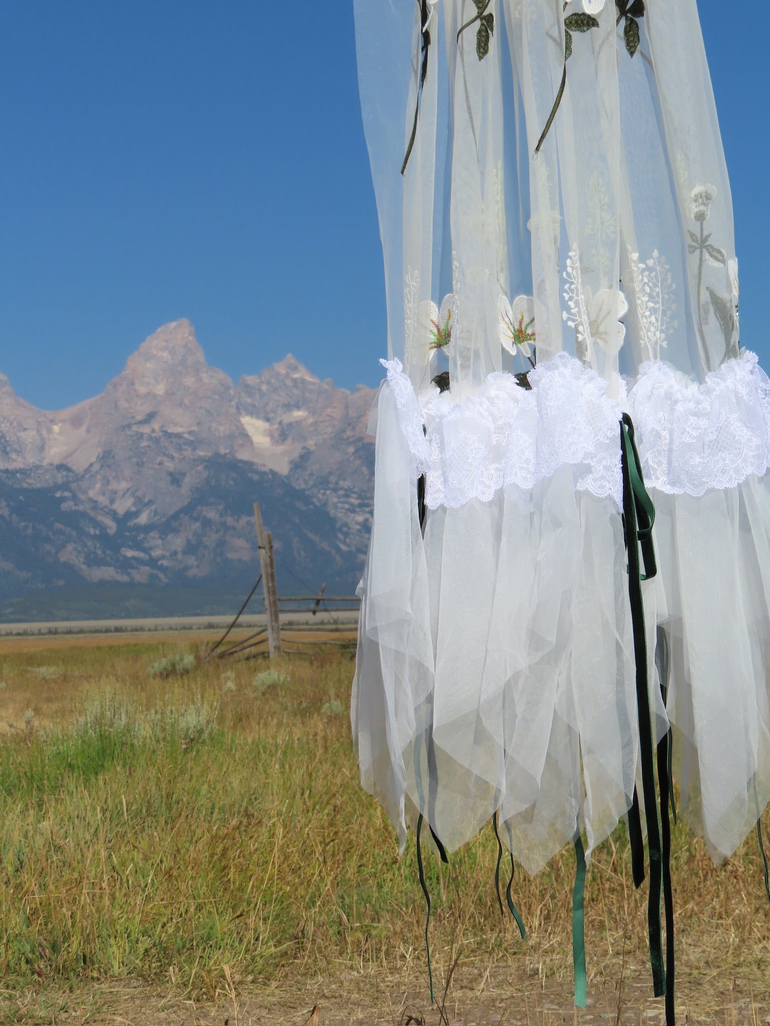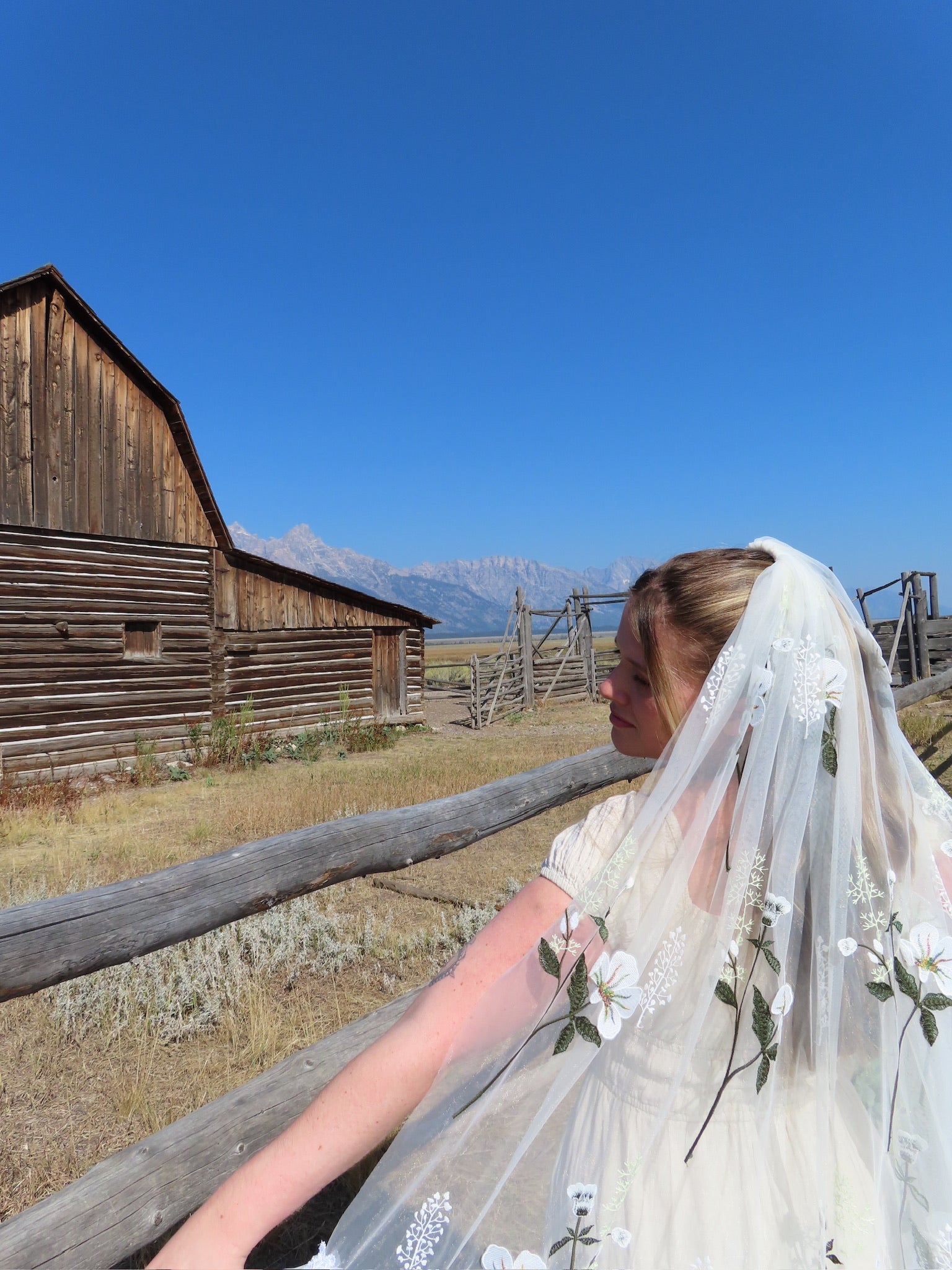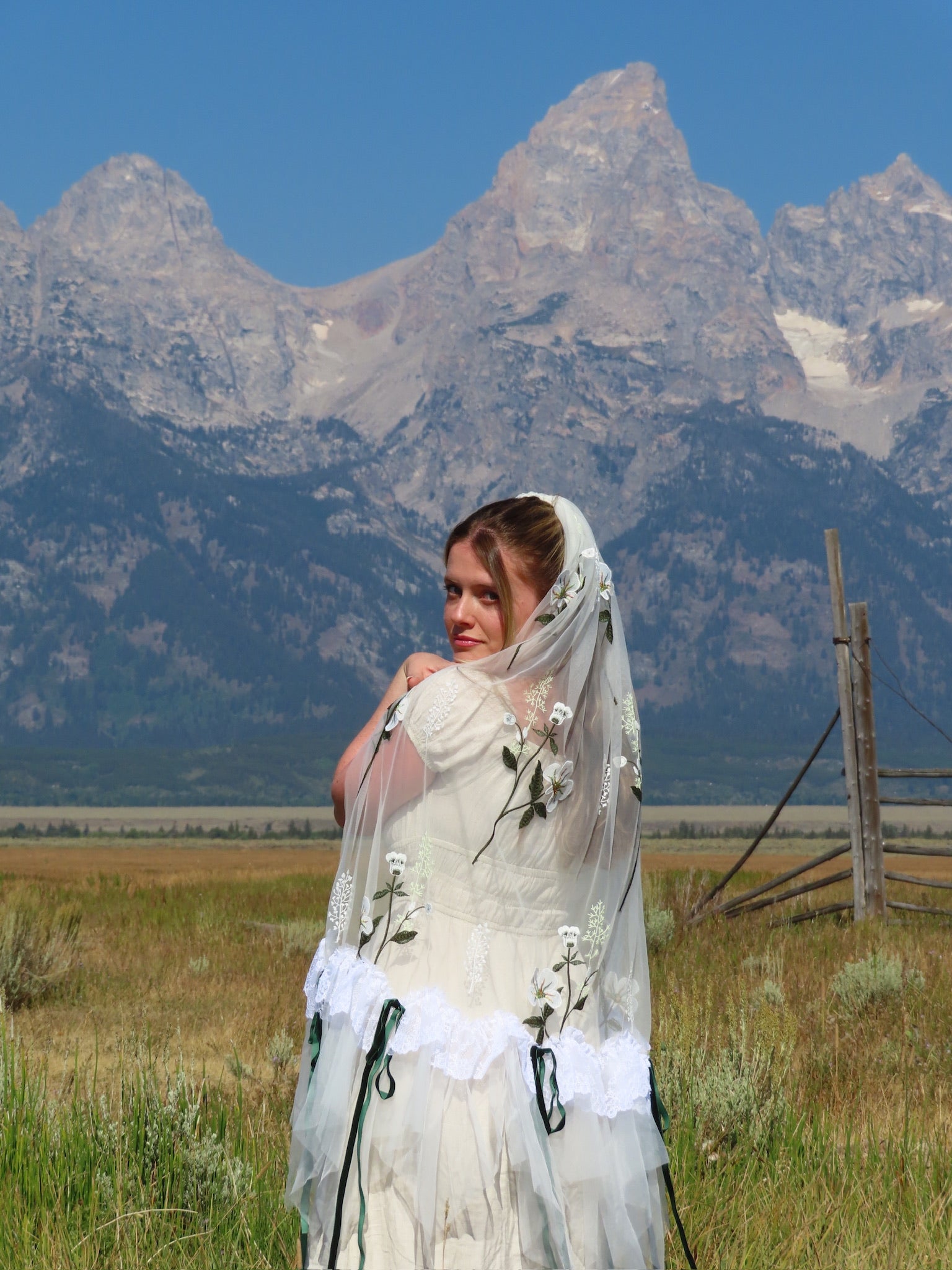 Bring a touch of the wilderness to your wedding look with our Montana Veil, inspired by the sweeping landscapes of Wyoming and Montana. Featuring delicate embroidered wildflowers, soft lace accents, and trailing forest green velvet ribbons, this veil is full of dreamy texture while staying mostly white, perfect for brides who want something classic with a twist. Light, airy, and romantic, it complements a wide range of bridal styles. Hey siri, play wide open spaces by the chicks.