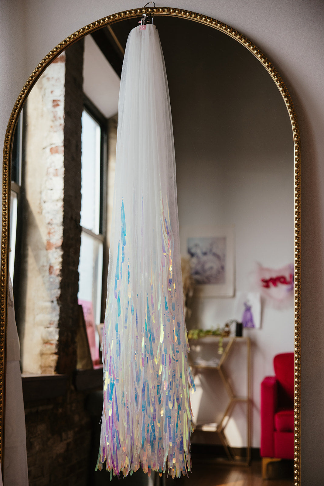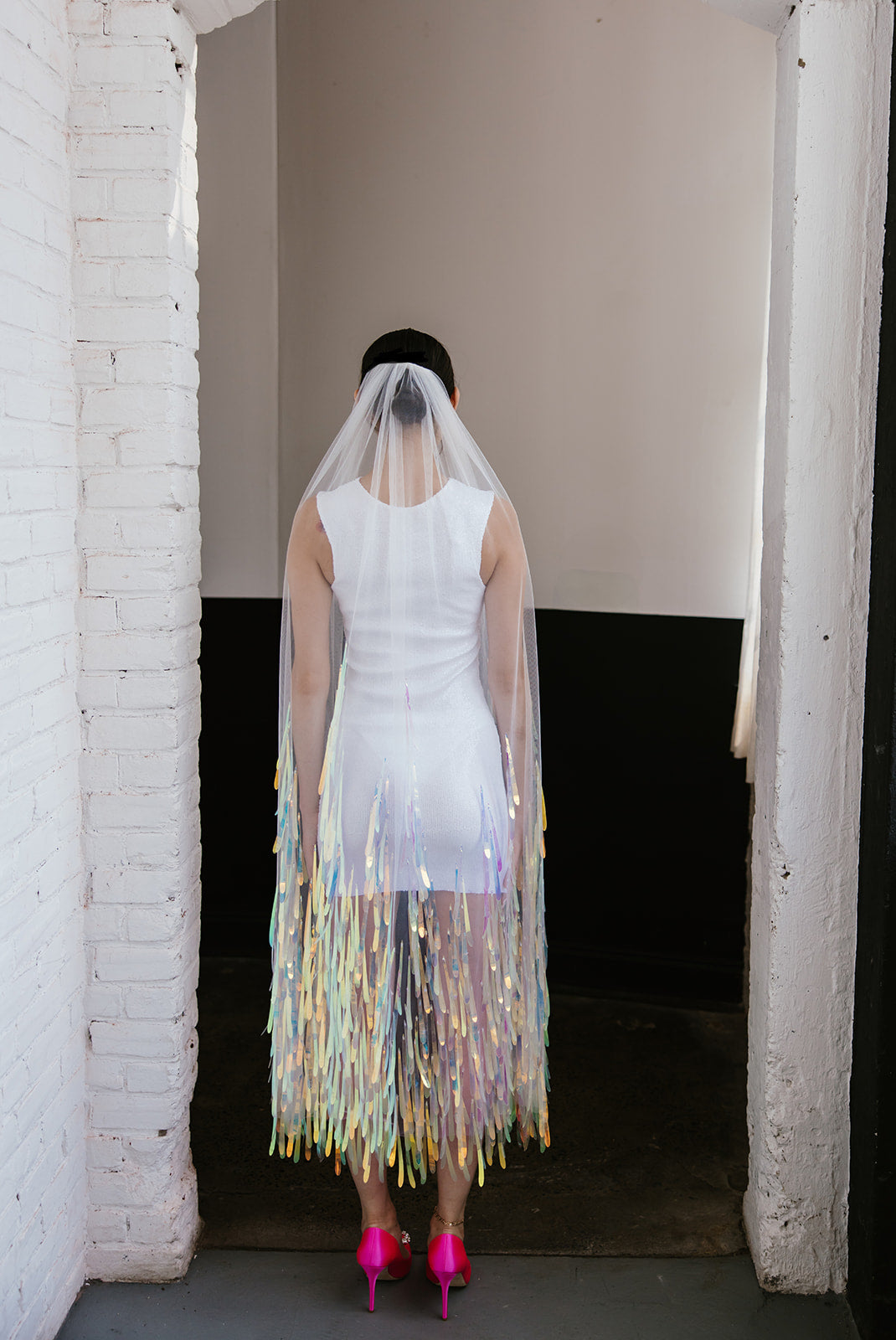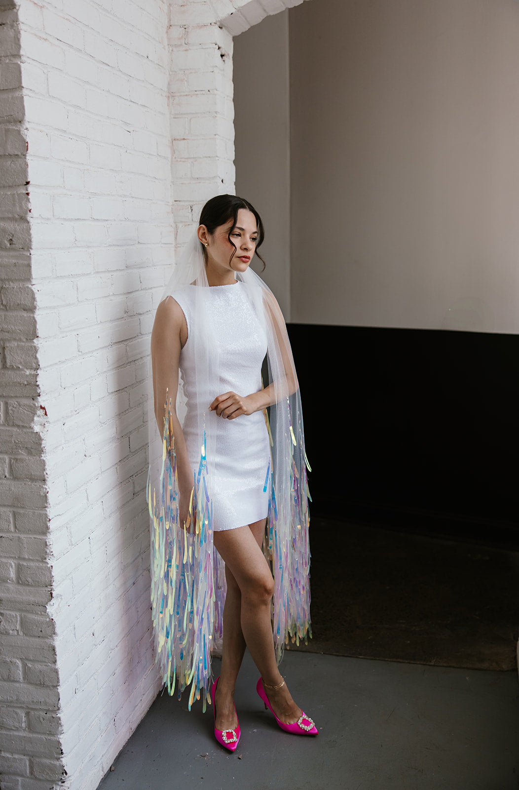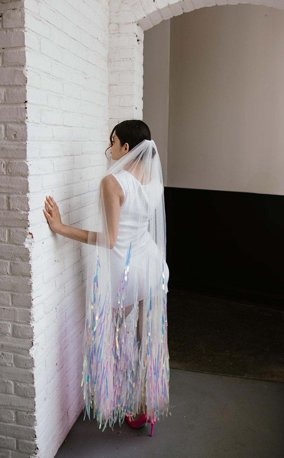 Meet, Moonbeam! She's the very first limited edition Madison Chamberlain original with custom-designed palette fabric that was hand-made in Italy. It is 55" in length, and reflects beautiful shades of blue, purple, pink, silver, and gold! The base of the veil is a soft light ivory tulle. We cannot wait to see shining in this!!!