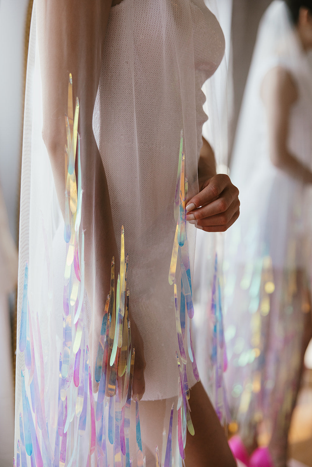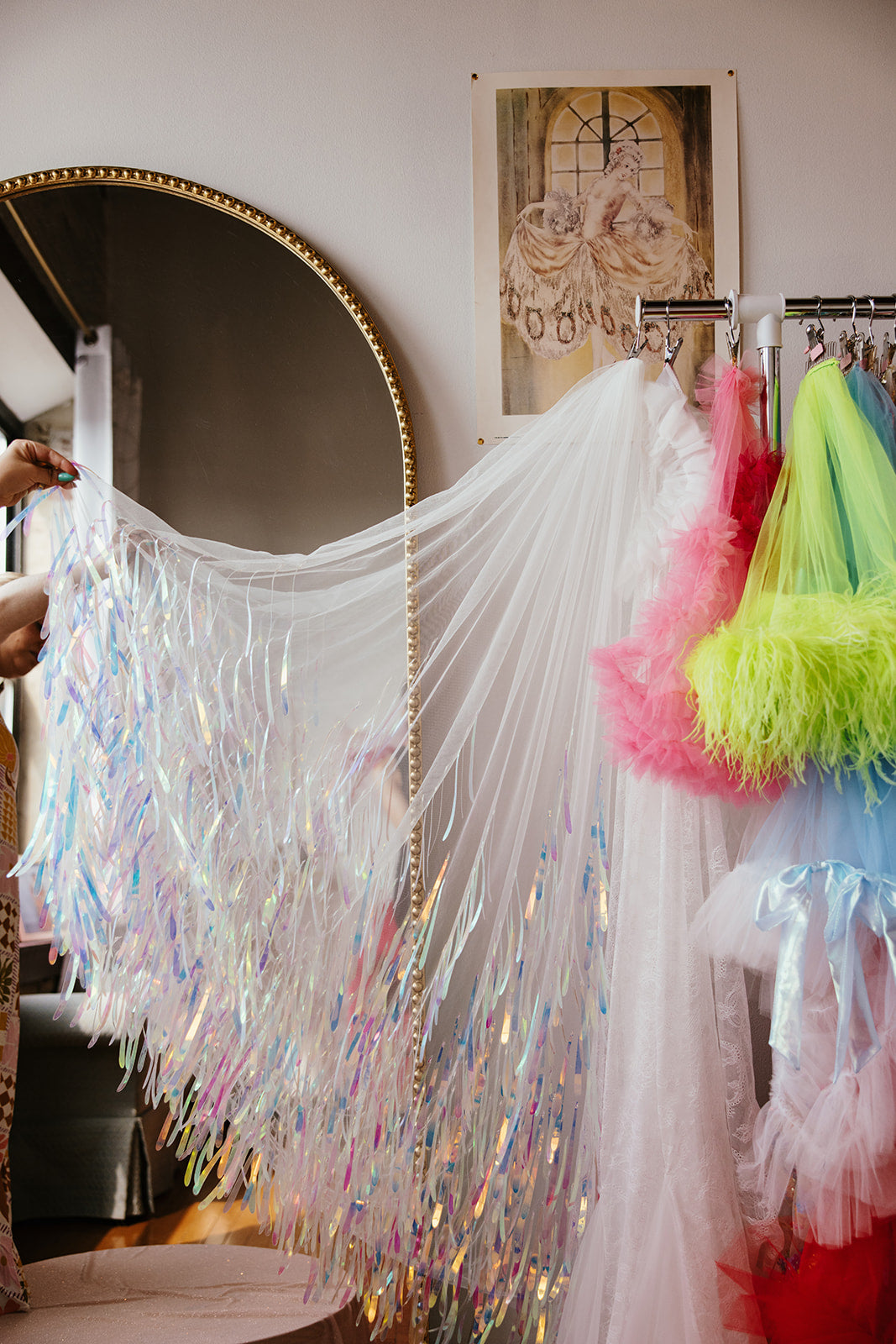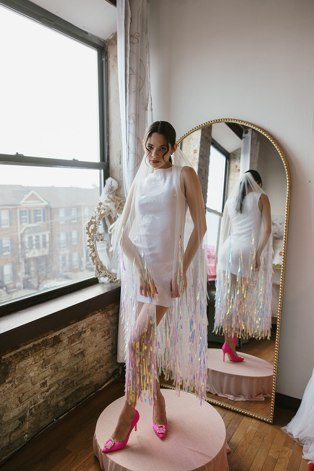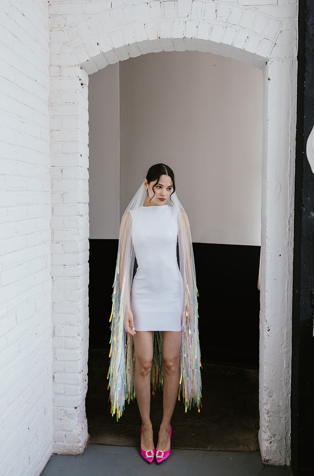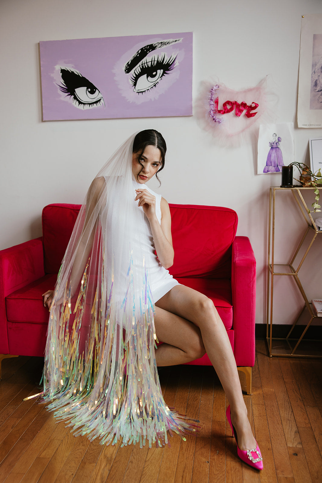 Meet, Moonbeam! She's the very first limited edition Madison Chamberlain original with custom-designed palette fabric that was hand-made in Italy. It is 55" in length, and reflects beautiful shades of blue, purple, pink, silver, and gold! The base of the veil is a soft light ivory tulle. We cannot wait to see shining in this!!!