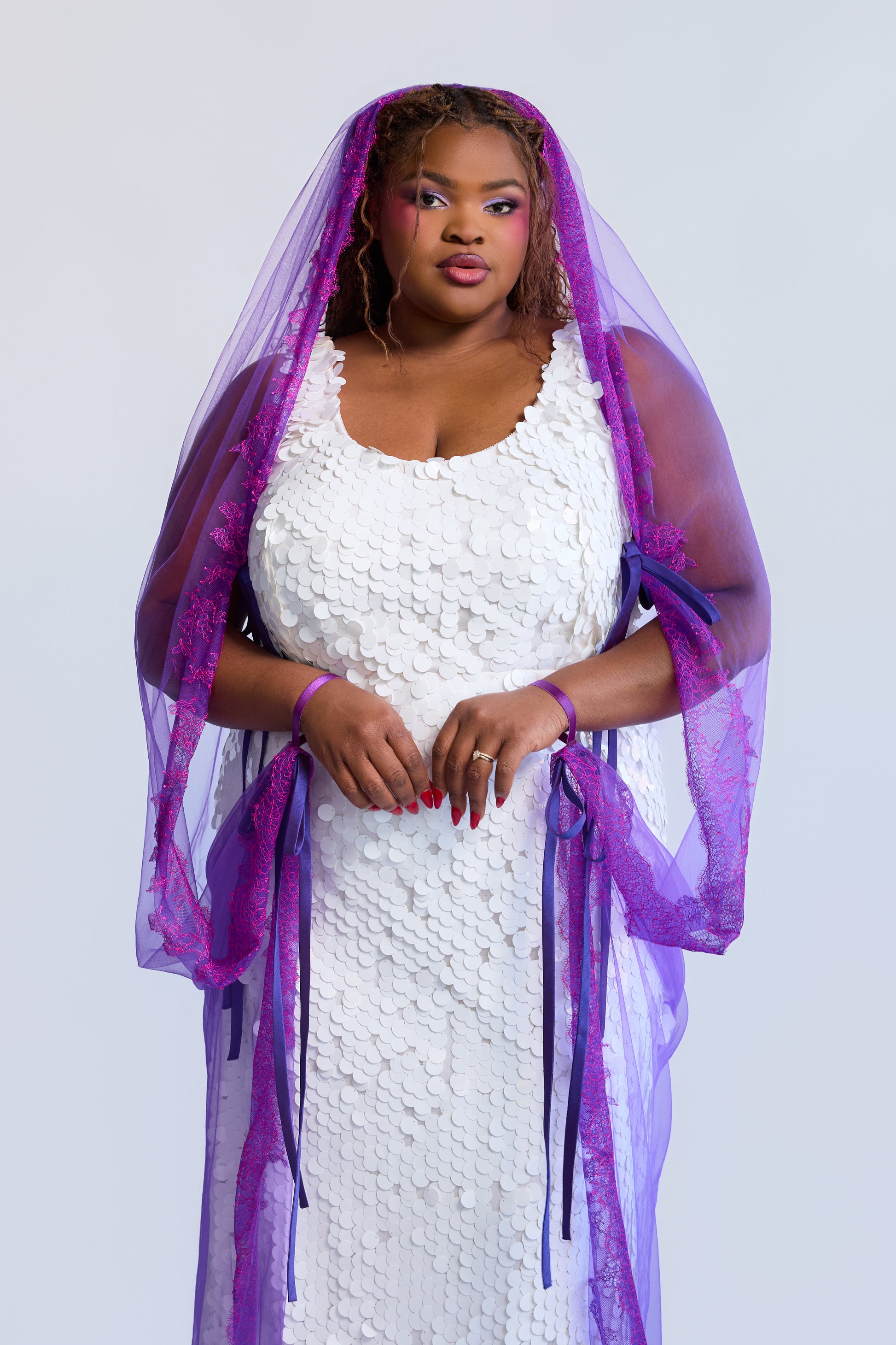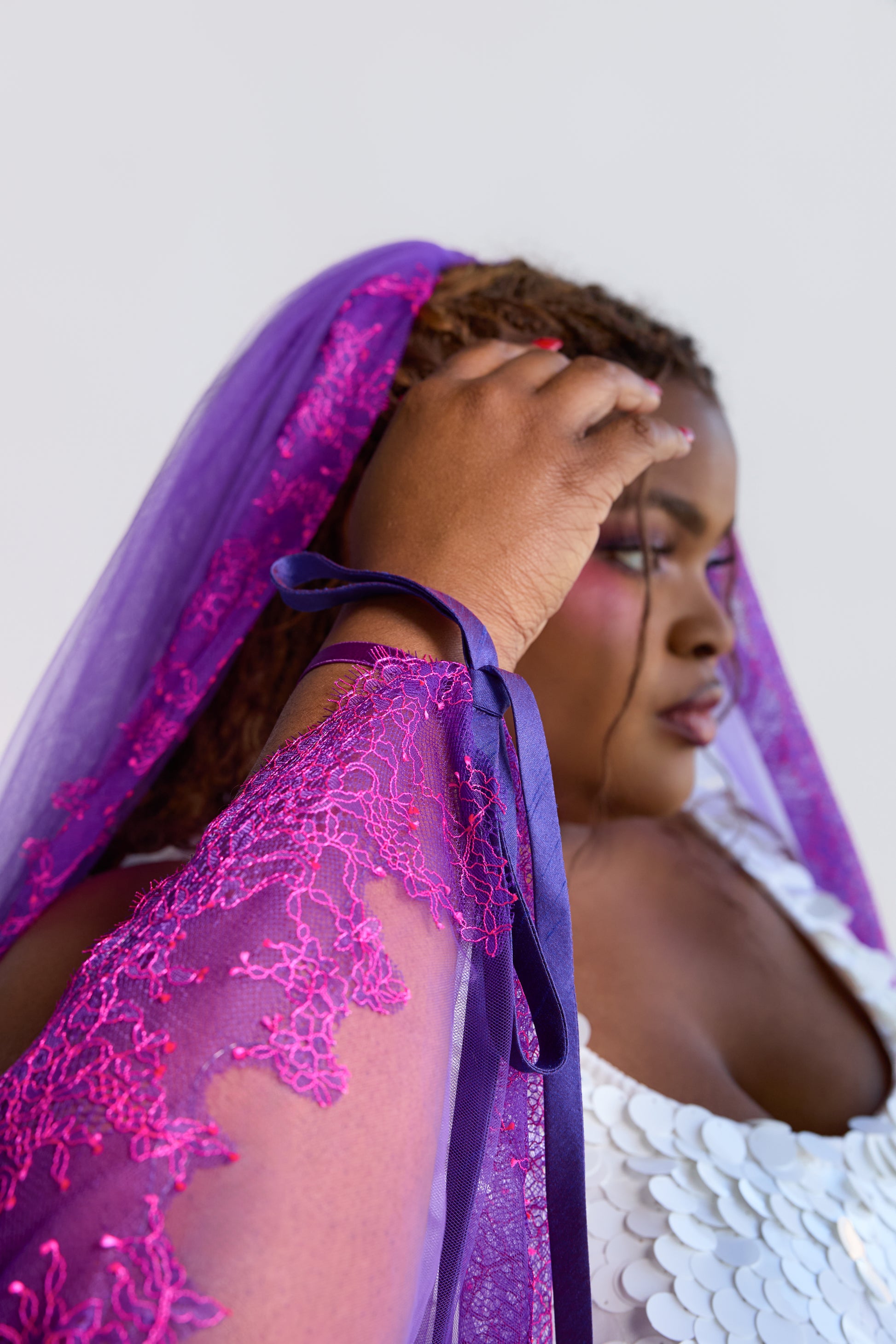 The morning glory veil is is made with a soft rich purple tulle. A fuchsia and purple scalloped lace trim boards the edges of the entire veil, while indigo silk dupioni ribbons adorn the front of the veil. This veil has hidden little wristlets so the wearer can have the veil slightly shorten with a blouson look or let it cascade long behind them. This veil is inspired by the morning glory flowers Madison admired in her flower box all summer long.