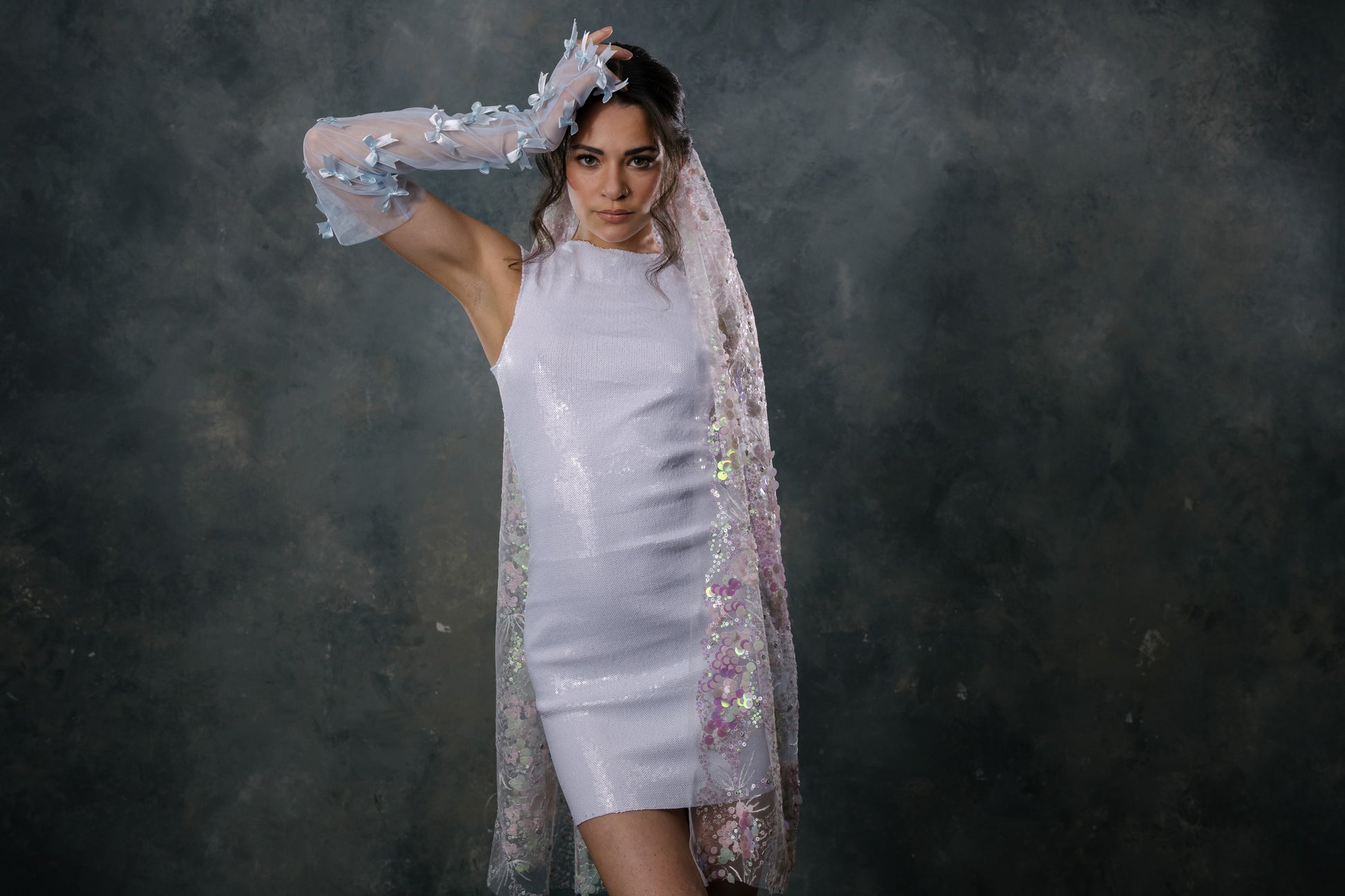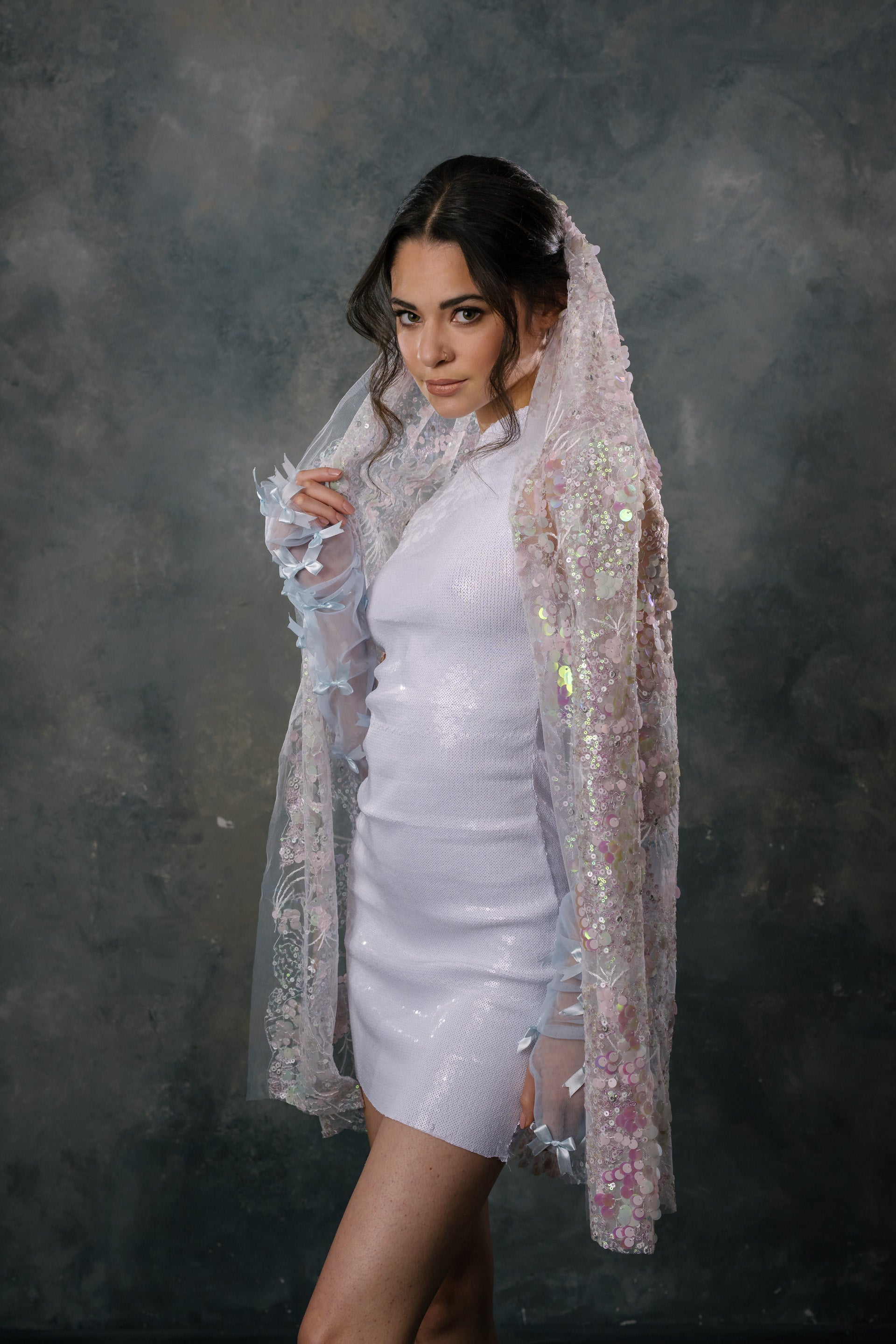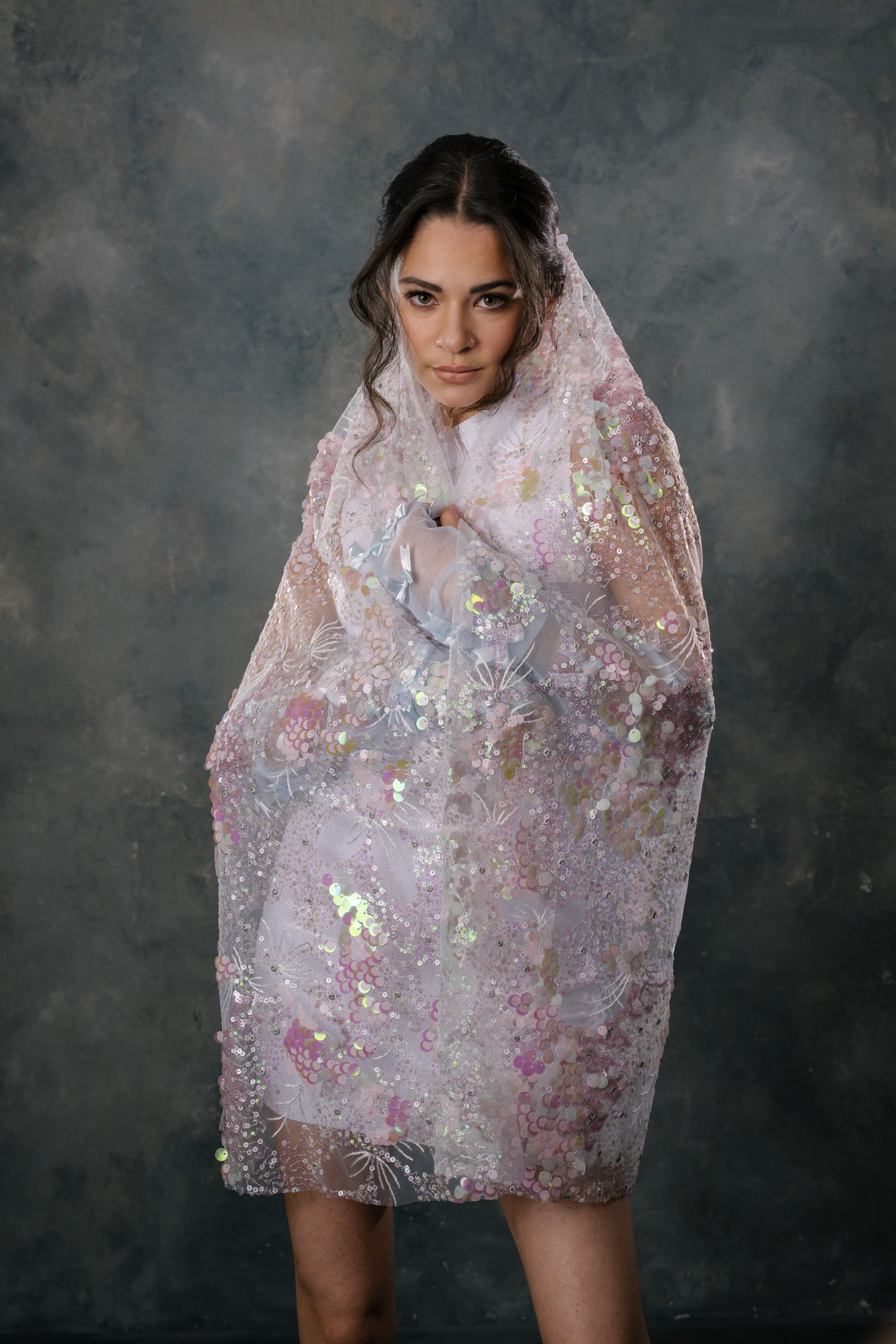 The Opal Veil is a beautiful combo of traditional and non-traditional. It is a white light weight fabric with beautiful pink and soft blue iridescent sequins. It is the perfect touch of sparkle for your wedding look. All veils are made-to-order, please allow 1-2 months after placing your order. We can wait to see you in this!