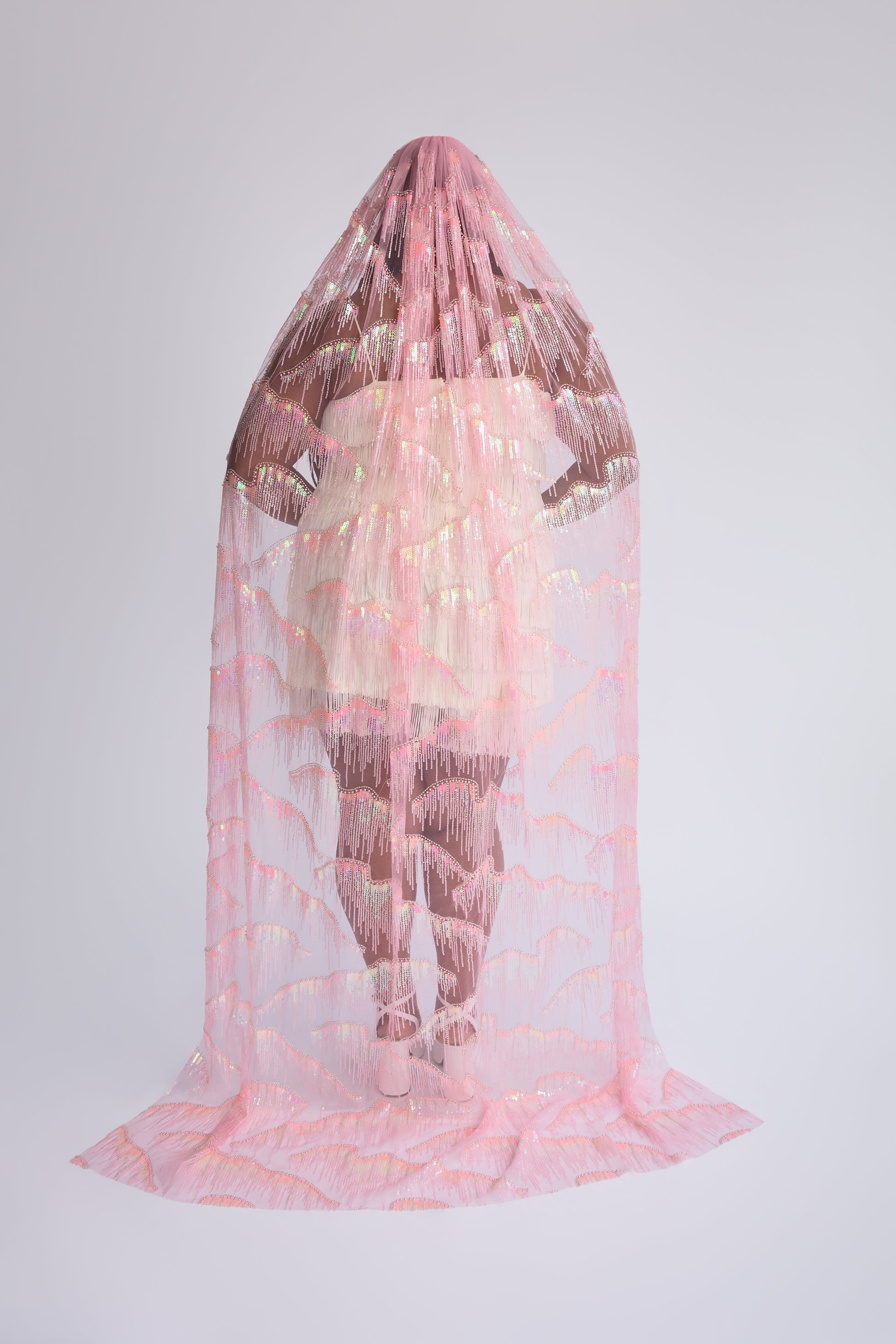 Glide through your day like you're surrounded by a soft, glowing radiance with our Aura Veil, available in pink and blue. Featuring a cloud-like motif of colorful pearls, sequins, and beads that drip delicately, this veil reflects the light and glitters with every movement. Ethereal and enchanting, it adds a touch of heavenly sparkle to your look. Available in all lengths.