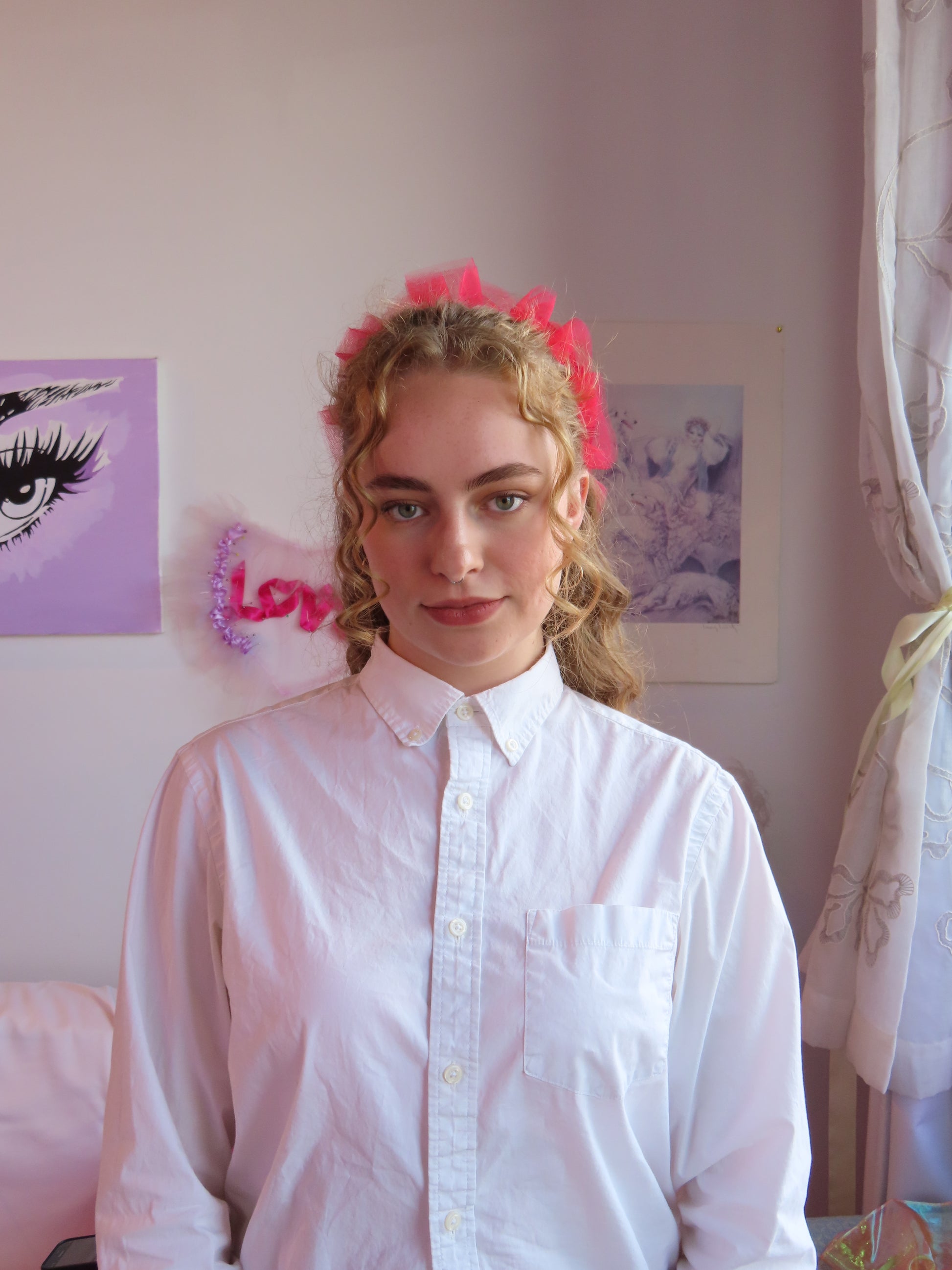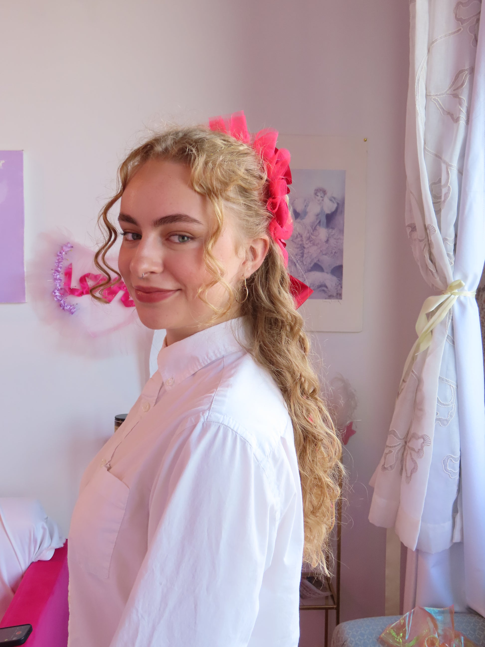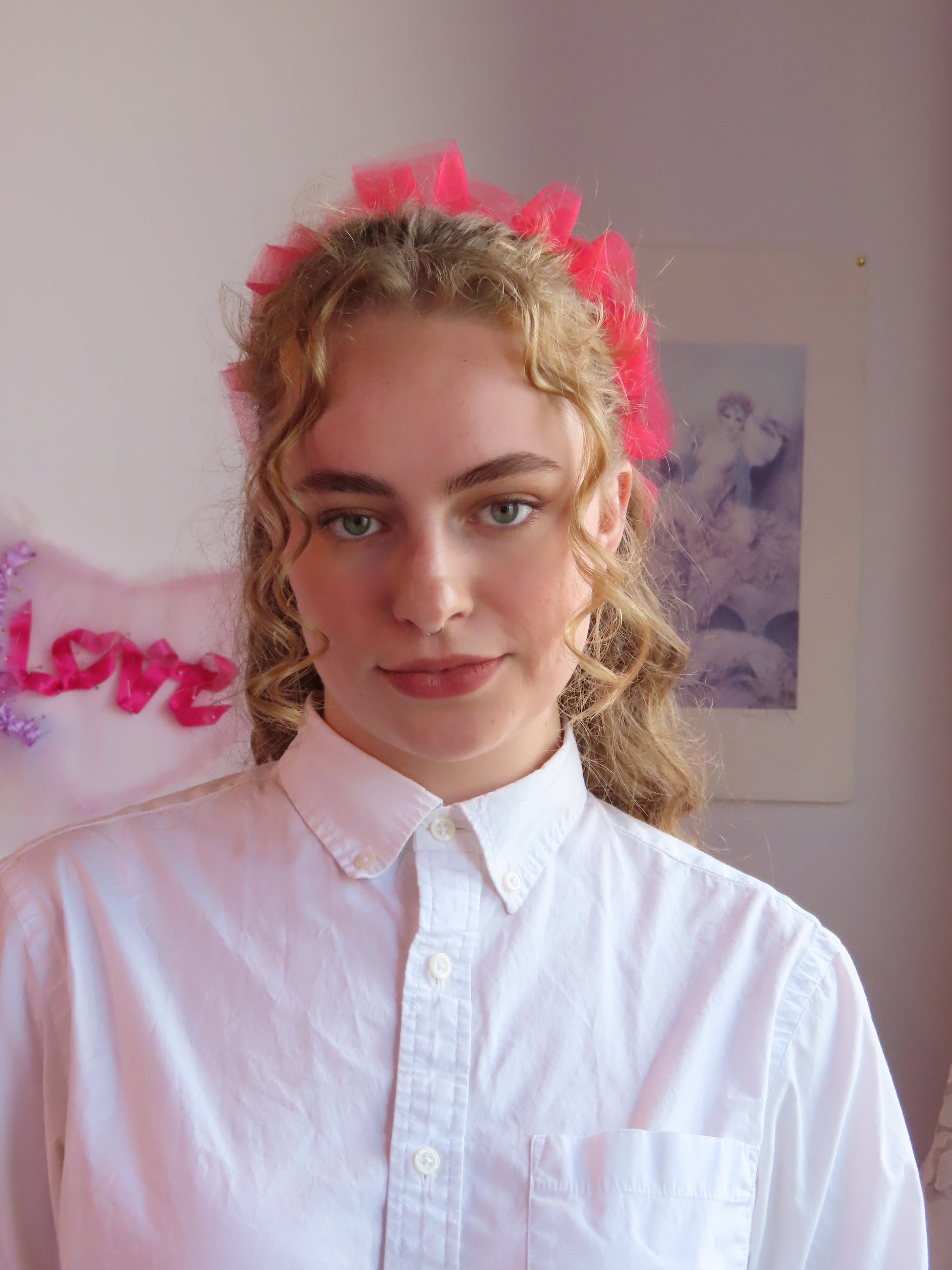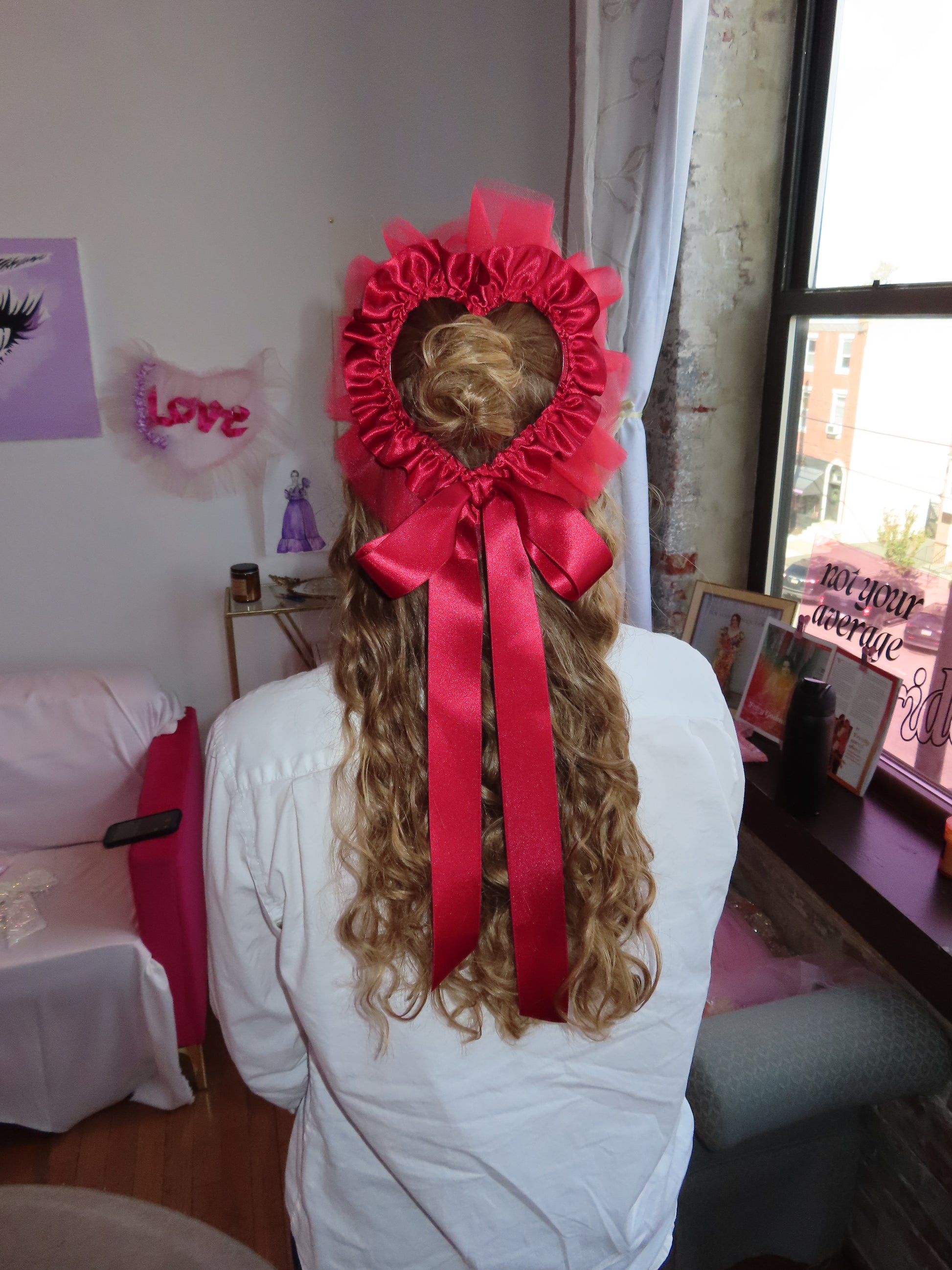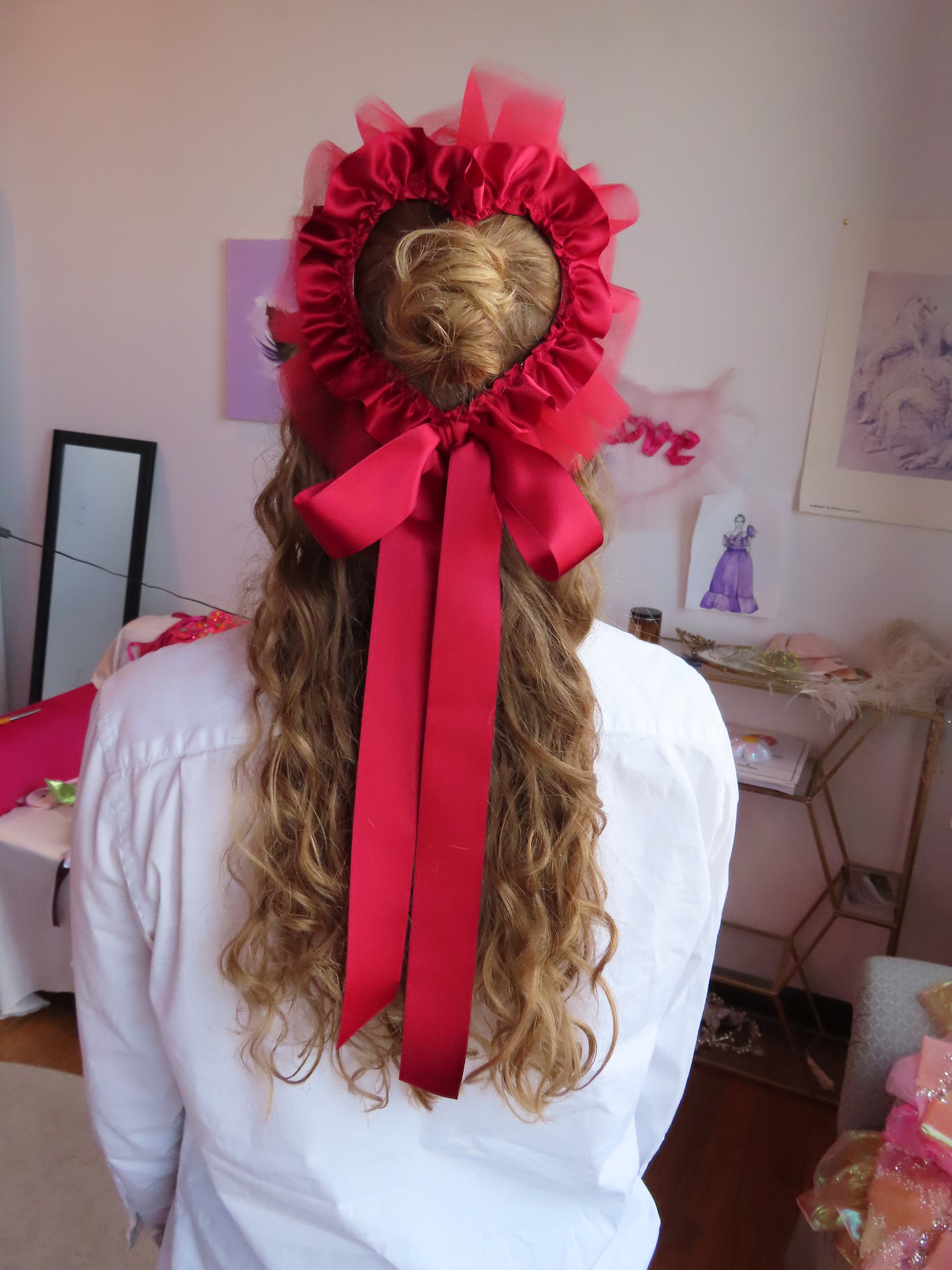 The perfect little adornment for your head and outfit! The heart halo easily clips on to your hair. Wear it around your bun, pony tail, hair down, or even pin it to your clothing! It is super light weight, and gives you the perfect little ruffle halo from the front. We hope you love your halo! Handmade in our studio in Philadelphia, made-to-order.