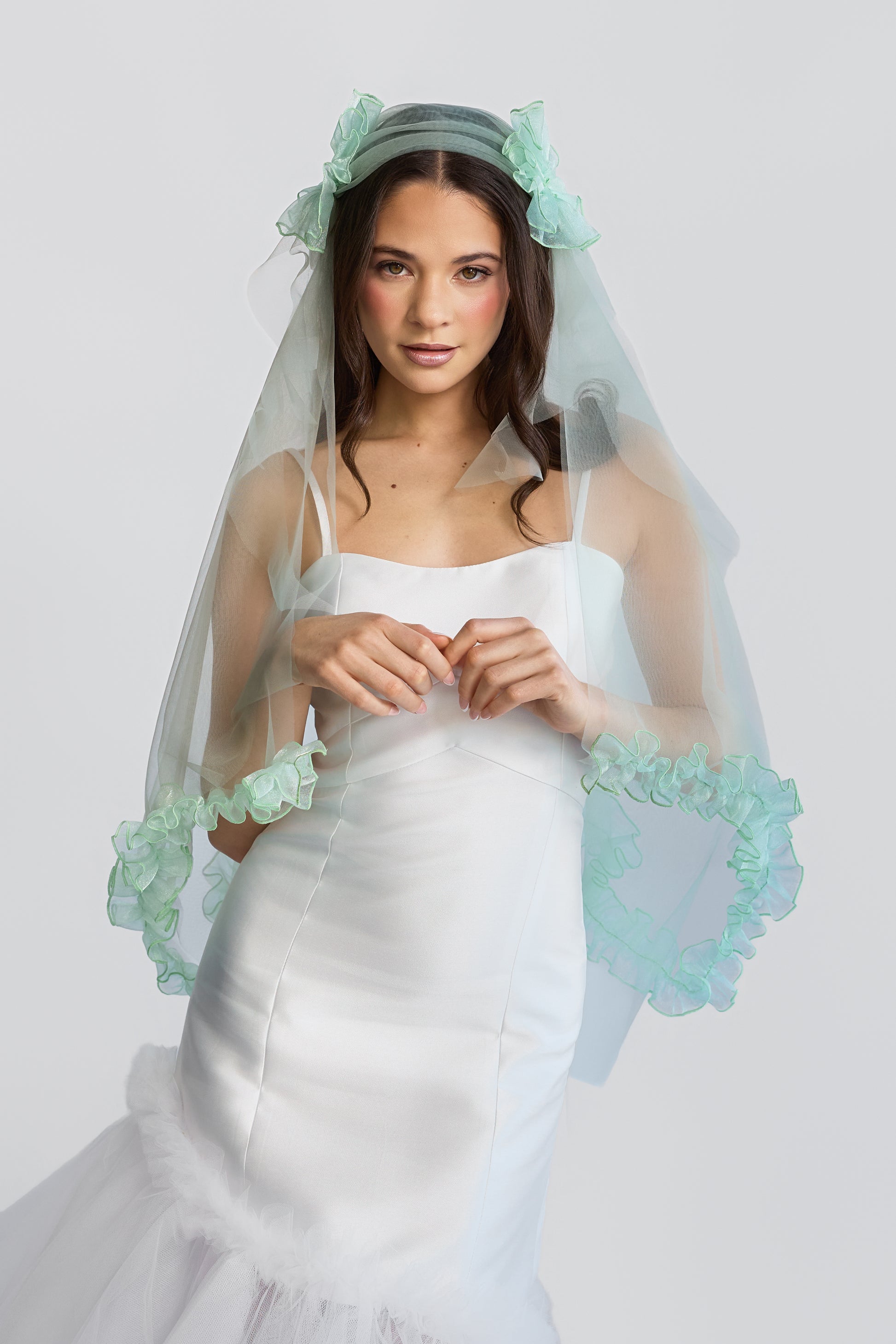 Our little mythical creature aquatic veil. The Siren Veil is a beautiful light sage green with pops of shimmering pale green organza in the ruffles. It fits has a true Juliet cap with little hidden adjustable clips on each side of the head section of the veil.