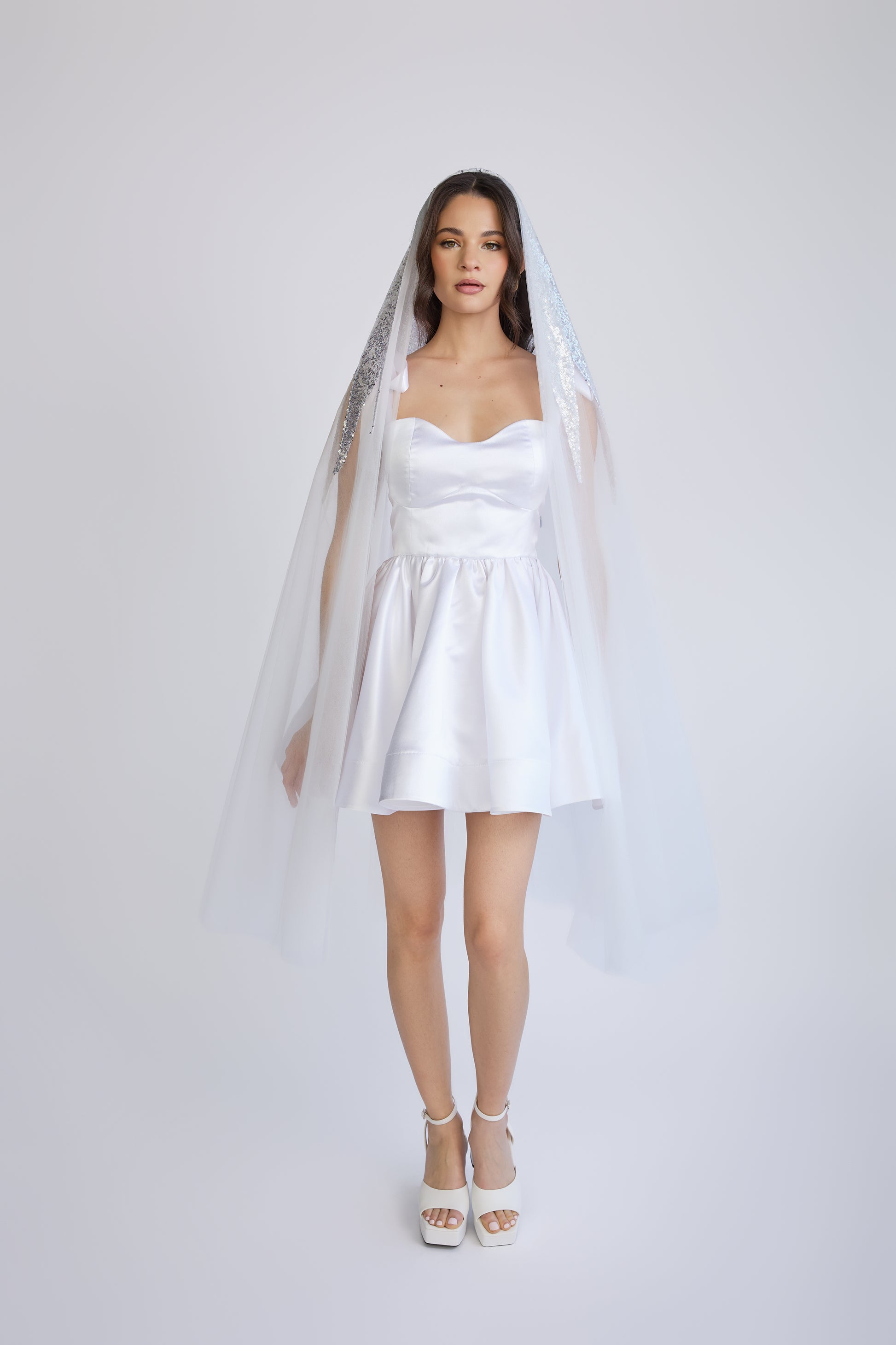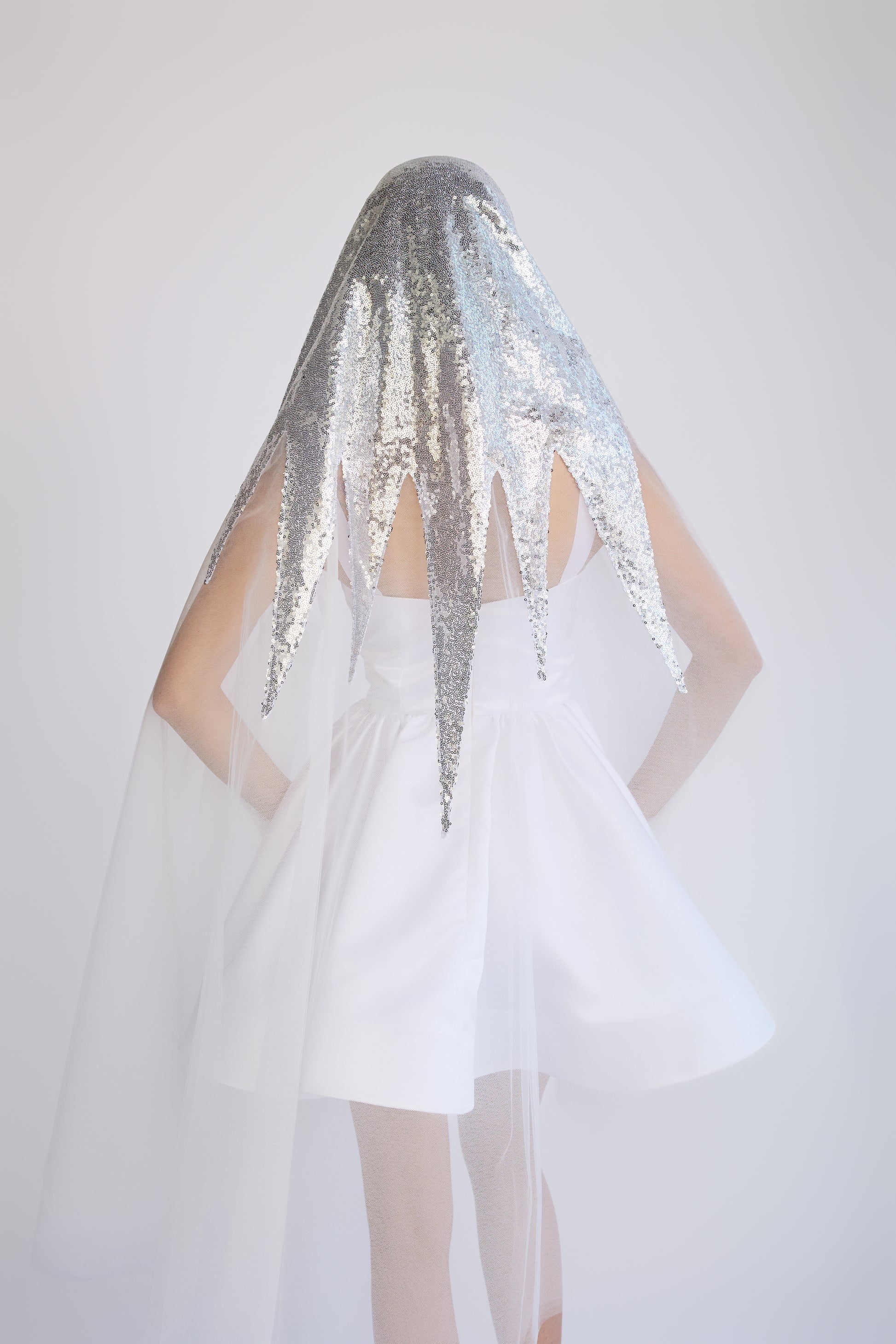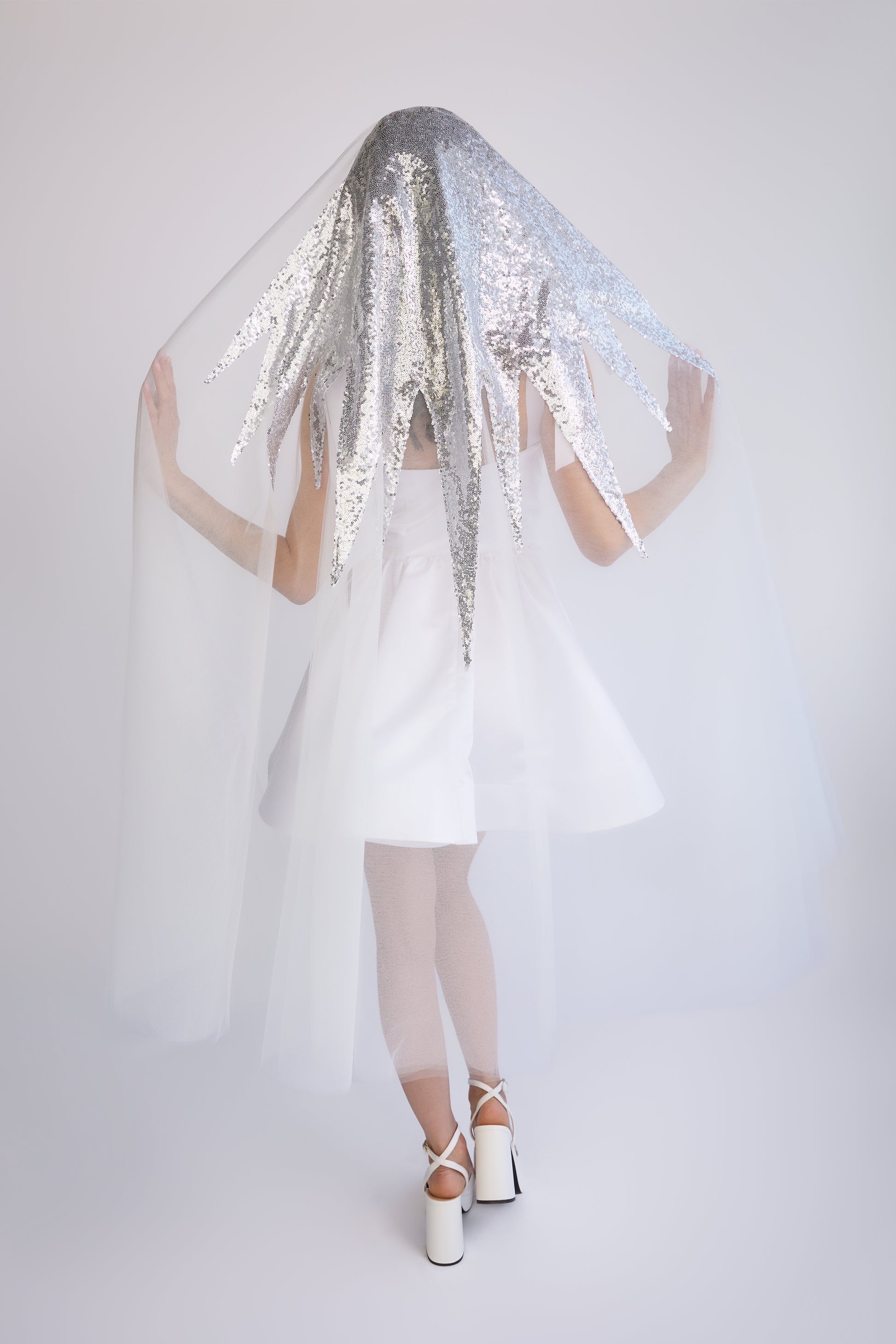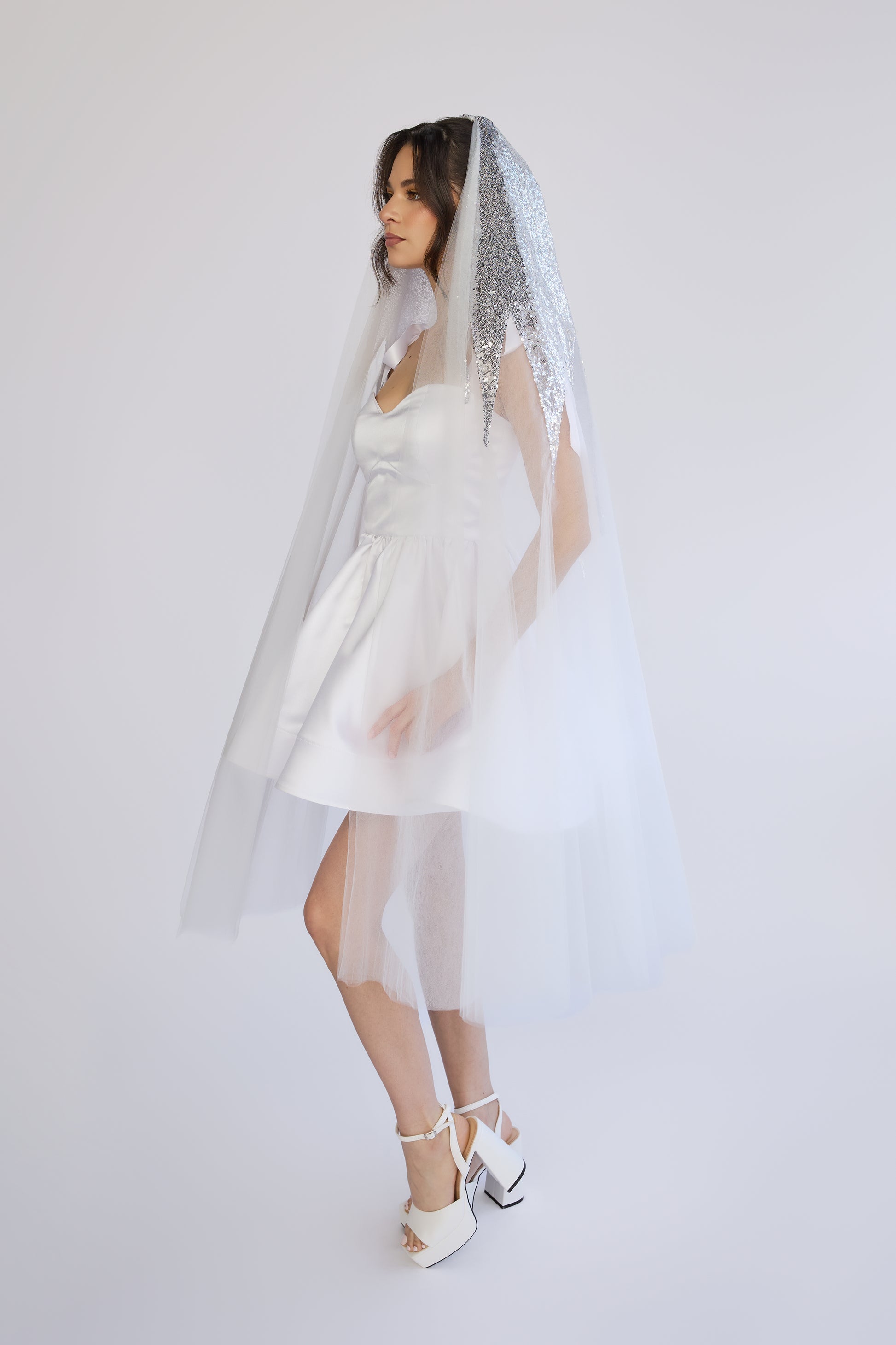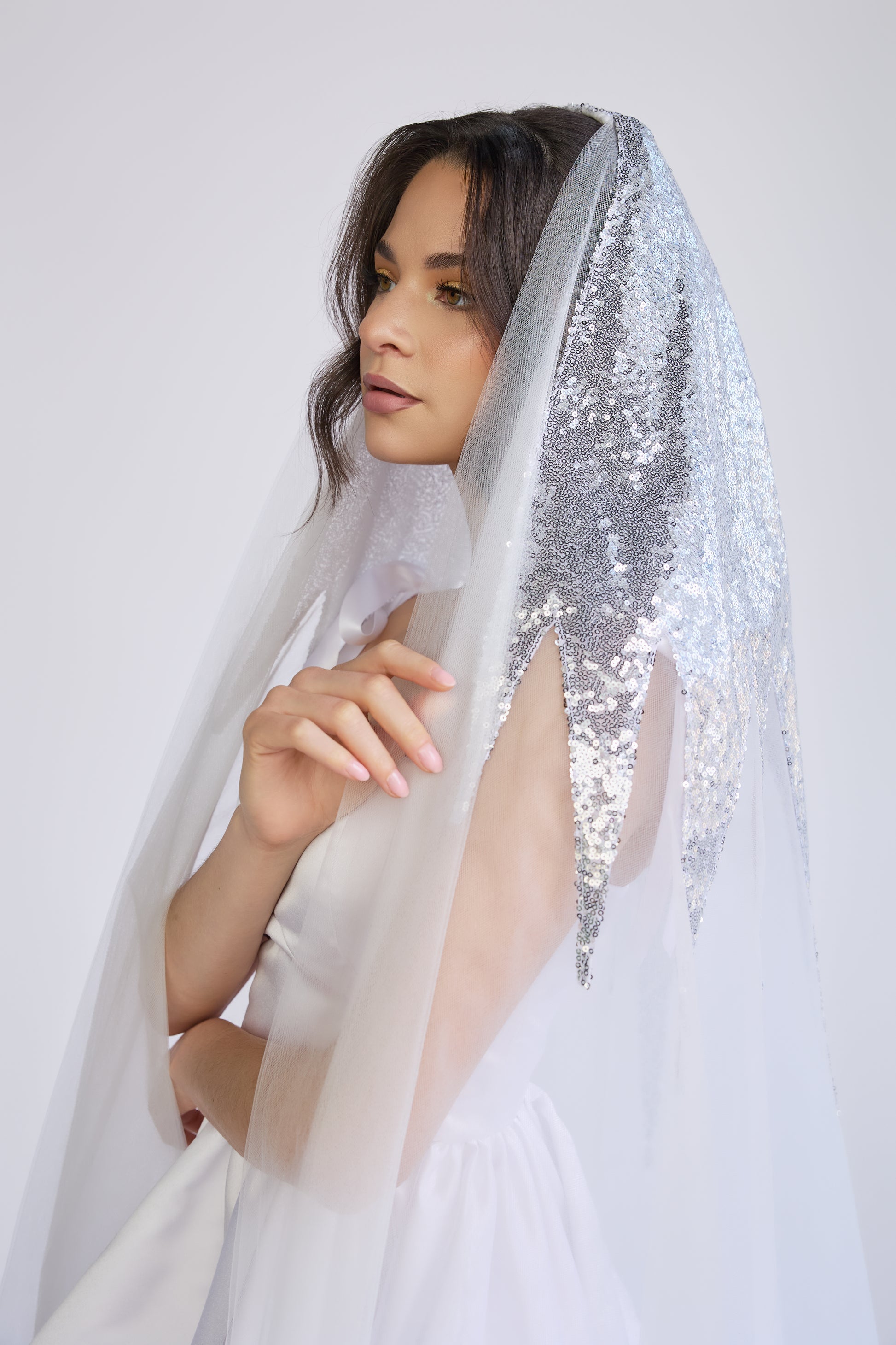 Shine like the star you are with our Starlit Veil! Featuring a stunning burst of silver twinkling sequins against soft, flowing white tulle, this show-stopping veil blends sparkle and softness perfectly. Ideal for anyone who wants to feel celestial on their wedding day, it comes in elbow to ballet length, with custom color and length options available through our inquiry form.