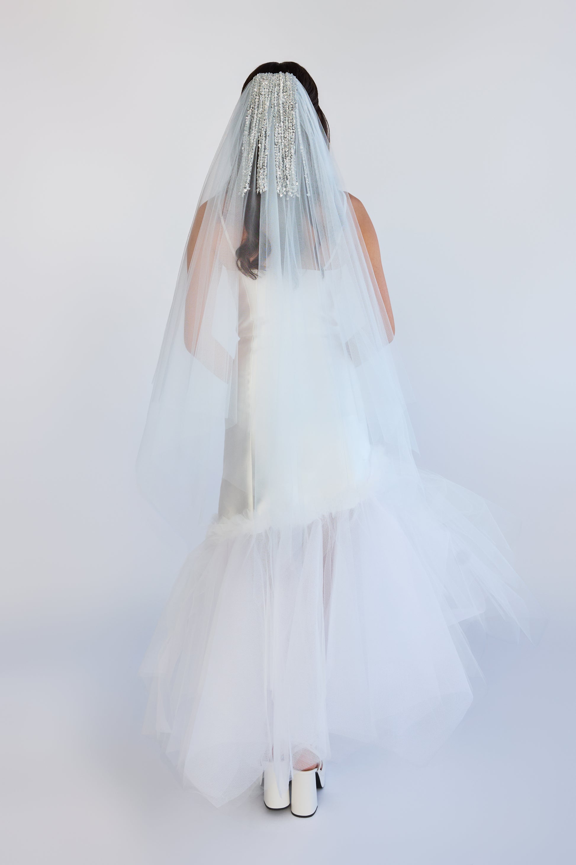 The Dew Drop Veils are the perfect whimsical touch to your wedding attire. They have a fluid irregular hemline with beaded fringe at the top of each veil. This color is a soft whisper blue, almost white.
